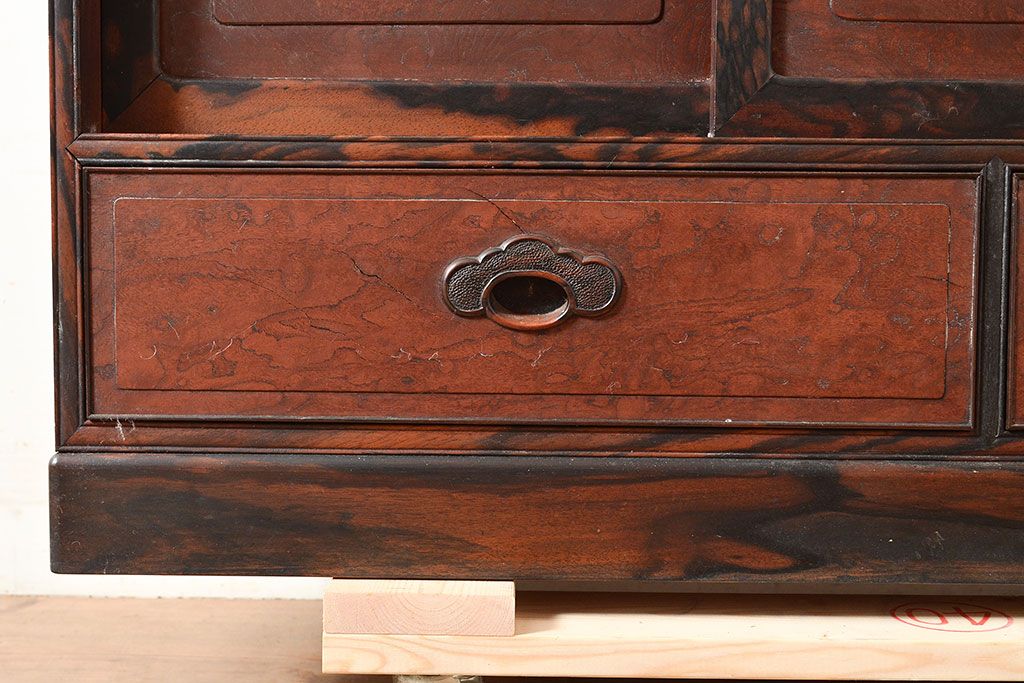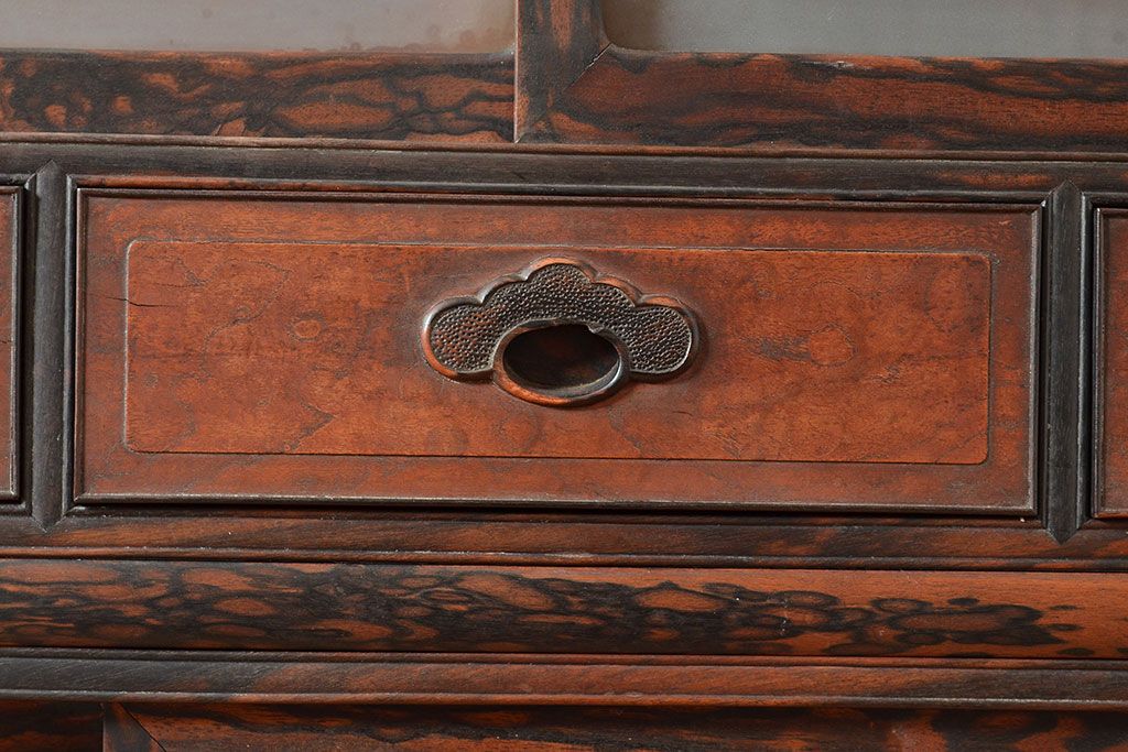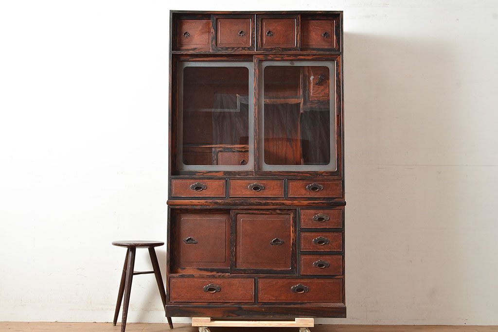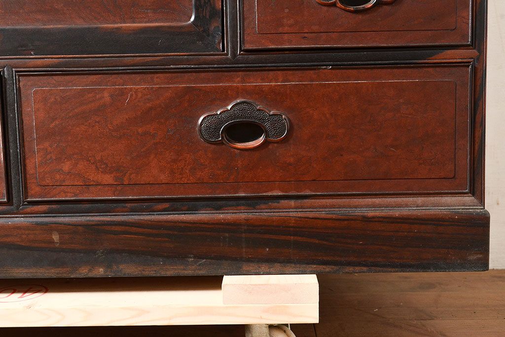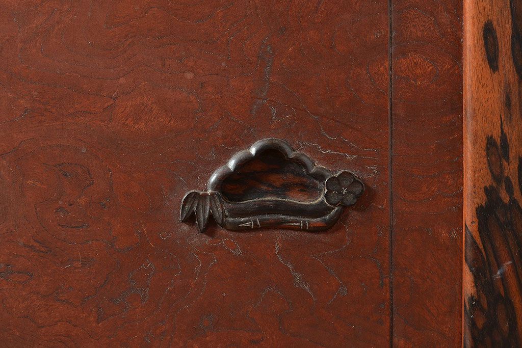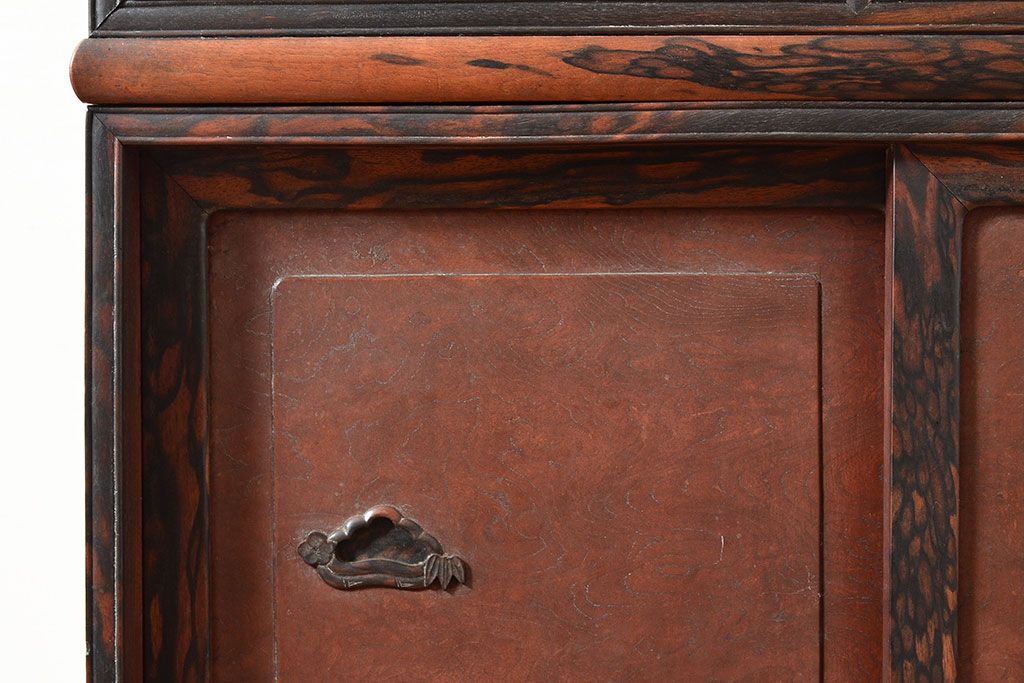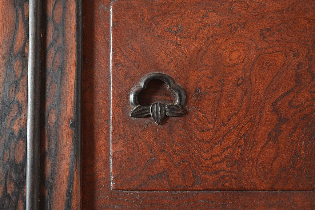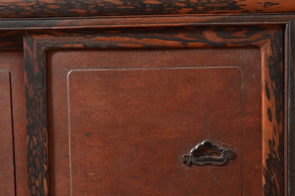 ラフジュ工房> 和箪笥> 茶箪笥・茶棚 > 和製アンティーク 最高級品の工芸家具!欅(ケヤキ)材の玉杢と黒柿材のくじゃく杢が見られる、凝ったつくりの茶棚(茶箪笥、飾り棚、戸棚、キャビネット)(R-047539)