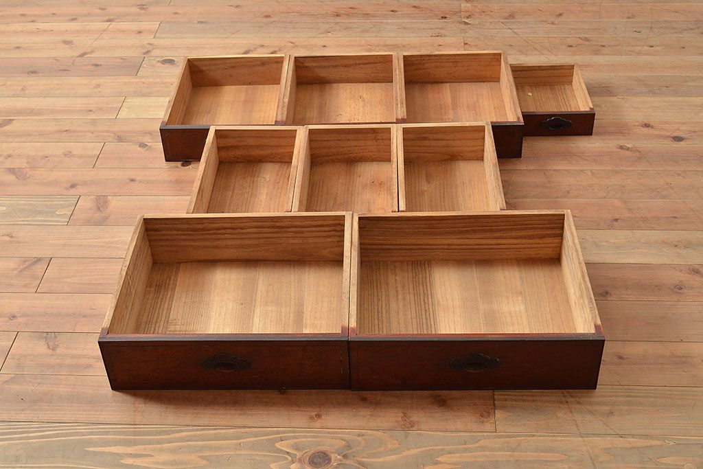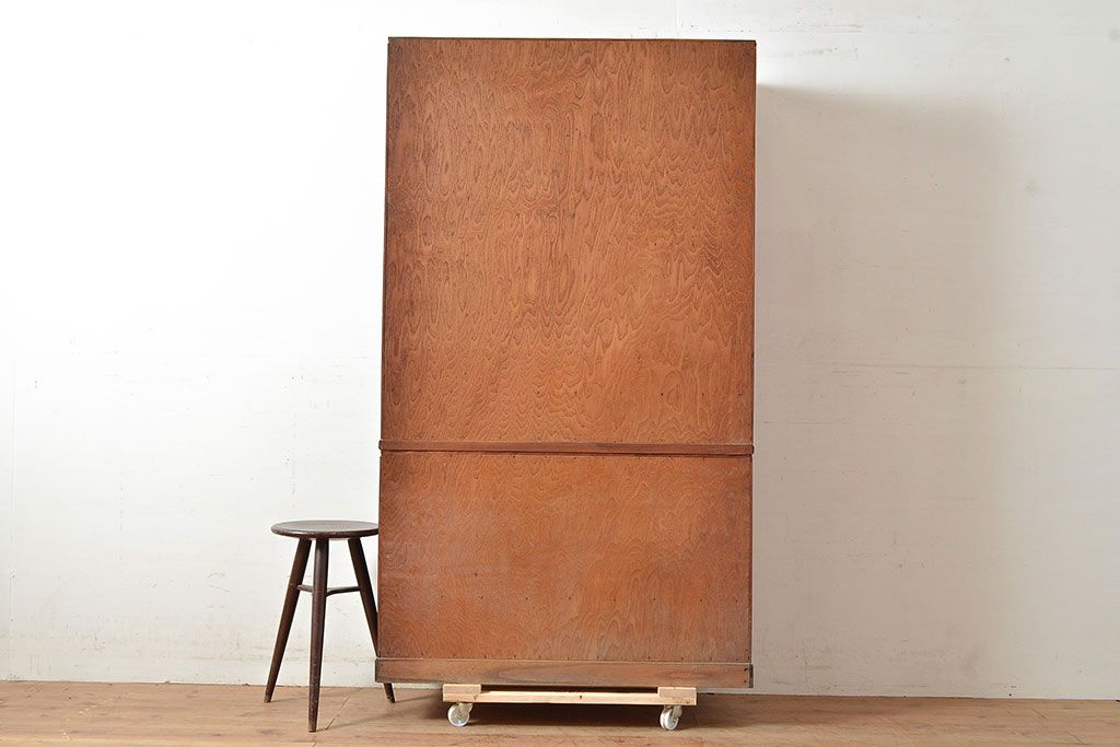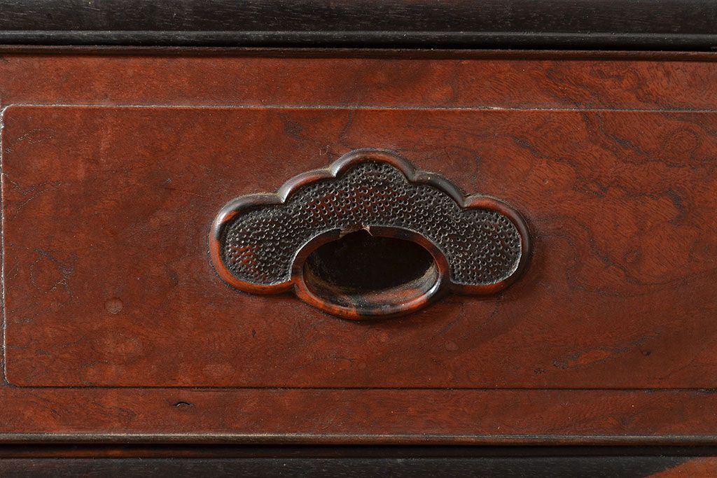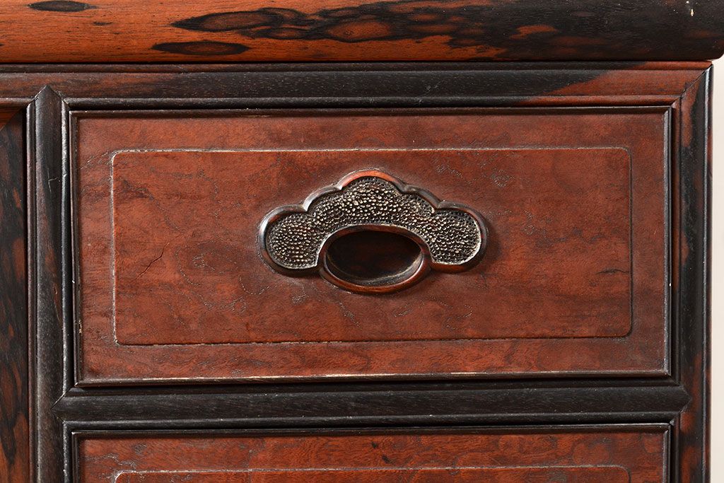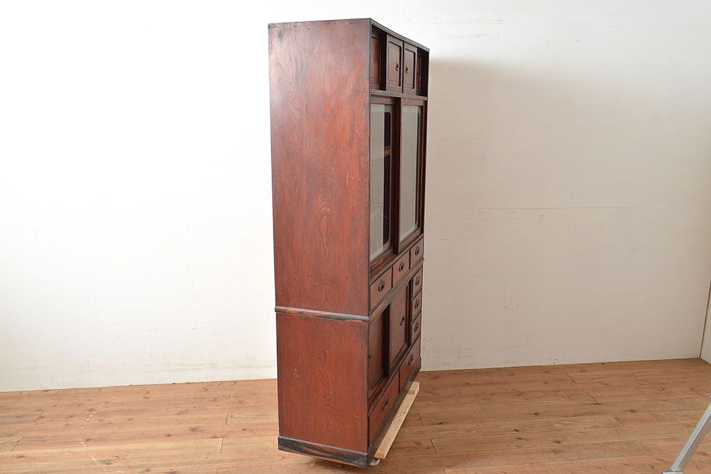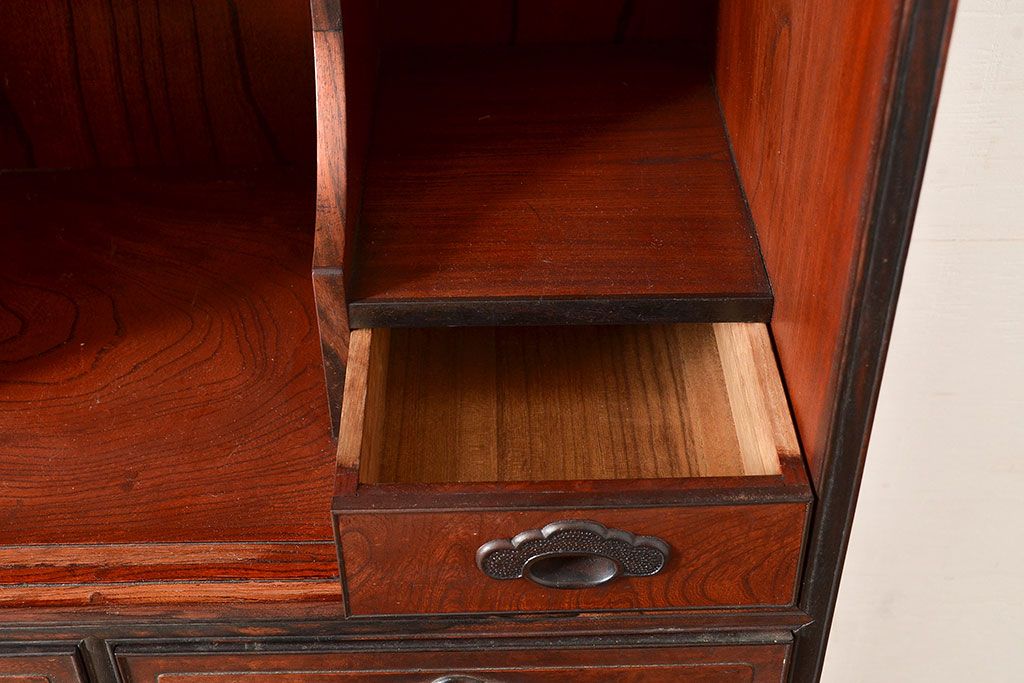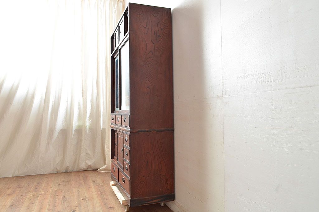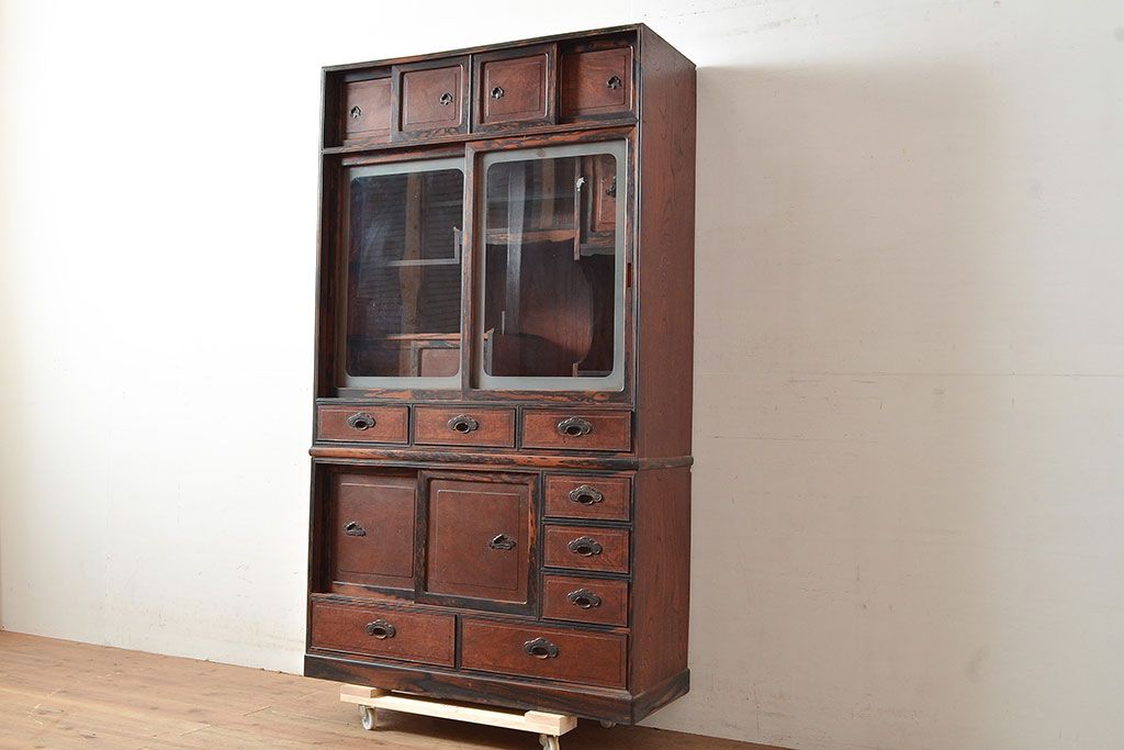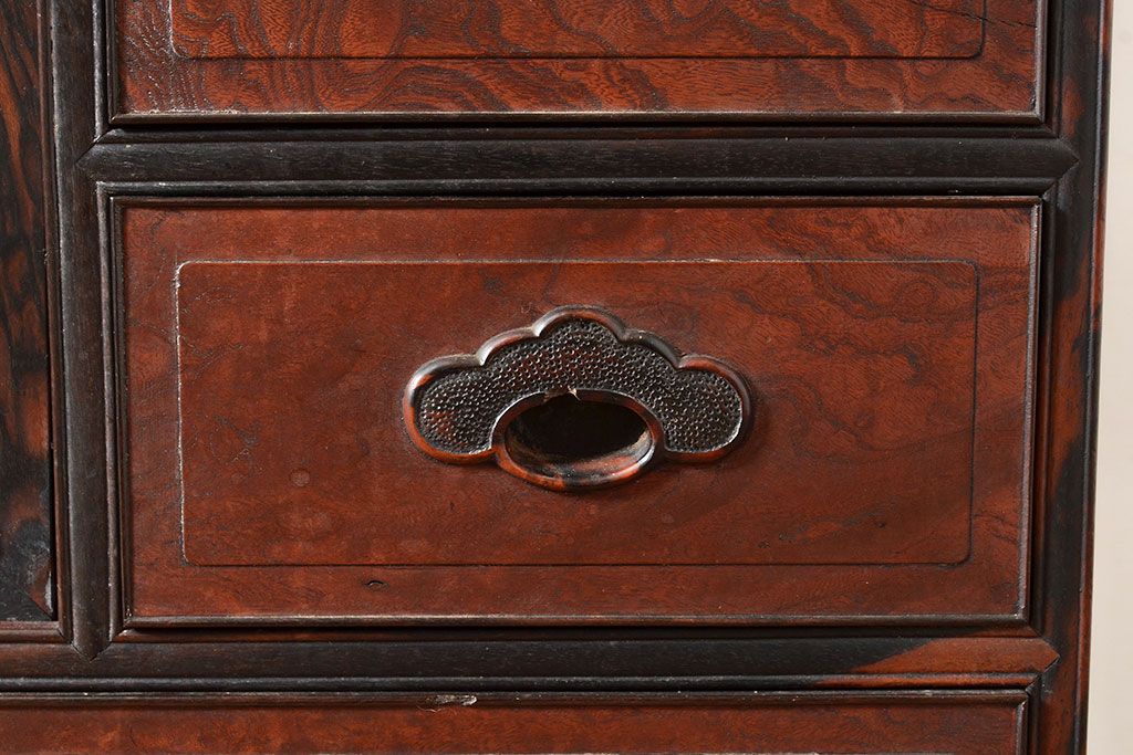 ラフジュ工房> 和箪笥> 茶箪笥・茶棚 > 和製アンティーク 最高級品の工芸家具!欅(ケヤキ)材の玉杢と黒柿材のくじゃく杢が見られる、凝ったつくりの茶棚(茶箪笥、飾り棚、戸棚、キャビネット)(R-047539)