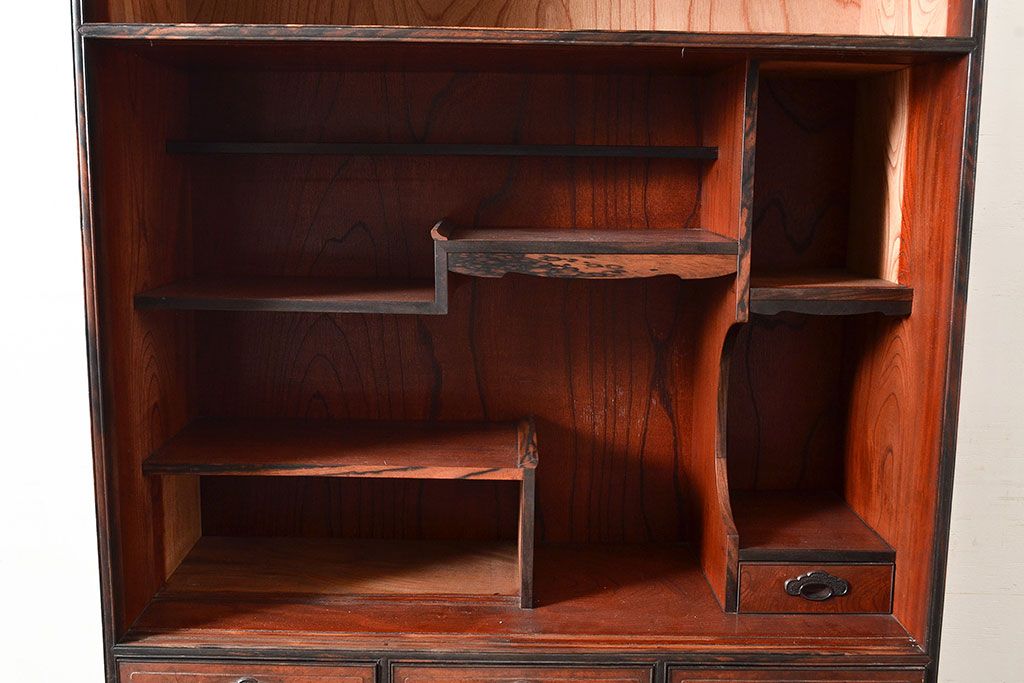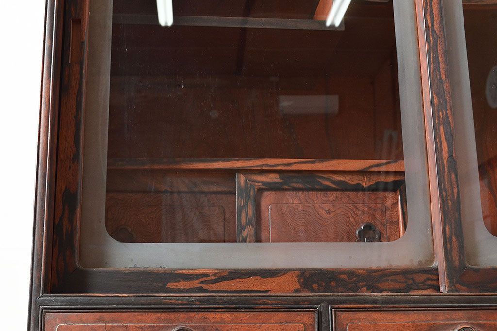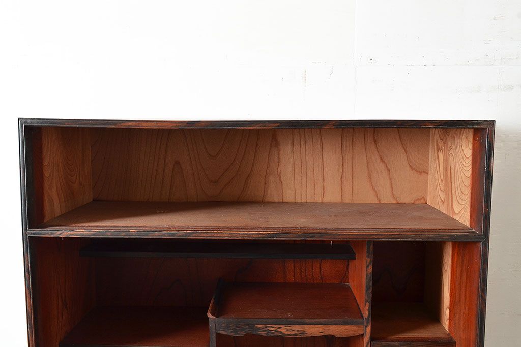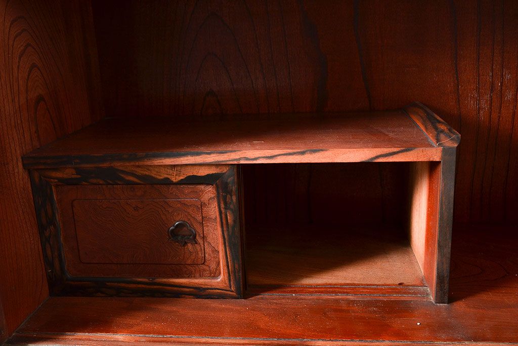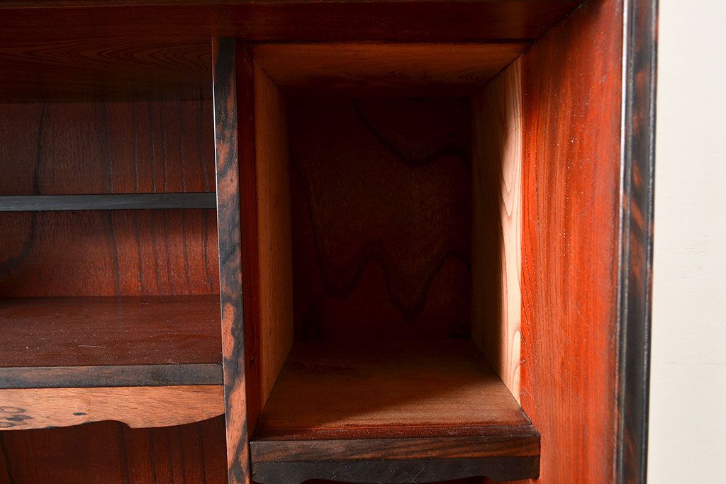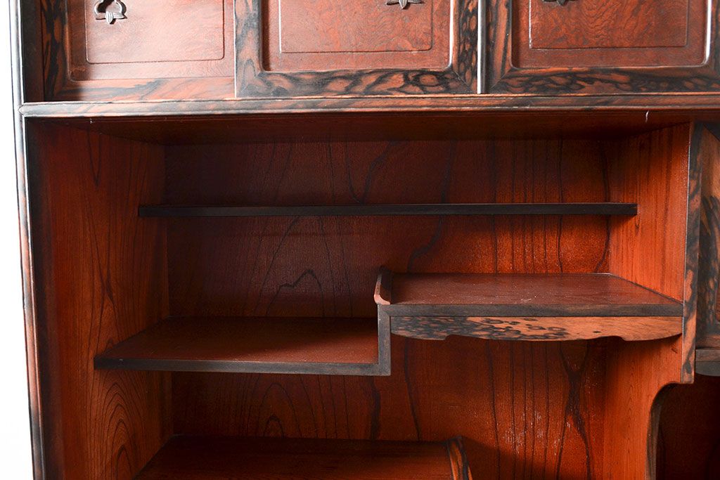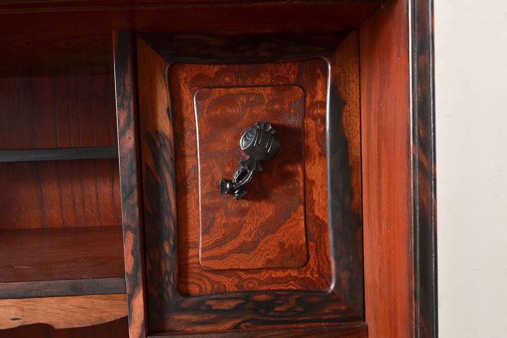 和製アンティーク 最高級品の工芸家具!欅(ケヤキ)材の玉杢と黒柿材のくじゃく杢が見られる、凝ったつくりの茶棚(茶箪笥、飾り棚、戸棚、キャビネット)(R-047539)