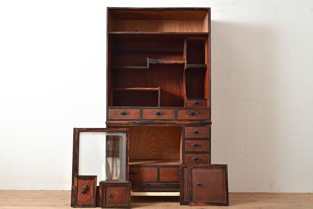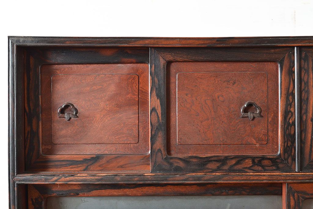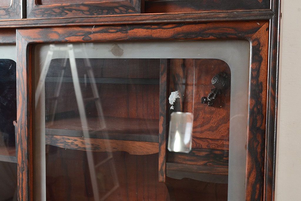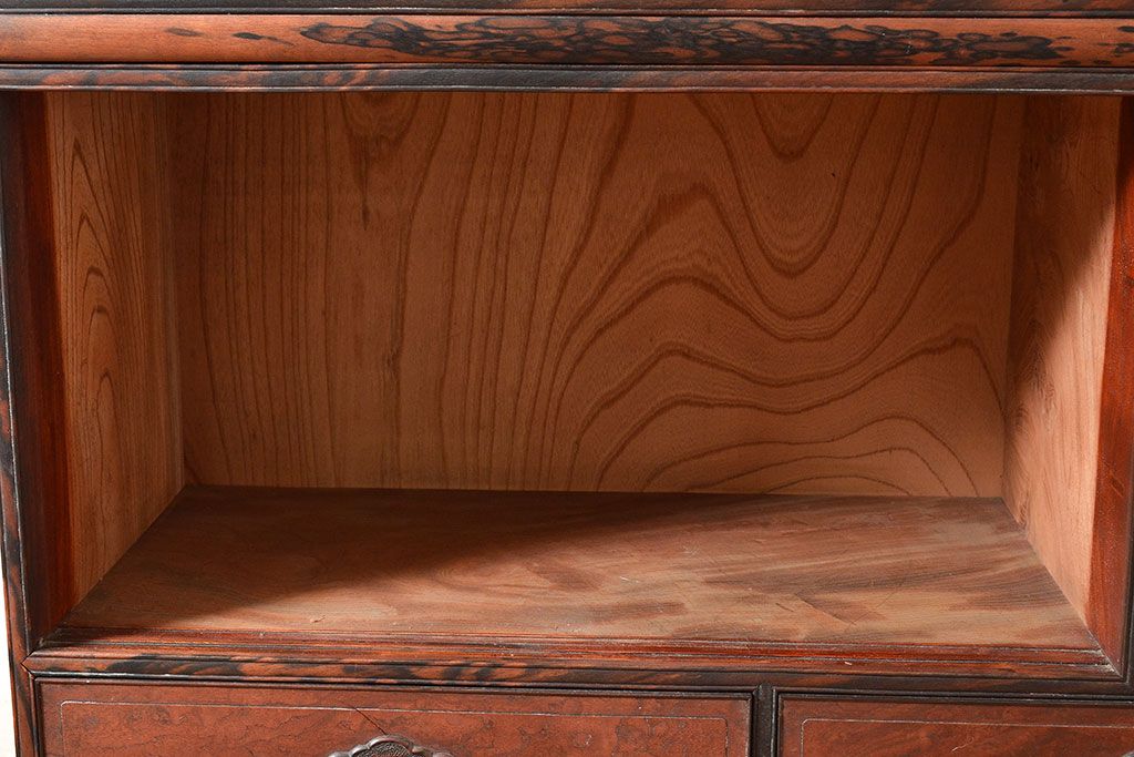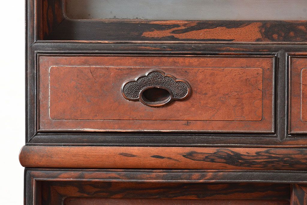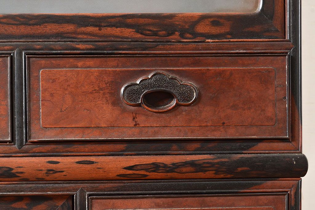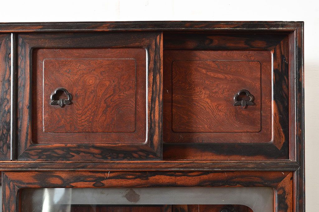 和製アンティーク 最高級品の工芸家具!欅(ケヤキ)材の玉杢と黒柿材のくじゃく杢が見られる、凝ったつくりの茶棚(茶箪笥、飾り棚、戸棚、キャビネット)(R-047539)