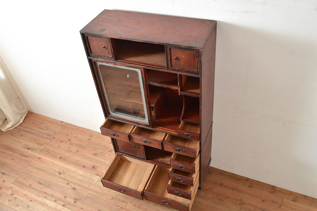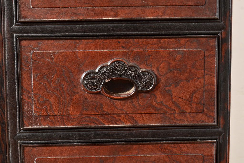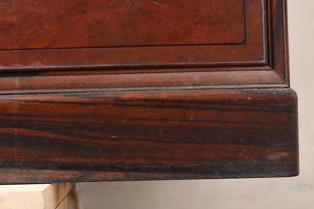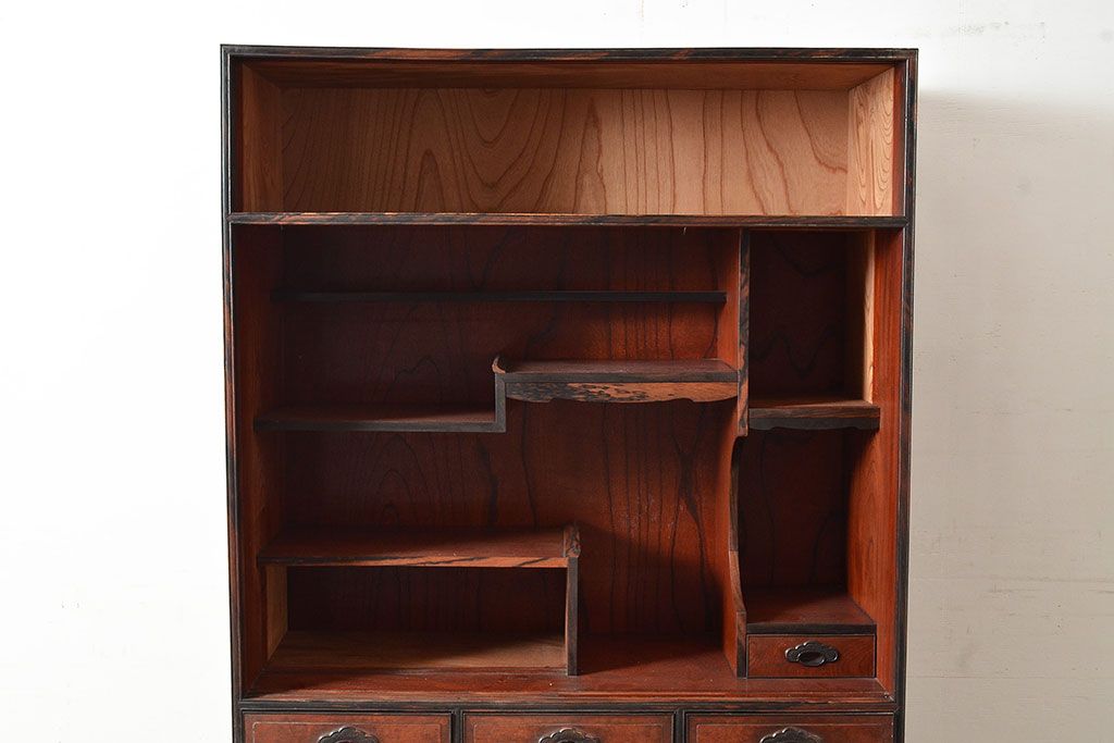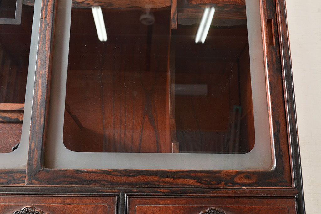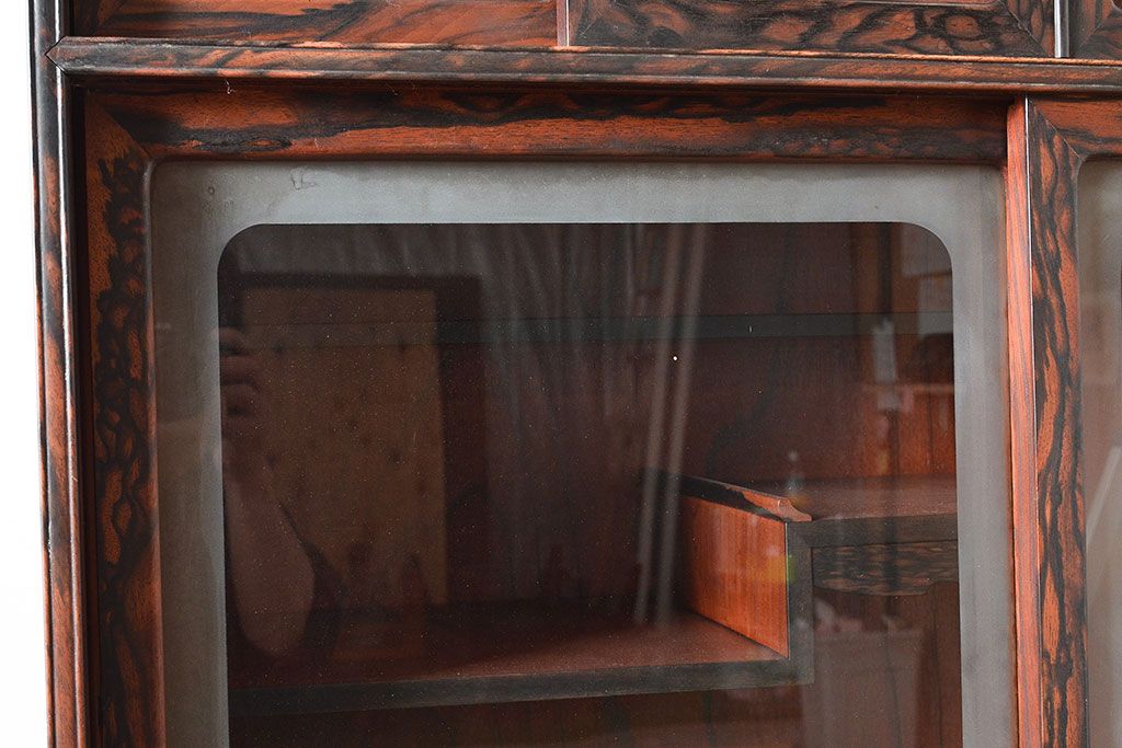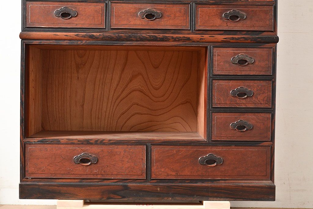 和製アンティーク 最高級品の工芸家具!欅(ケヤキ)材の玉杢と黒柿材のくじゃく杢が見られる、凝ったつくりの茶棚(茶箪笥、飾り棚、戸棚、キャビネット)(R-047539)