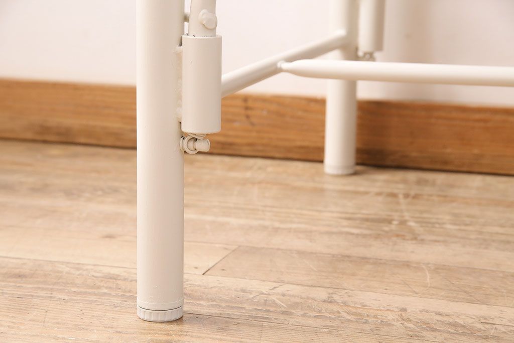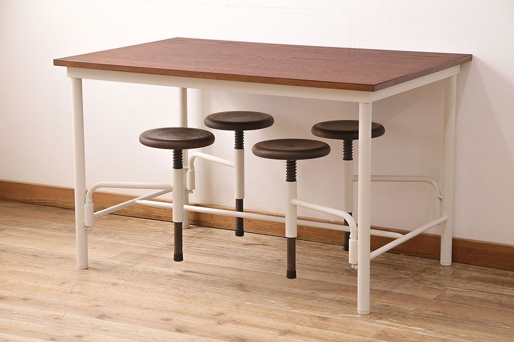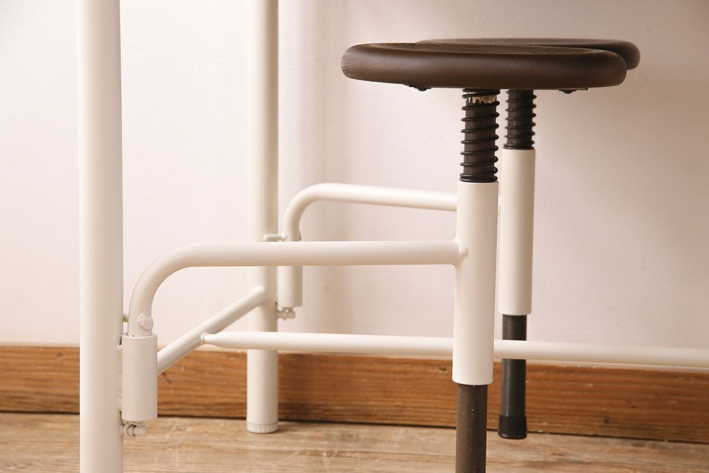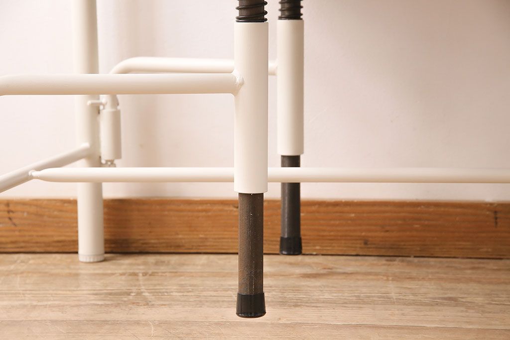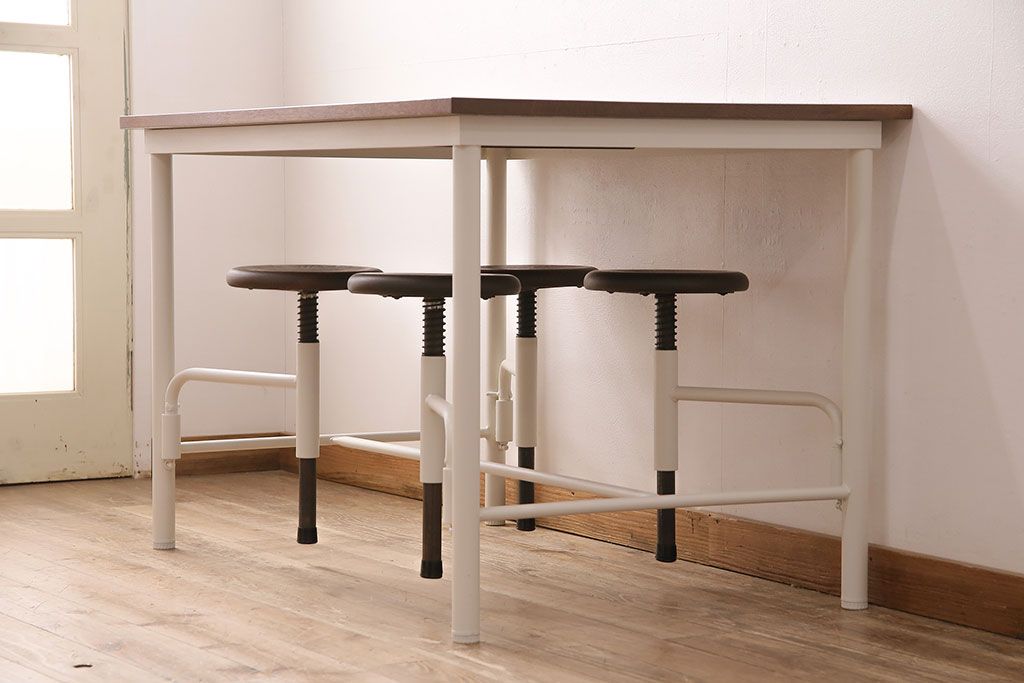 テーブル> 鉄脚テーブル > 格納スツール4脚付きテーブルをリペア&カスタム!可動部の調整を行い、アンティークホワイトのペイント仕上げ。(ダイニングテーブル、作業台、椅子)