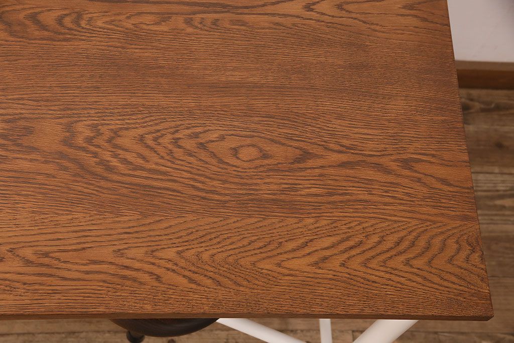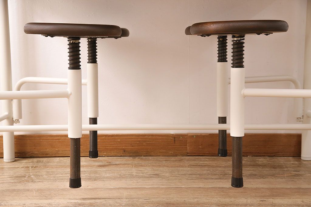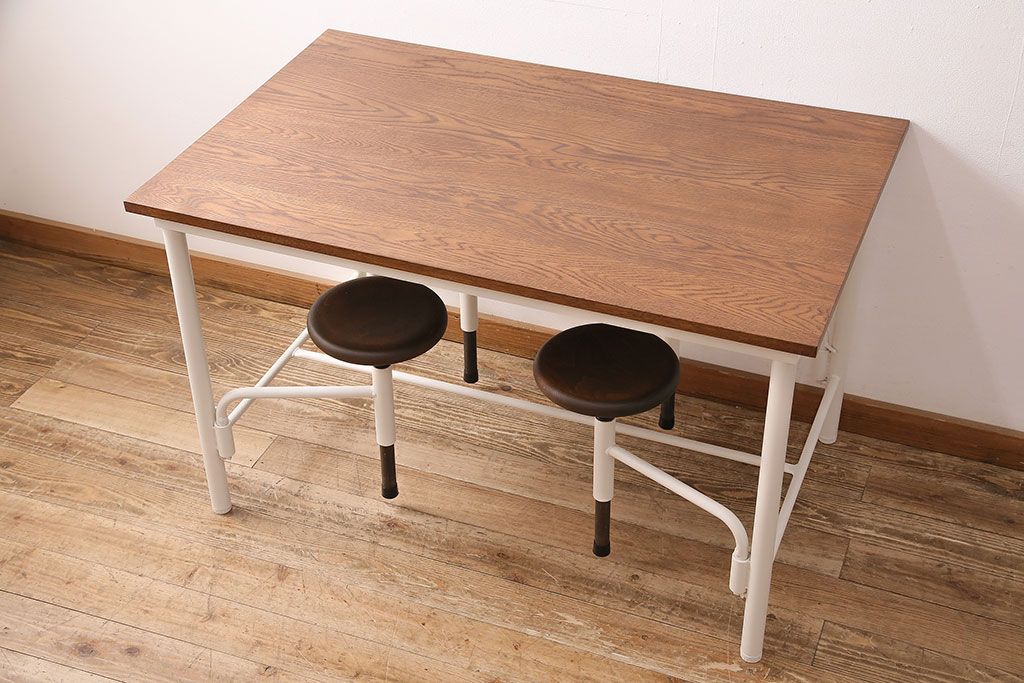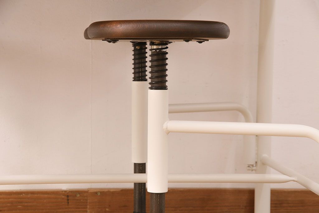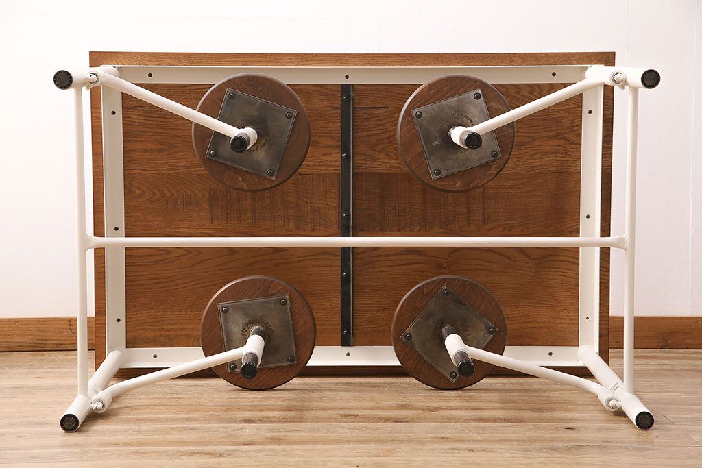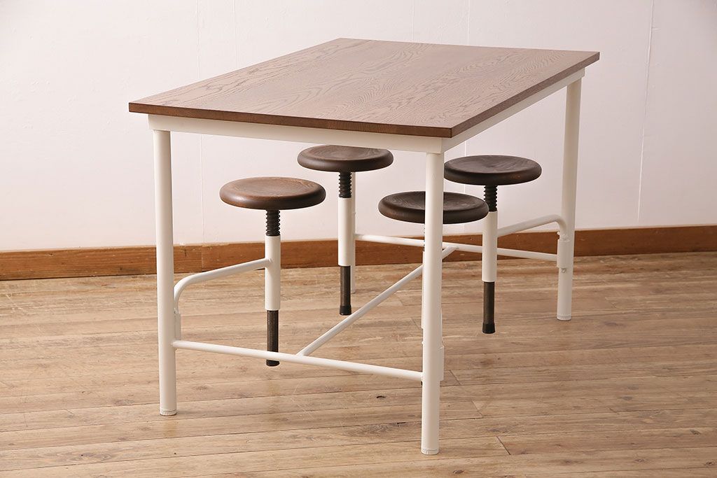 テーブル> 鉄脚テーブル > 格納スツール4脚付きテーブルをリペア&カスタム!可動部の調整を行い、アンティークホワイトのペイント仕上げ。(ダイニングテーブル、作業台、椅子)