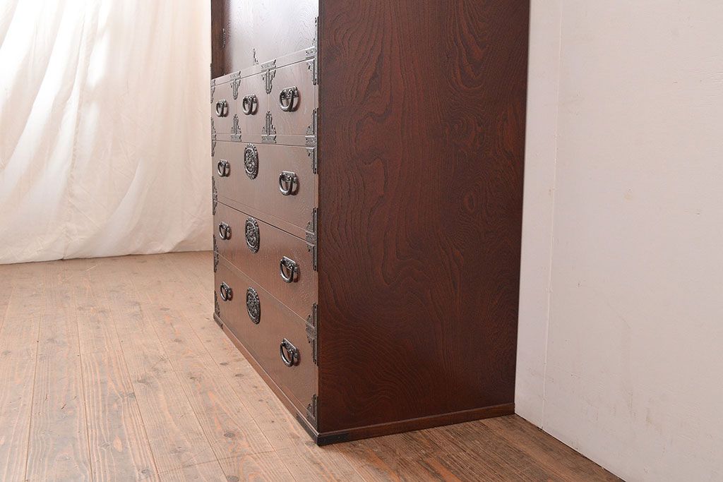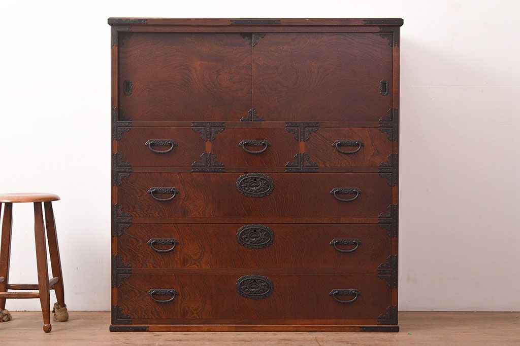 和箪笥> 衣装箪笥 > 中古 国産民芸家具!品のある佇まいが魅力的な前面欅(ケヤキ)材製の整理箪笥(衣装箪笥、収納たんす、和タンス、引き出し、チェスト)(R-047853)