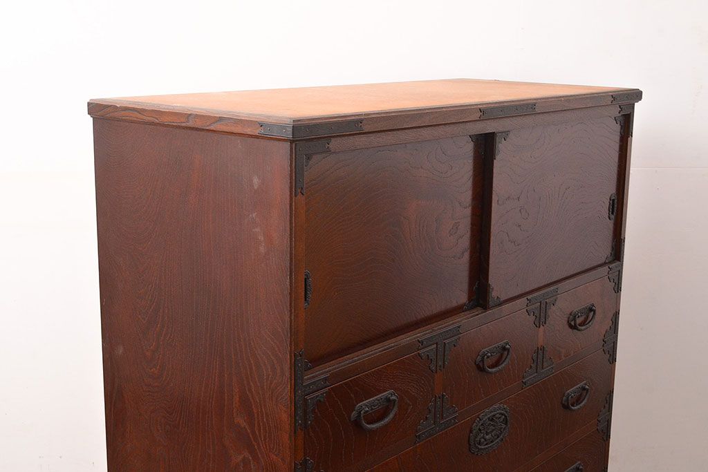 和箪笥 > 中古 国産民芸家具!品のある佇まいが魅力的な前面欅(ケヤキ)材製の整理箪笥(衣装箪笥、収納たんす、和タンス、引き出し、チェスト)(R-047853)