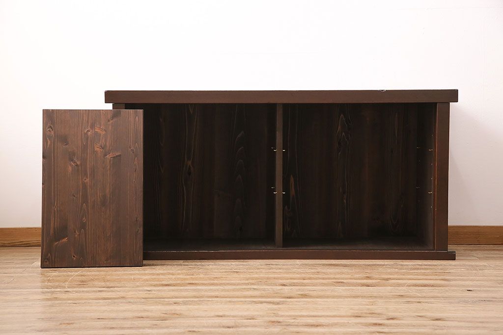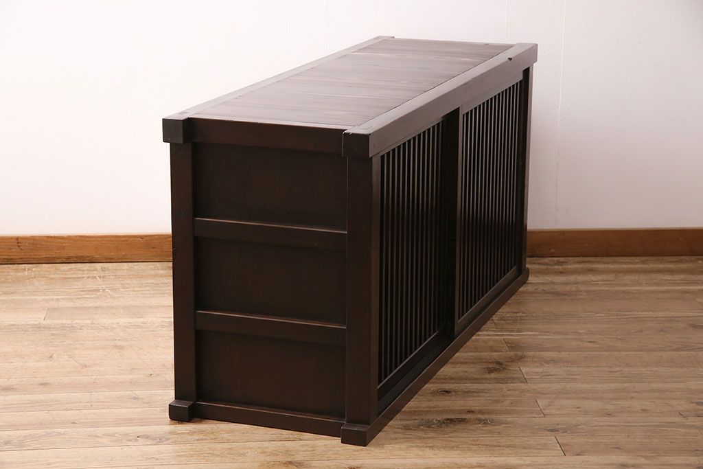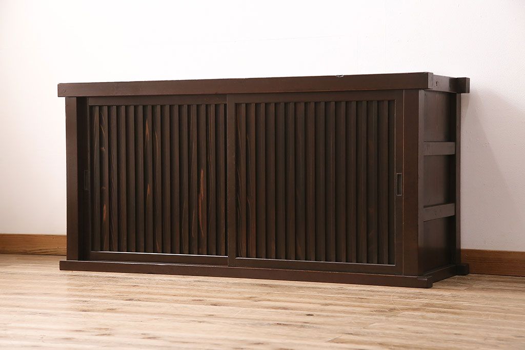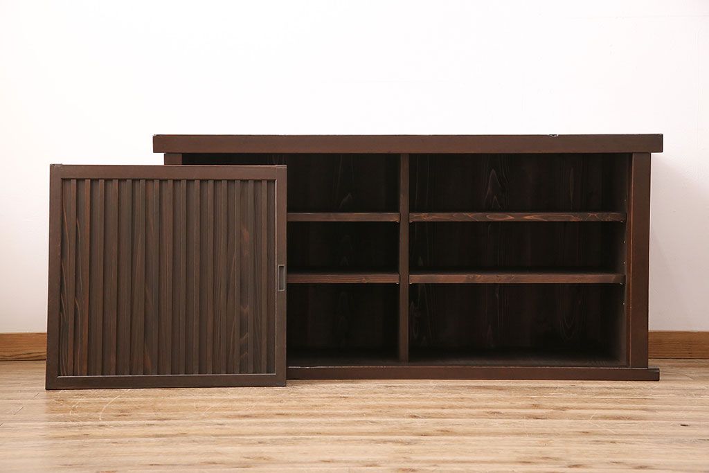 キャビネット・戸棚> テレビ台・ローボード > 水屋箪笥サイドボードをリペア&カスタム!建具は縦格子を製作。収納部はセパレートさせ、可動式の棚板を設置。現状に近しい色味に着色し仕上げ。(収納棚、戸棚、リビングボード、下駄箱)
