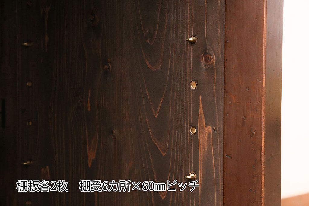 棚板は取り外しできます。棚板は各2枚あります。棚受けは6ヶ所、60mmピッチで調整できます。棚幅サイズのものが1枚の作りです。