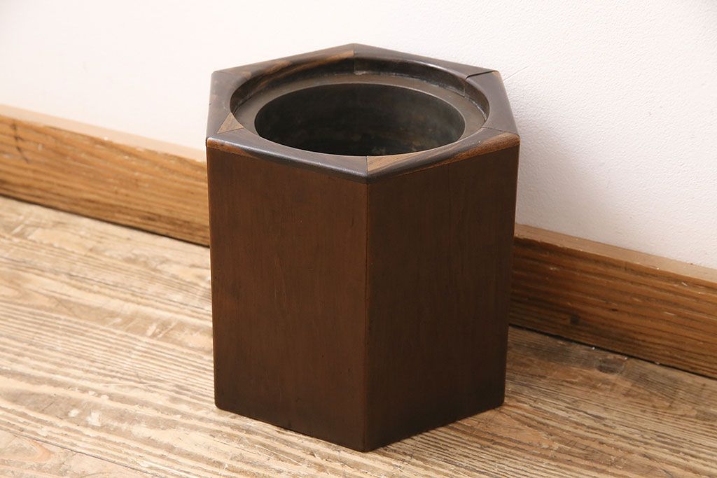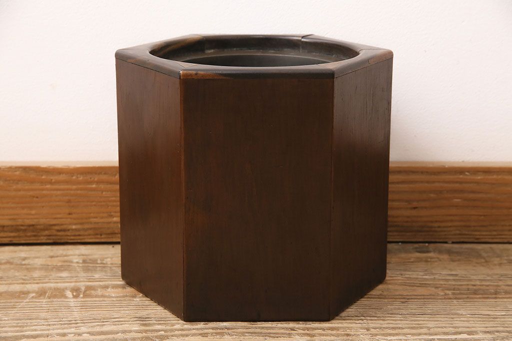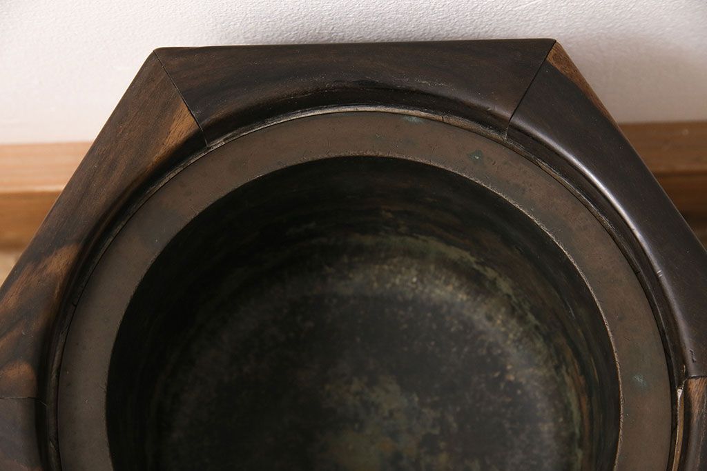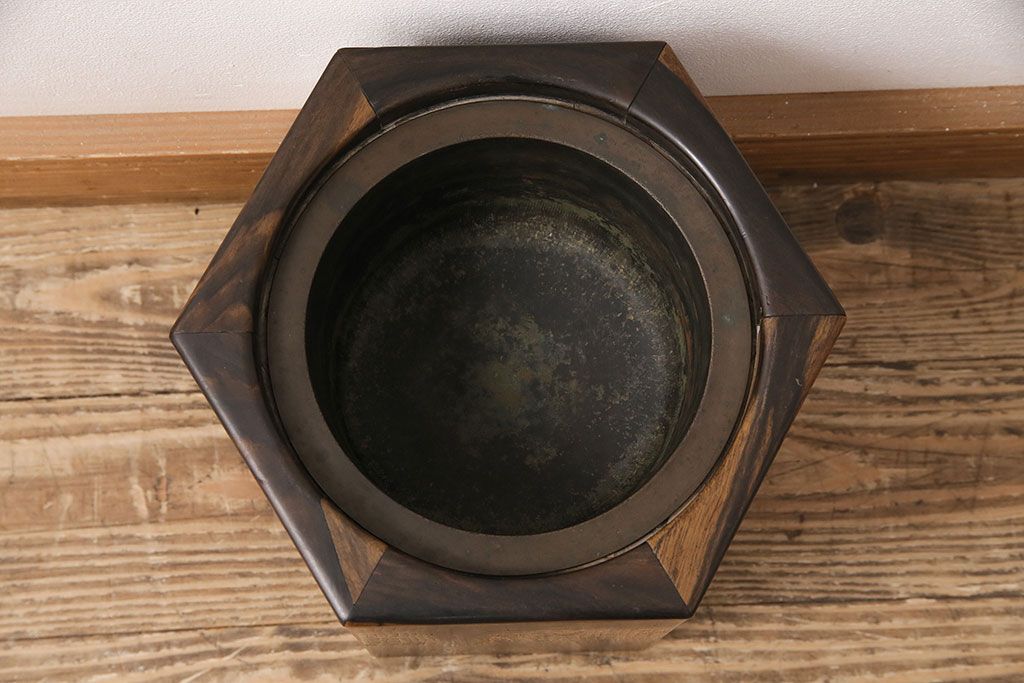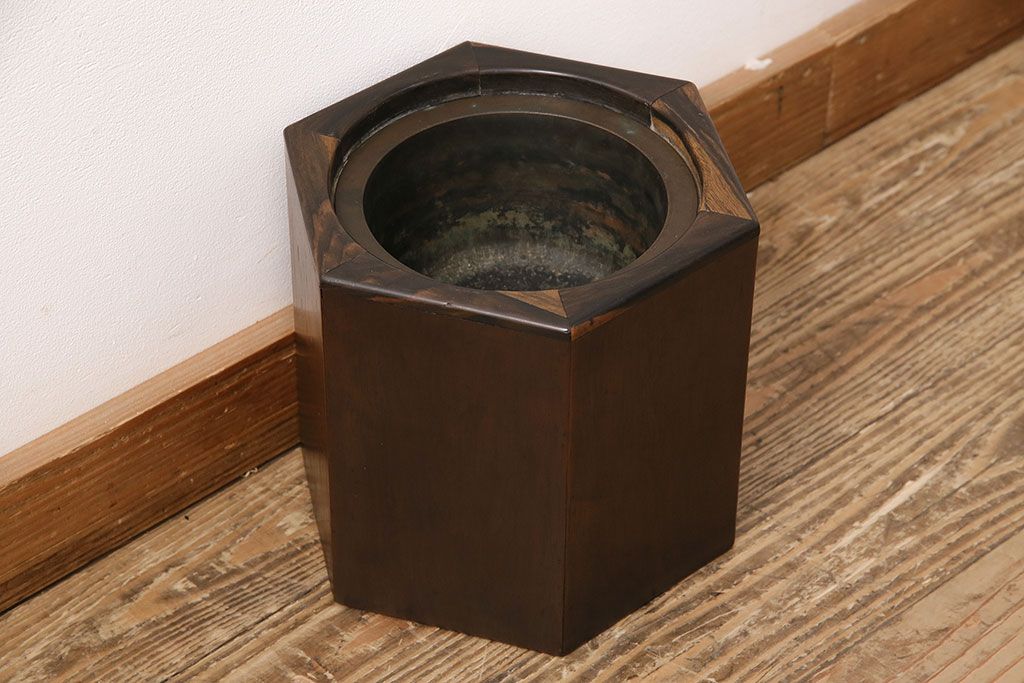 アンティーク雑貨 本体杉材・上部黒柿材 凝った意匠がぱっと目を引く六角型木製火鉢(角火鉢)(R-048502)
