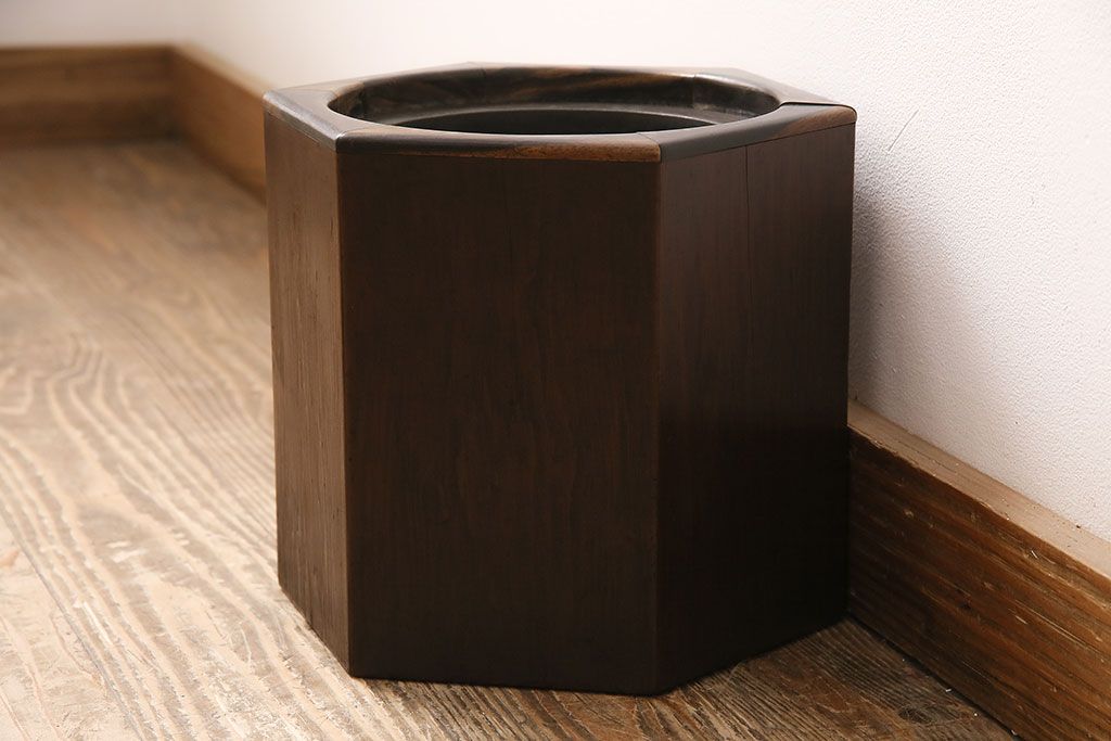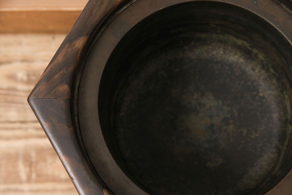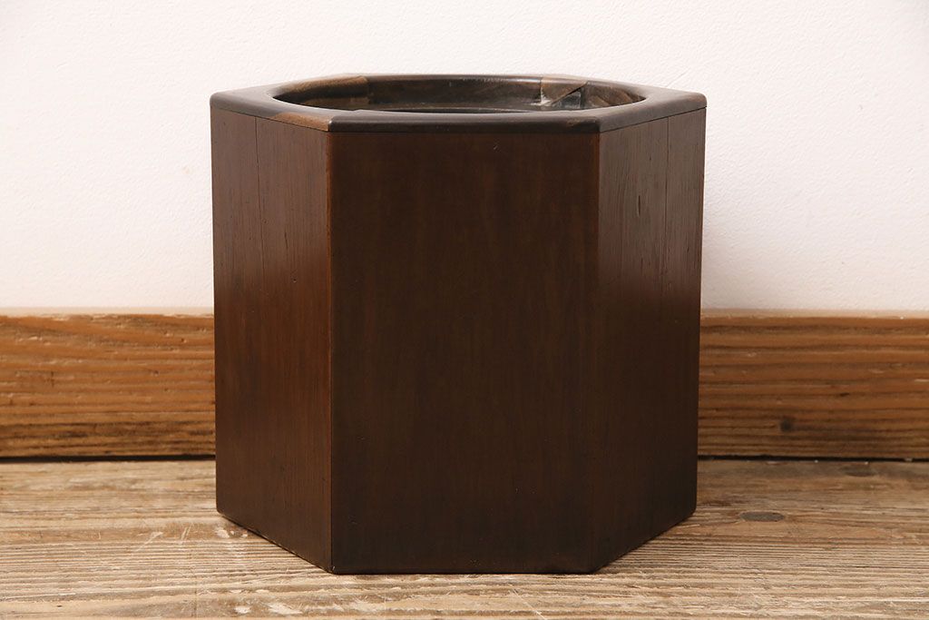 アンティーク雑貨 本体杉材・上部黒柿材 凝った意匠がぱっと目を引く六角型木製火鉢(角火鉢)(R-048502)です。