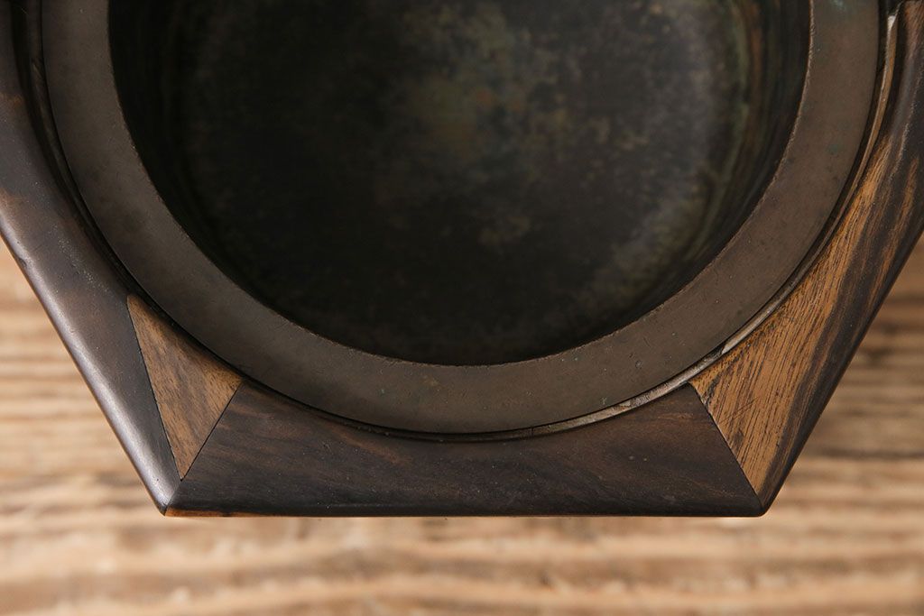 火鉢> 木製火鉢 > アンティーク雑貨 本体杉材・上部黒柿材 凝った意匠がぱっと目を引く六角型木製火鉢(角火鉢)(R-048502)