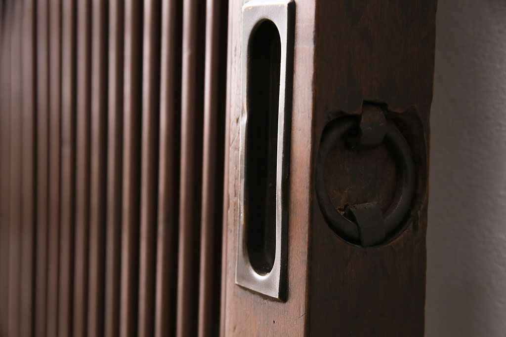 明治大正期の蔵戸をリペア&カスタム!取っ手、蝶番を取り付けドアにリメイク。設置場所に合わせてリサイズ。格子裏にアクリルワーロンを組み入れ。(玄関戸、玄関ドア、建具)