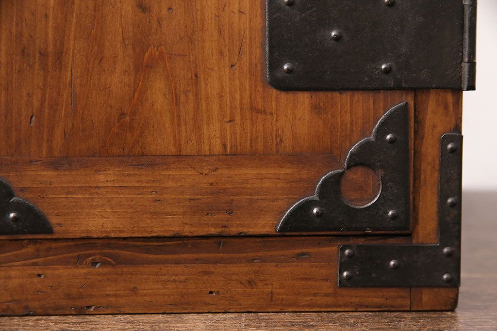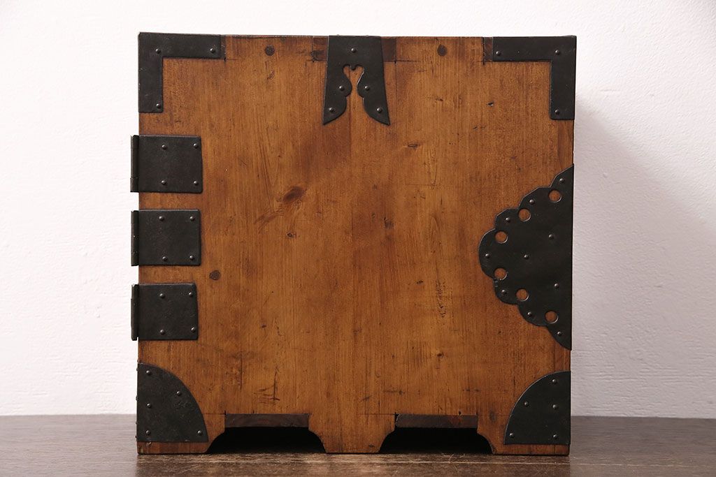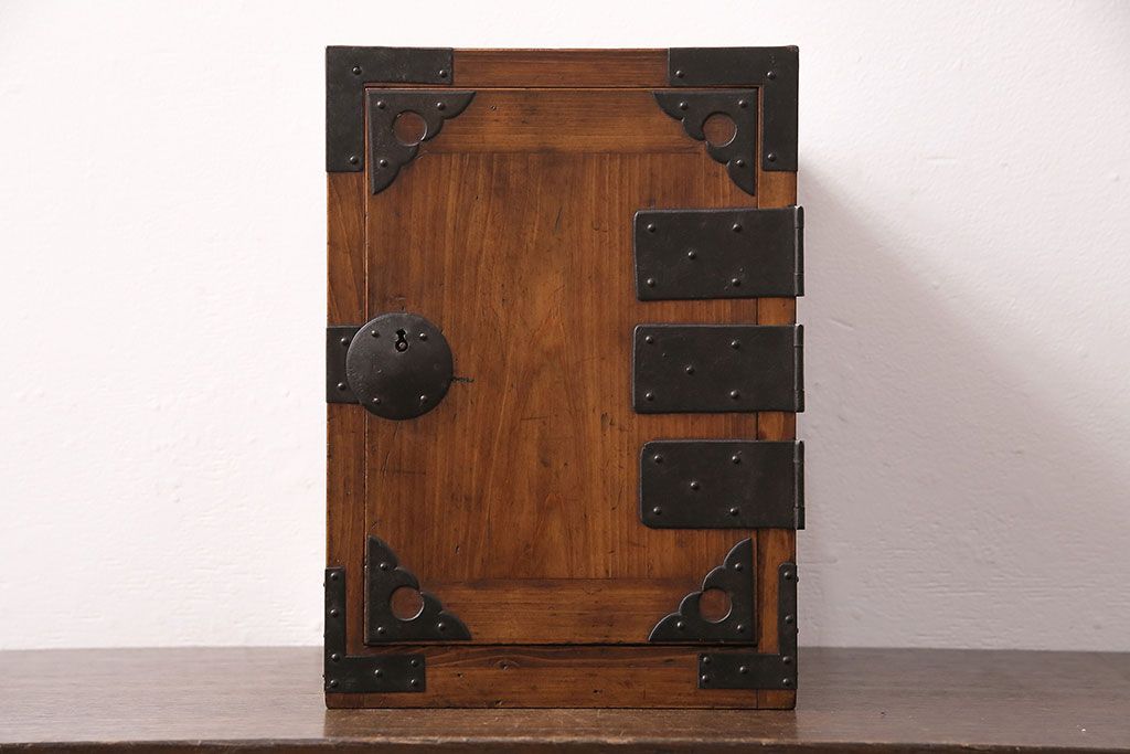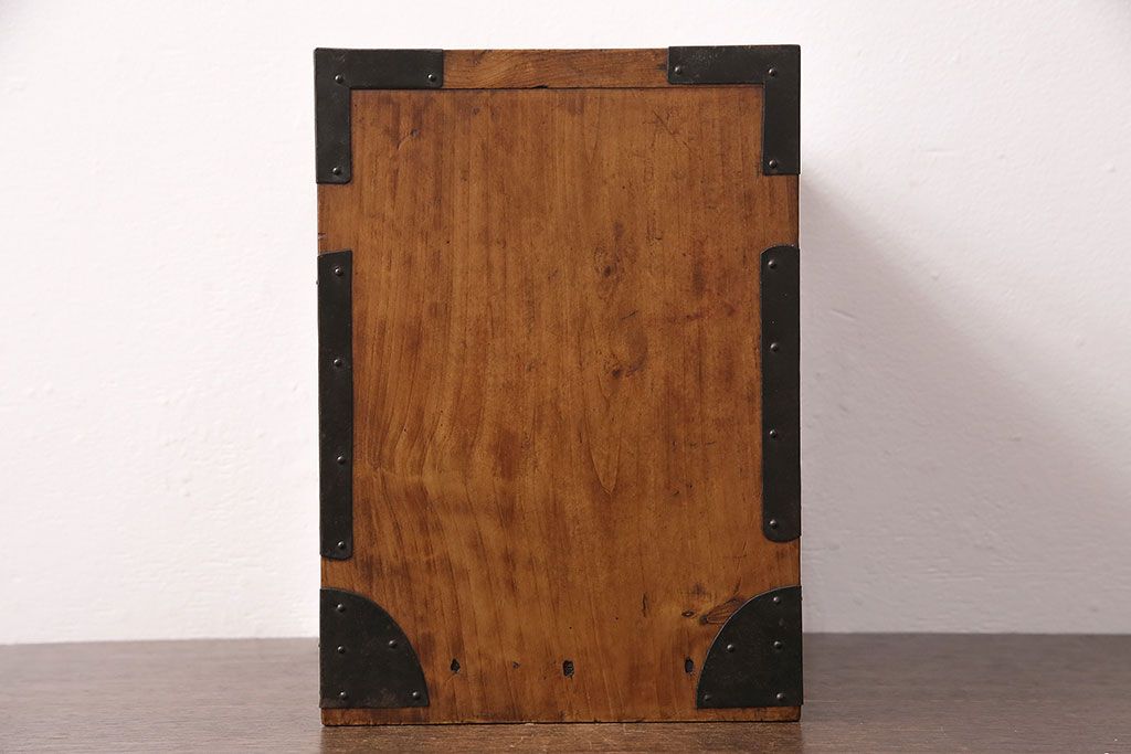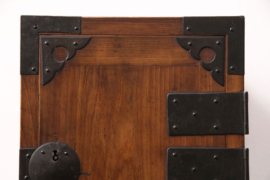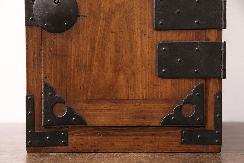 和製アンティーク 檜材 黒々とした飾り金具が存在感のある書類庫(小引き出し、小物収納、金庫)(R-048501)