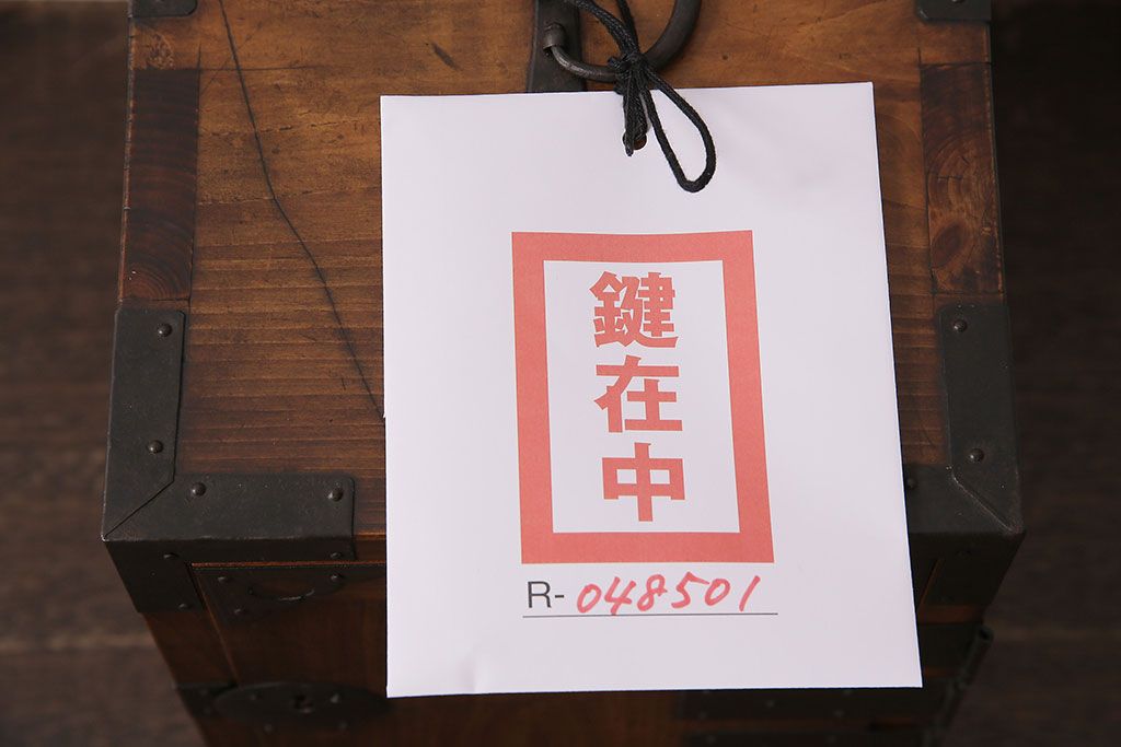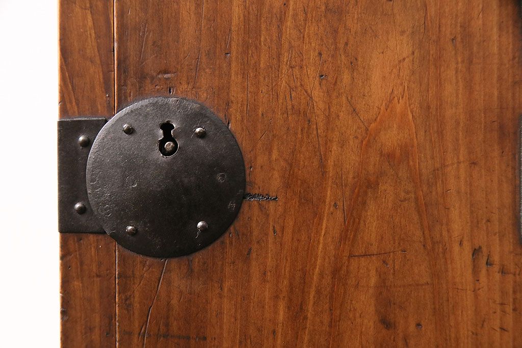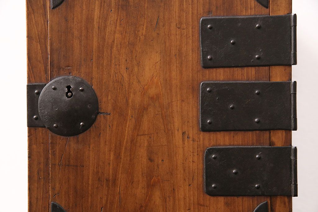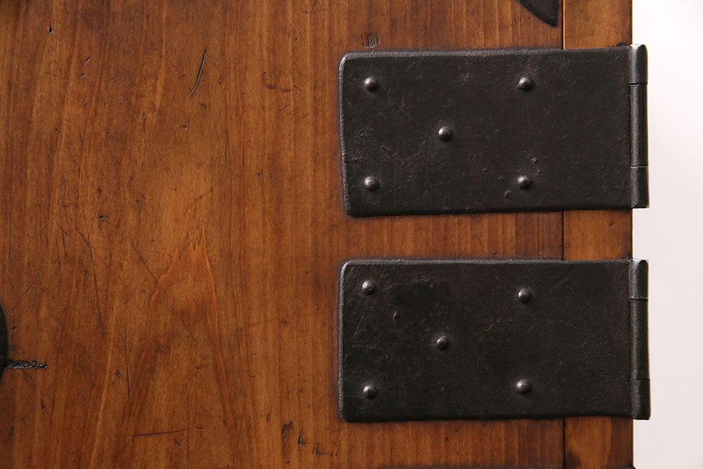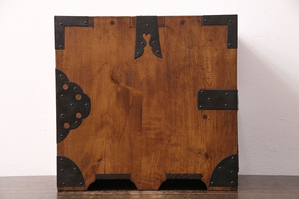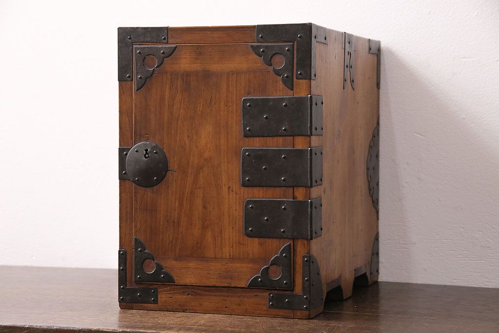 和製アンティーク 檜材 黒々とした飾り金具が存在感のある書類庫(小引き出し、小物収納、金庫)(R-048501)