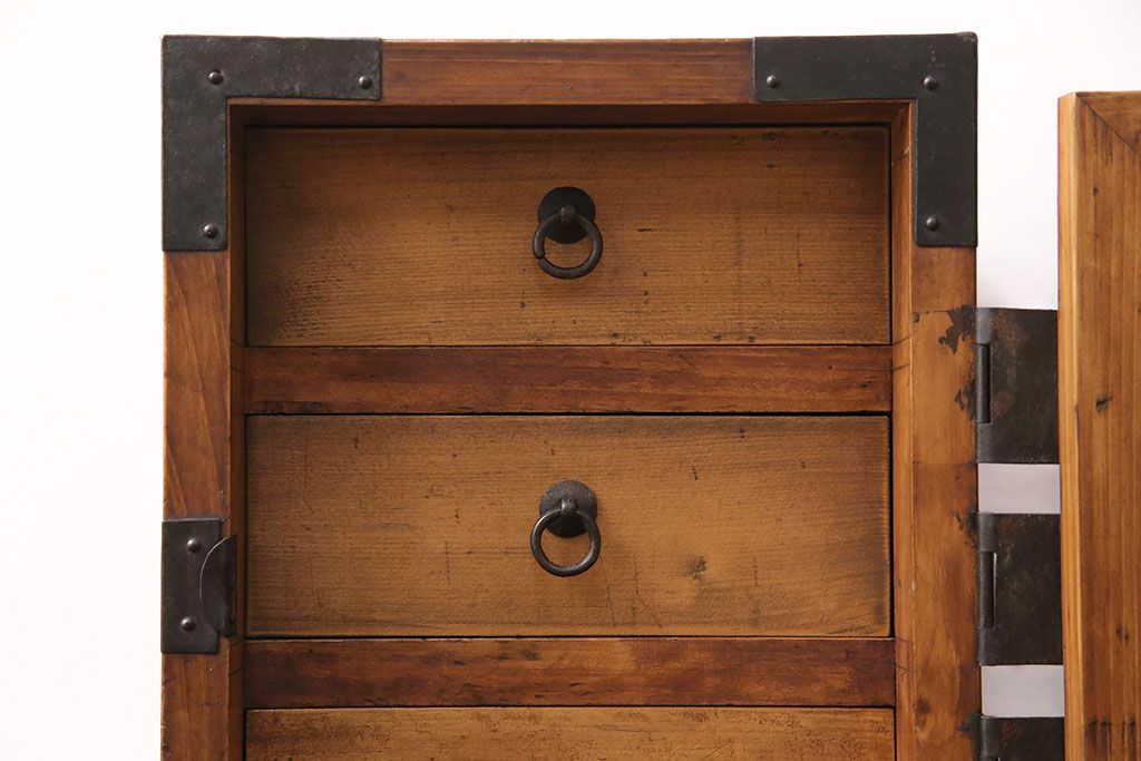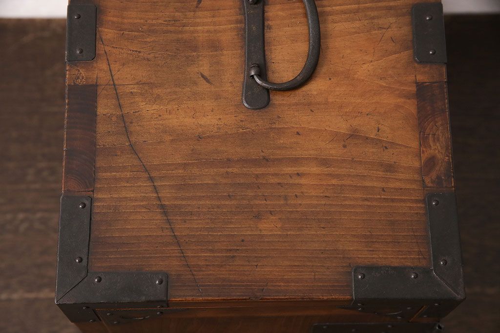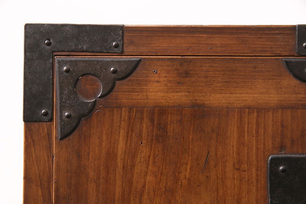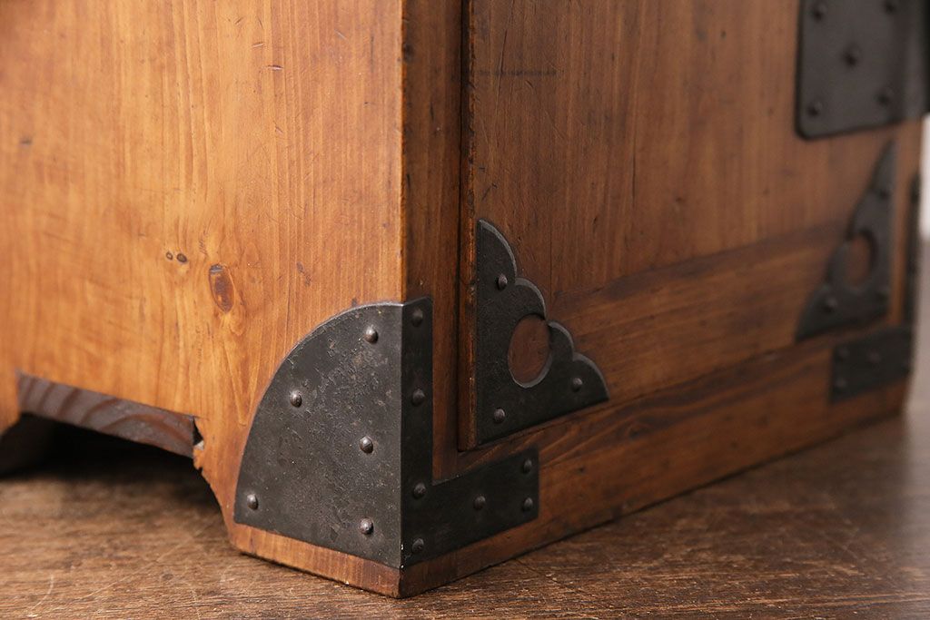 和製アンティーク 檜材 黒々とした飾り金具が存在感のある書類庫(小引き出し、小物収納、金庫)(R-048501)です。