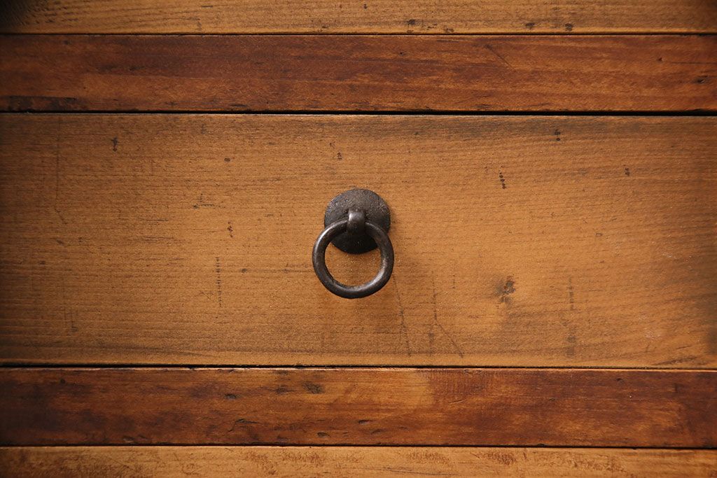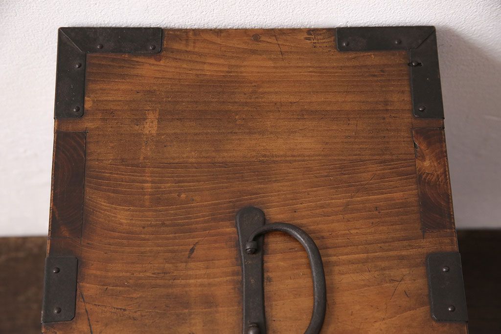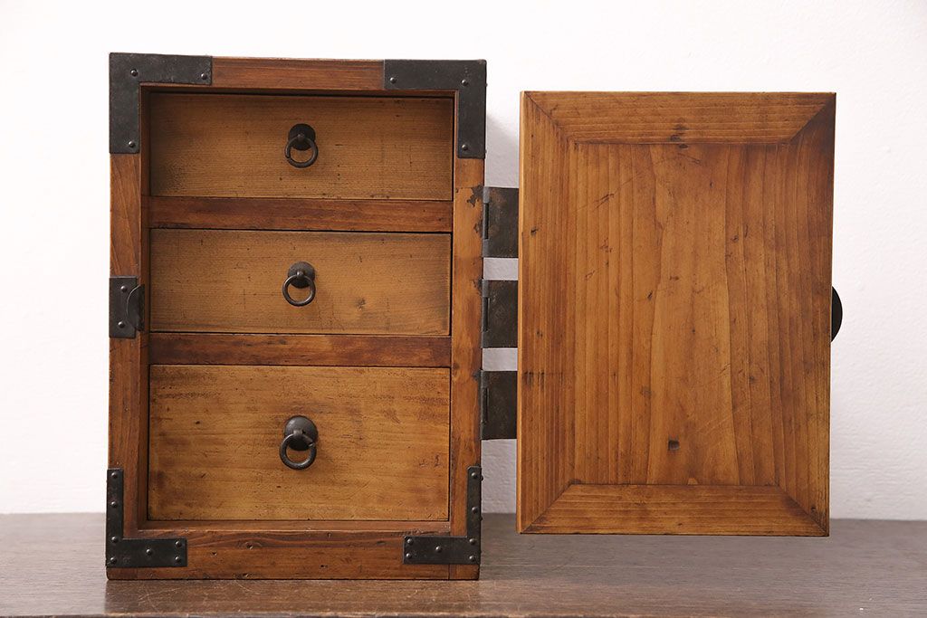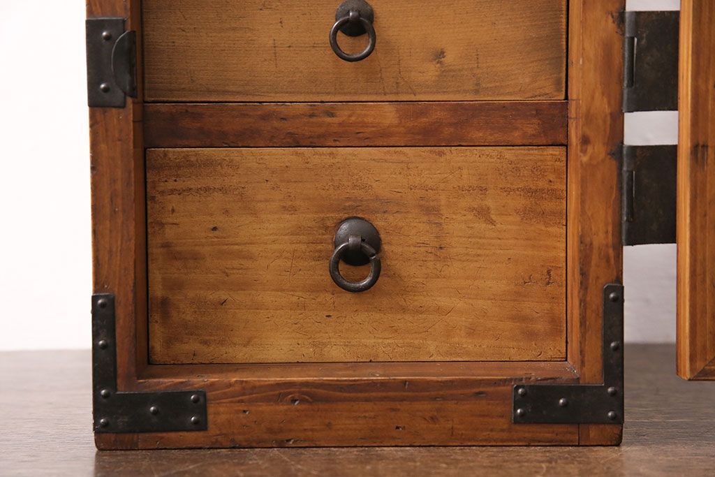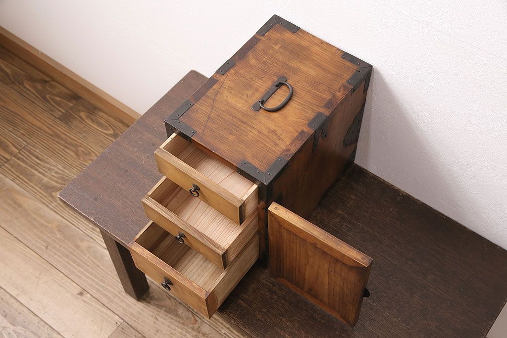 和製アンティーク 檜材 黒々とした飾り金具が存在感のある書類庫(小引き出し、小物収納、金庫)(R-048501)です。