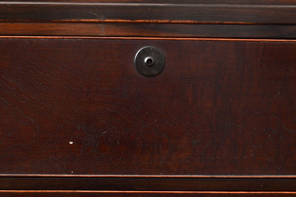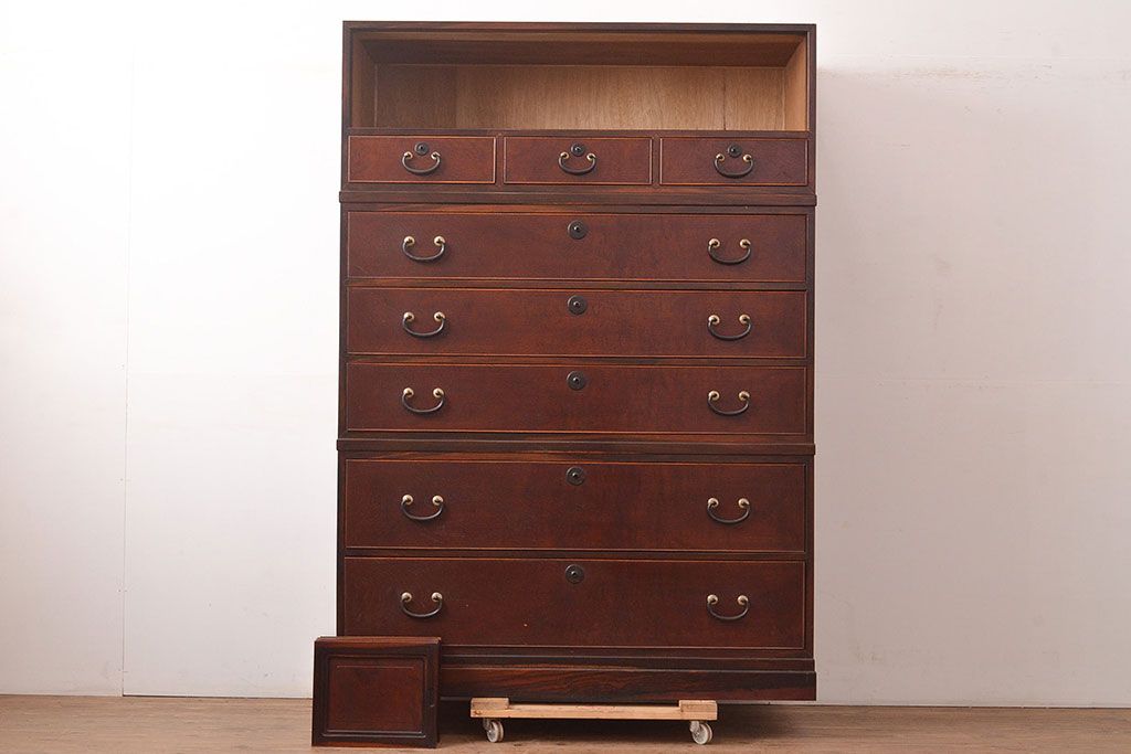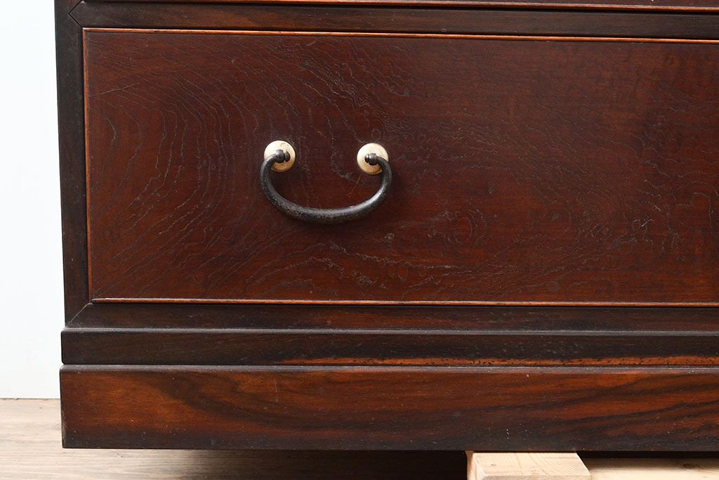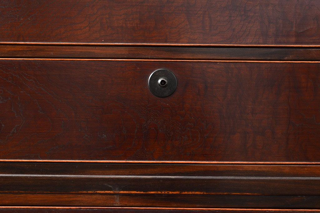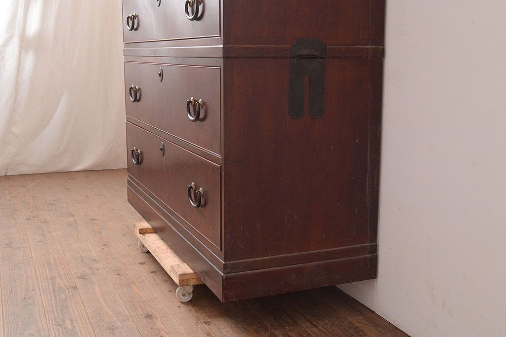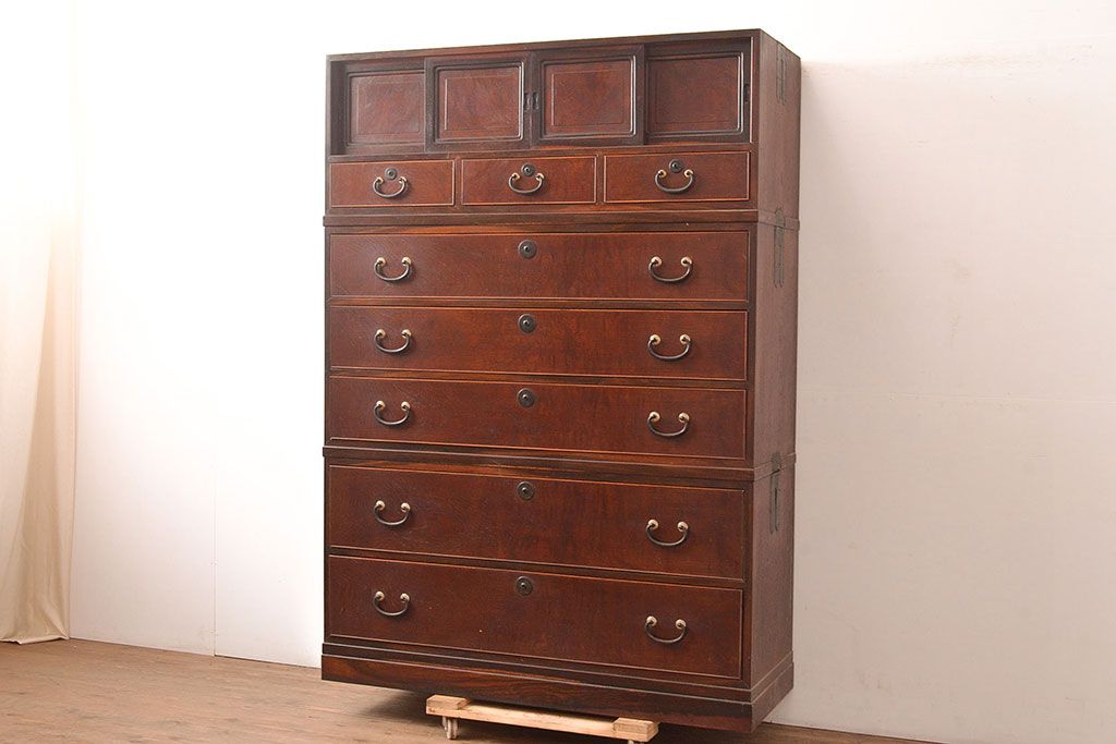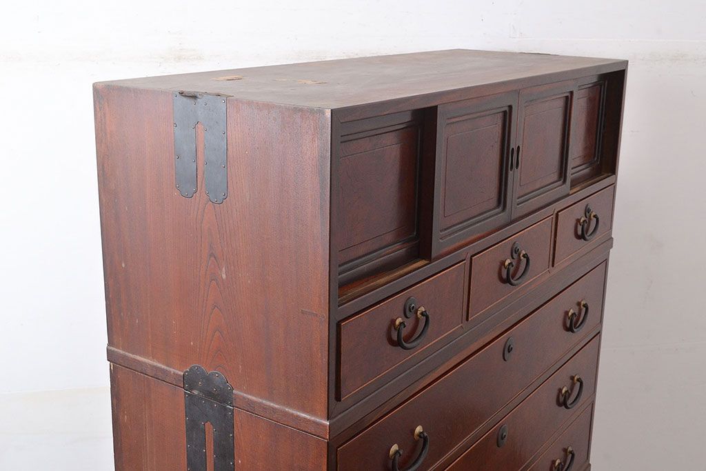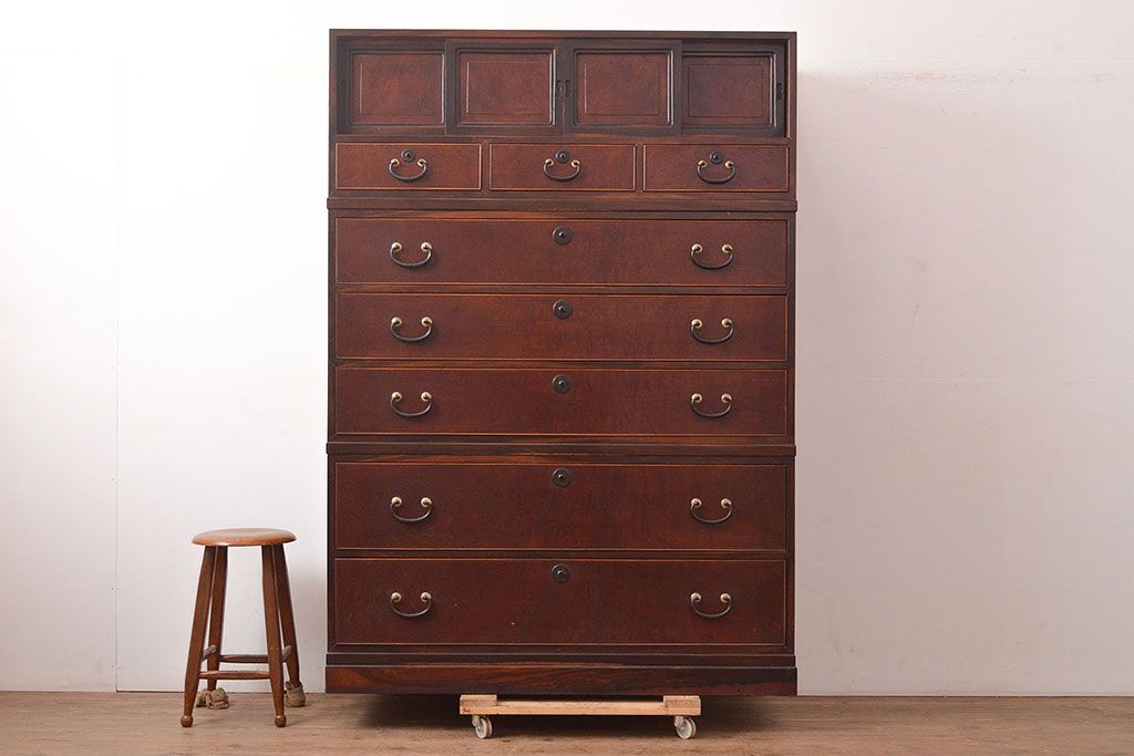 和箪笥> 衣装箪笥 > 【簡易リペア限定品】和製アンティーク 前面漆塗り(ケヤキ玉杢・黒柿) 中(楠木) 天板・側面(ケヤキ) 高級品!品のある佇まいが魅力的な指物家具の重ね箪笥(収納箪笥、整理箪笥、引き出し、チェスト)(R-047558)
