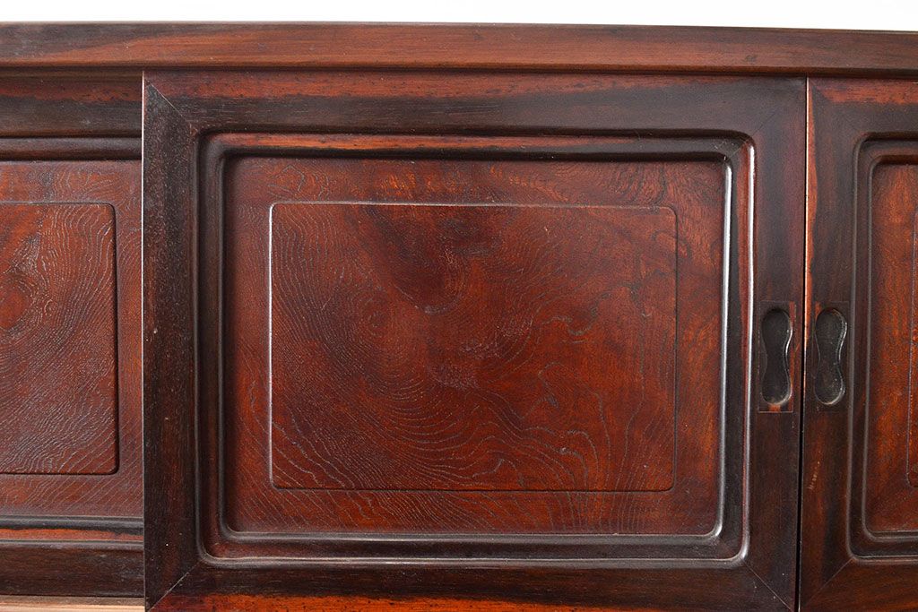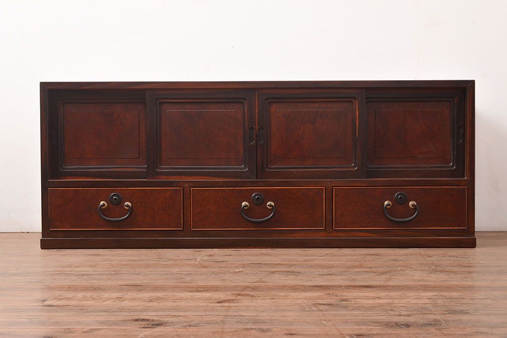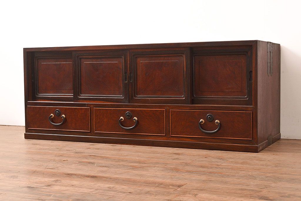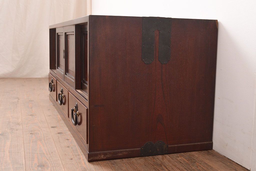 キャビネット・戸棚> テレビ台・ローボード > 【簡易リペア限定品】和製アンティーク 前面漆塗り(ケヤキ玉杢・黒柿) 中(楠木) 天板・側面(ケヤキ) 高級品!品のある佇まいが魅力的な指物家具の箪笥ローボード(収納箪笥、時代箪笥、収納棚)(R-047559)