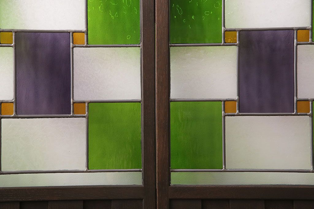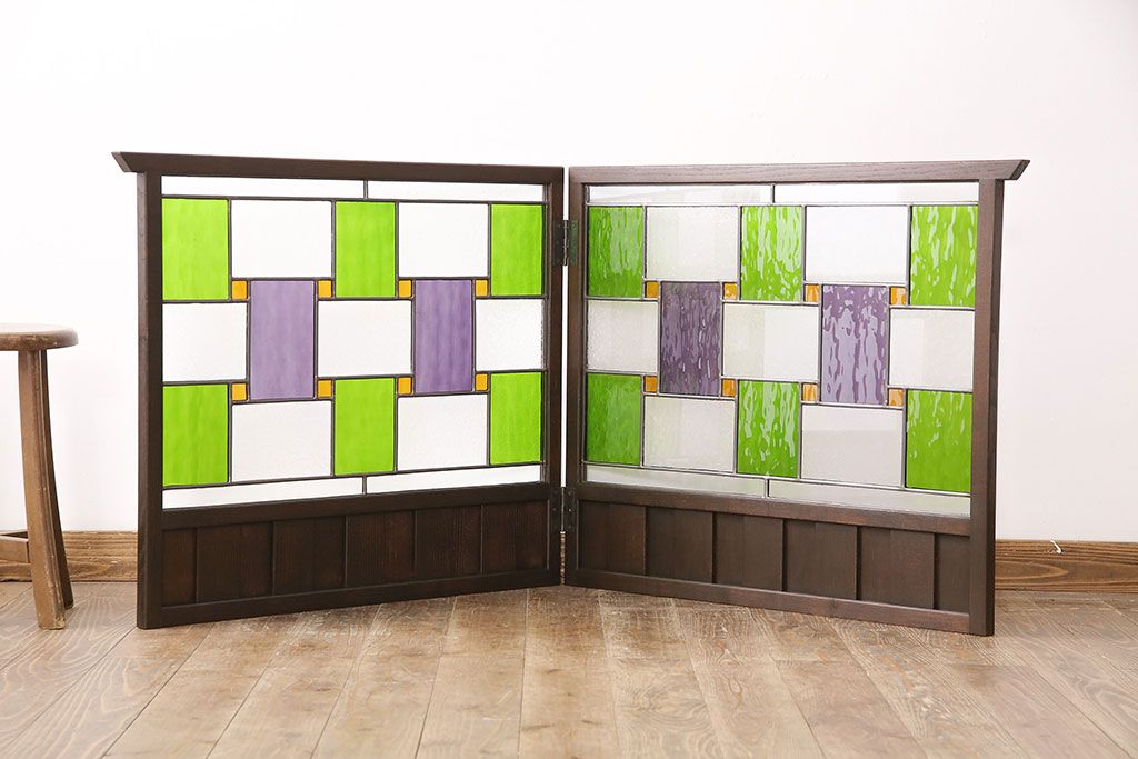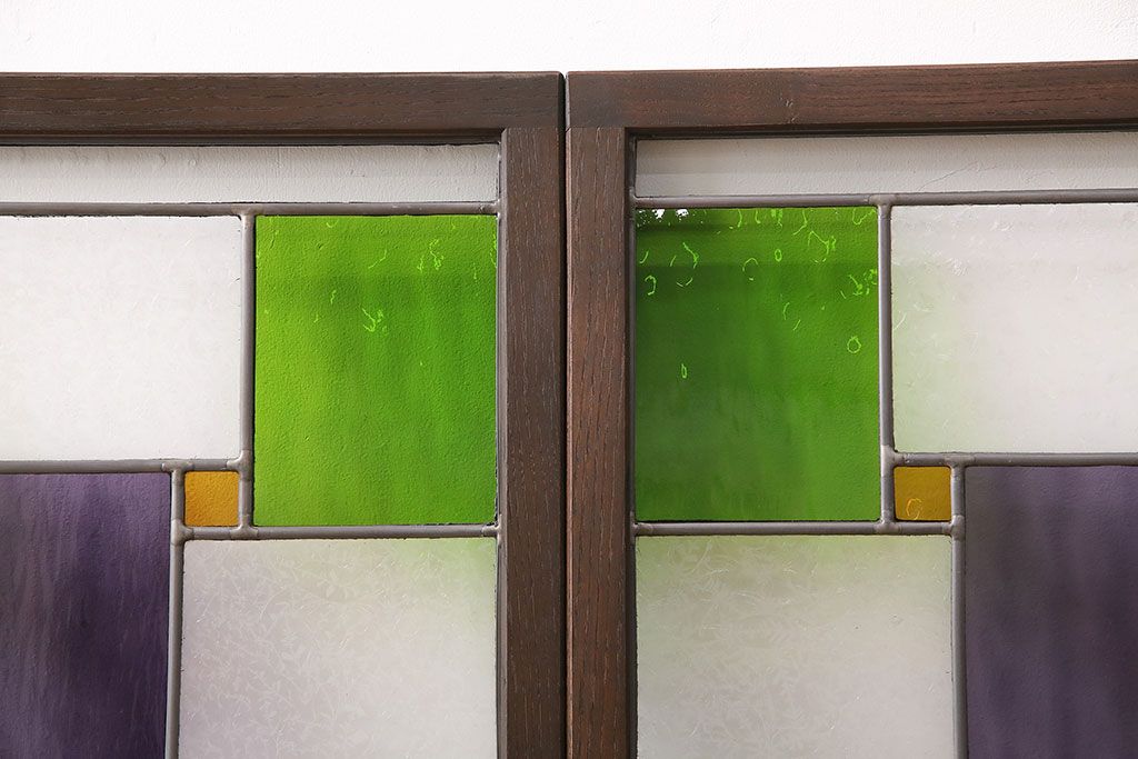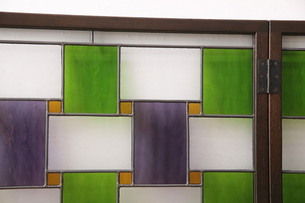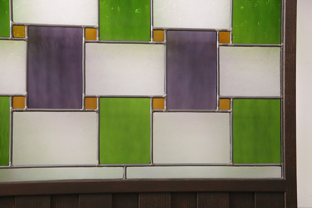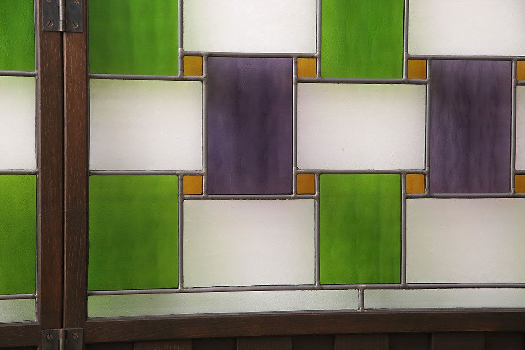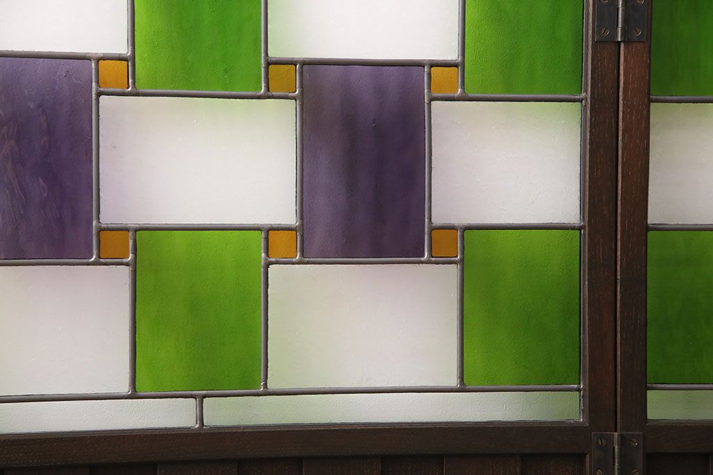 大正ロマンな衝立を新規製作!当店商品を参考にデザイン。結霜ガラス、黄色・緑・紫の色ガラスを組み入れ。(つい立て、パーテーション)