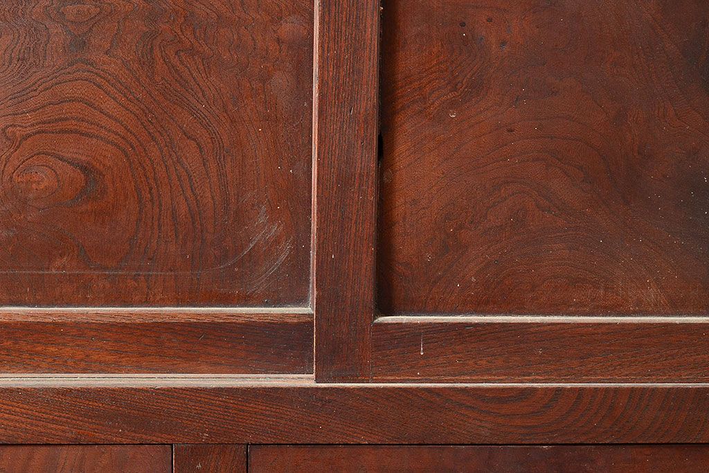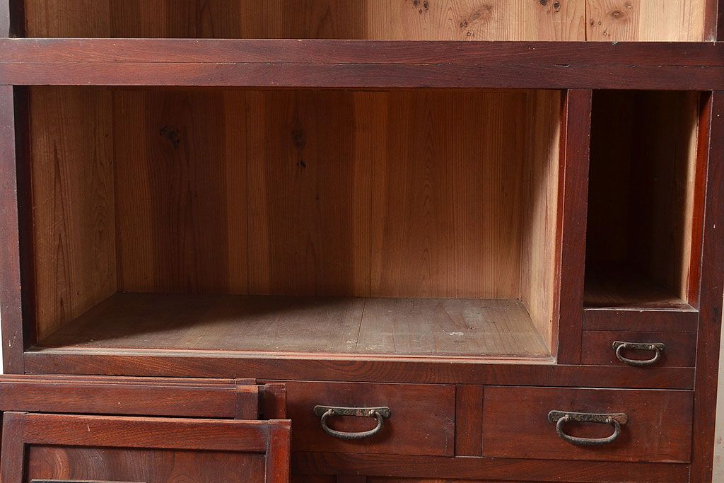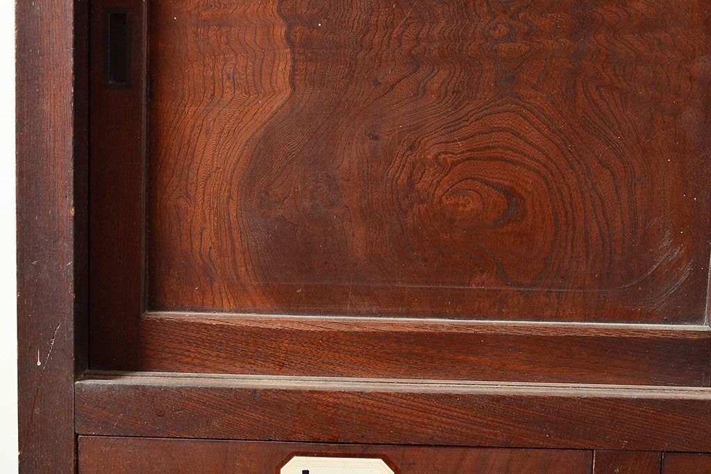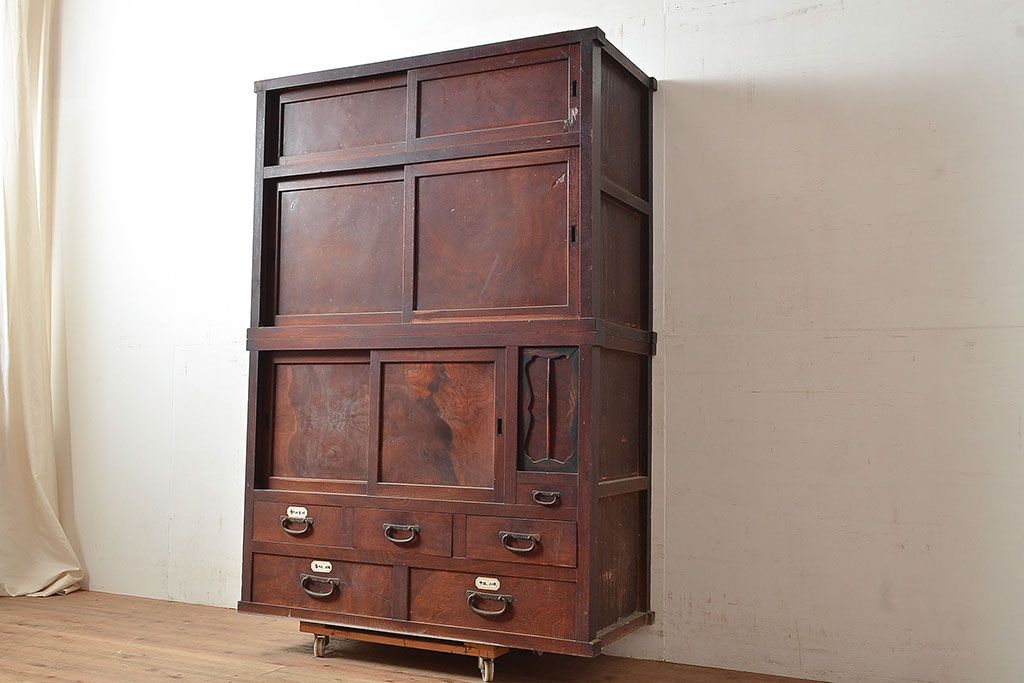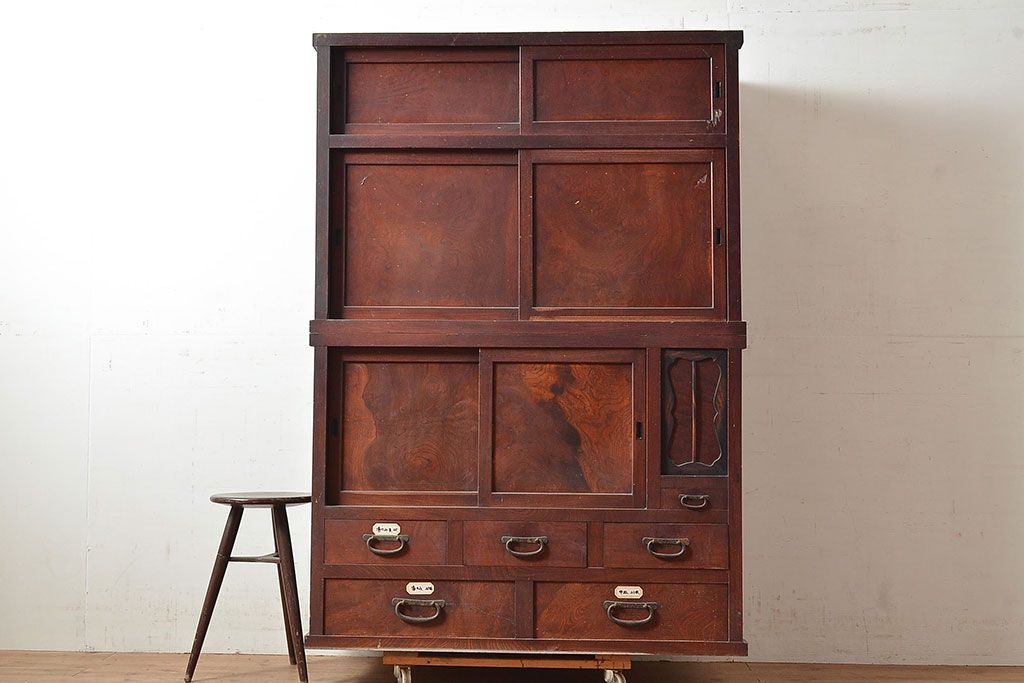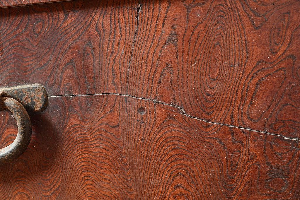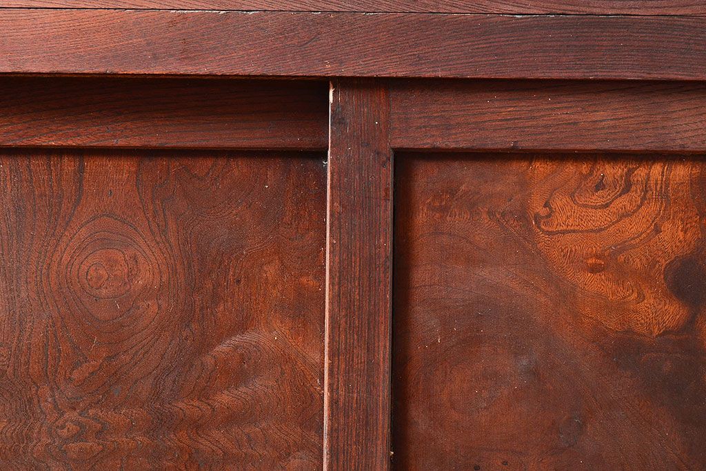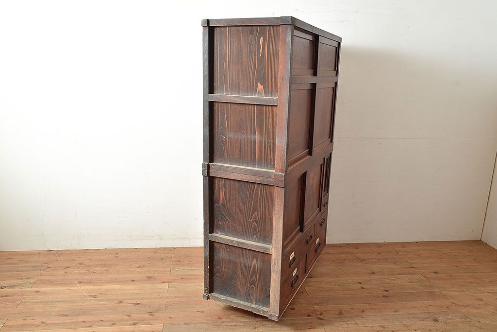 ラフジュ工房> 和箪笥> 茶箪笥・茶棚 > 和製アンティーク 漆塗り 大胆でくっきりとした杢目が存在感抜群の前面ケヤキ材製重ね箪笥(関東水屋箪笥、収納棚、茶棚、キャビネット)(R-047363)