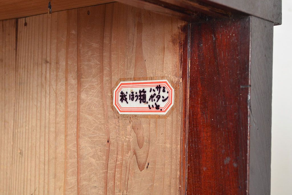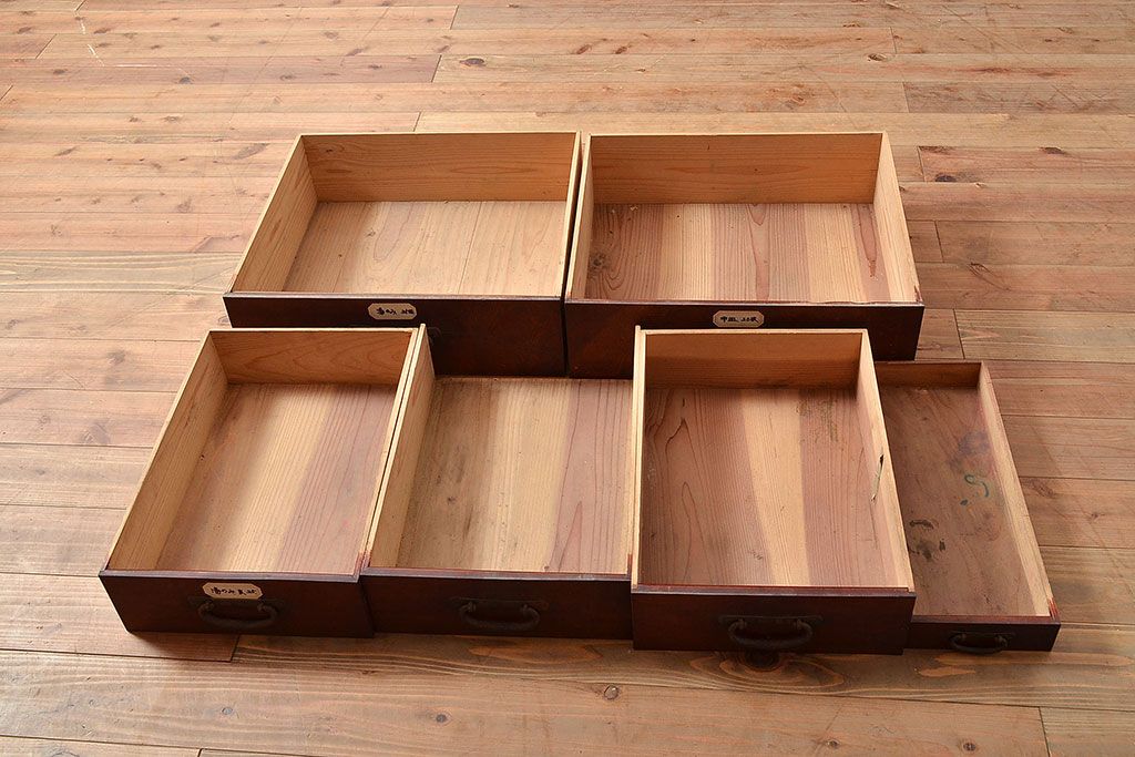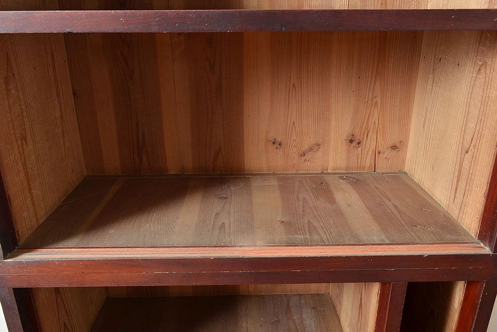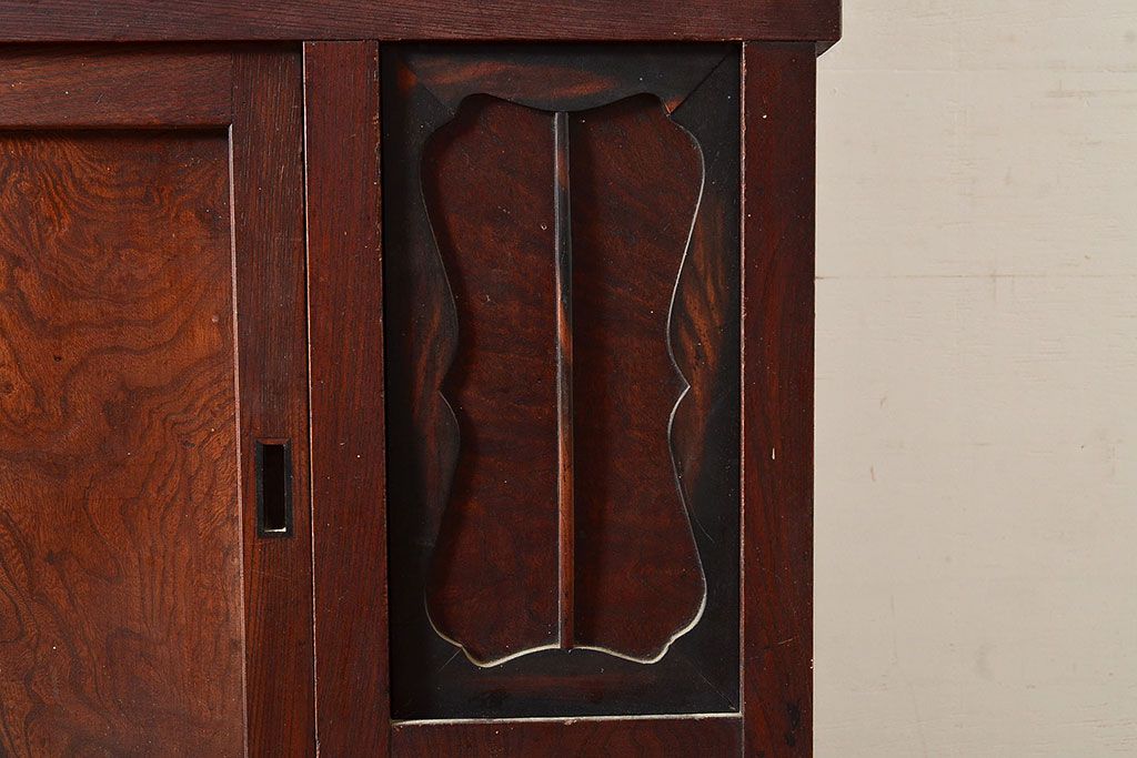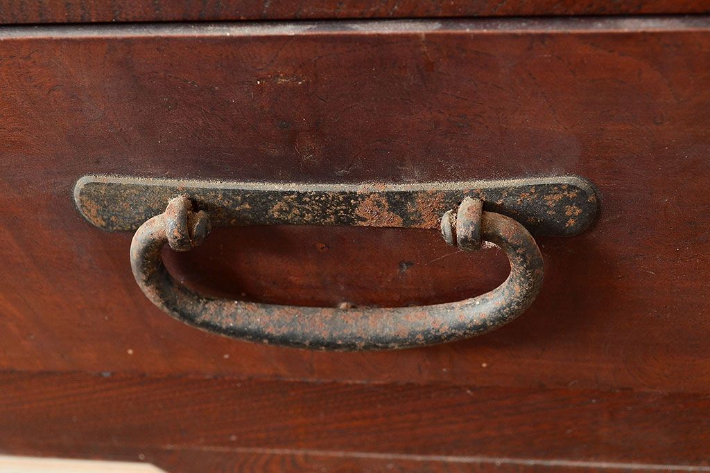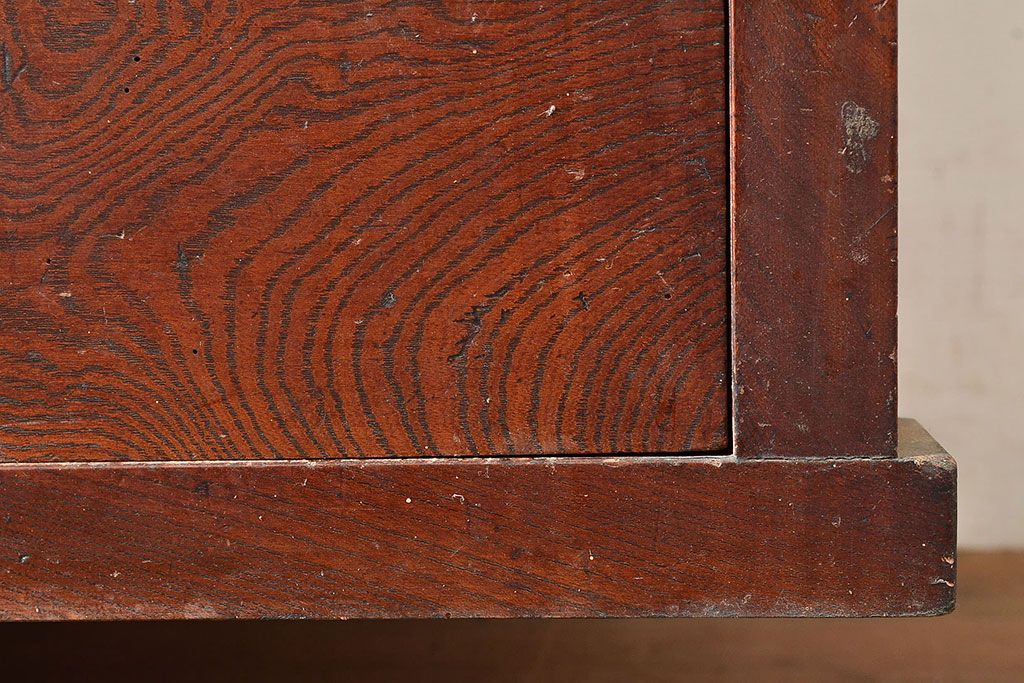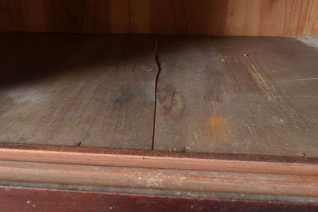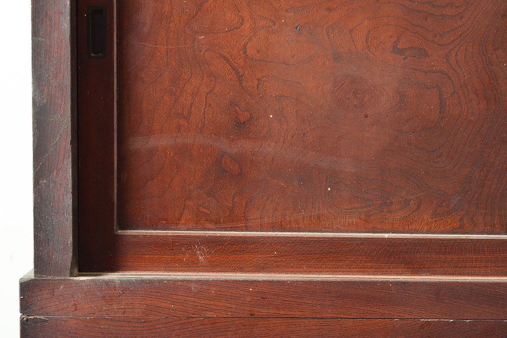ラフジュ工房> 和箪笥> 茶箪笥・茶棚 > 和製アンティーク 漆塗り 大胆でくっきりとした杢目が存在感抜群の前面ケヤキ材製重ね箪笥(関東水屋箪笥、収納棚、茶棚、キャビネット)(R-047363)