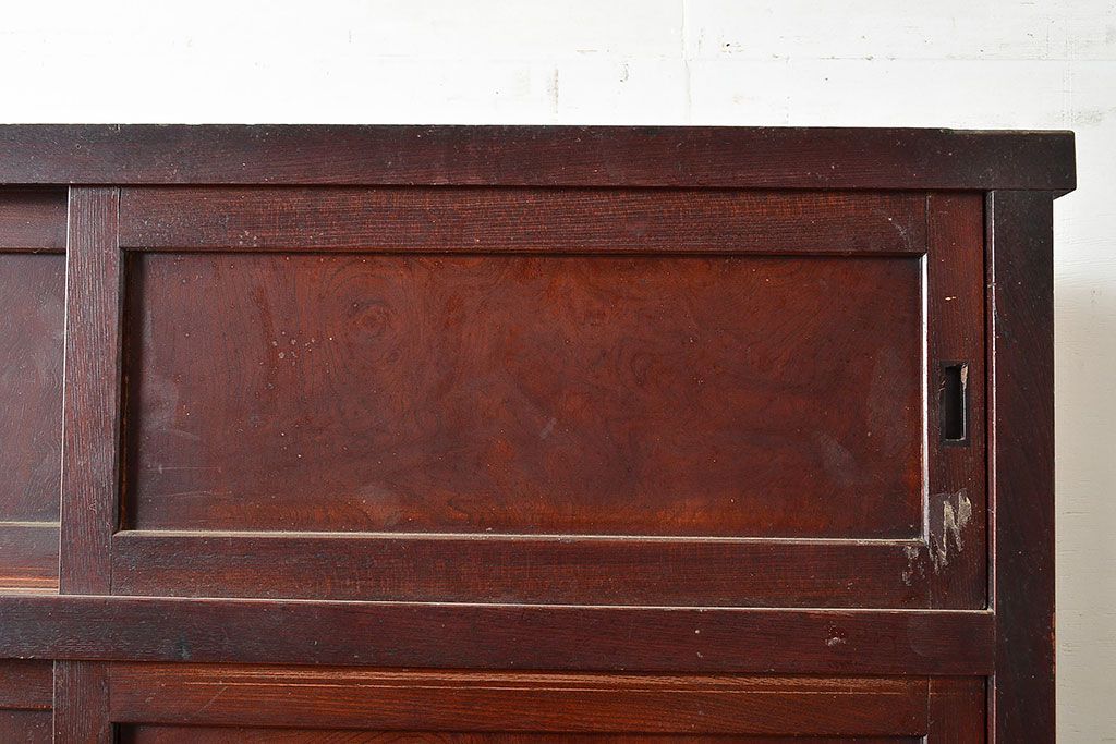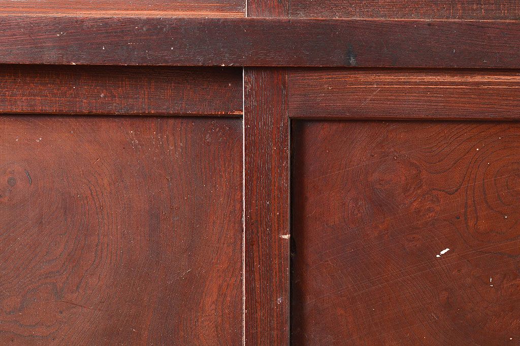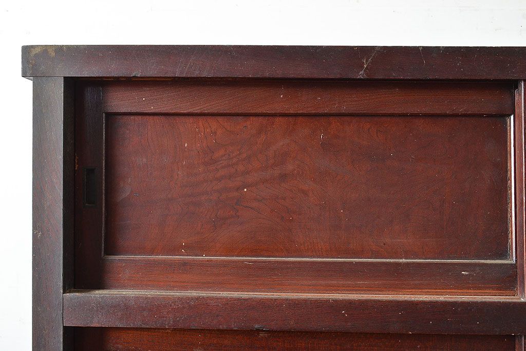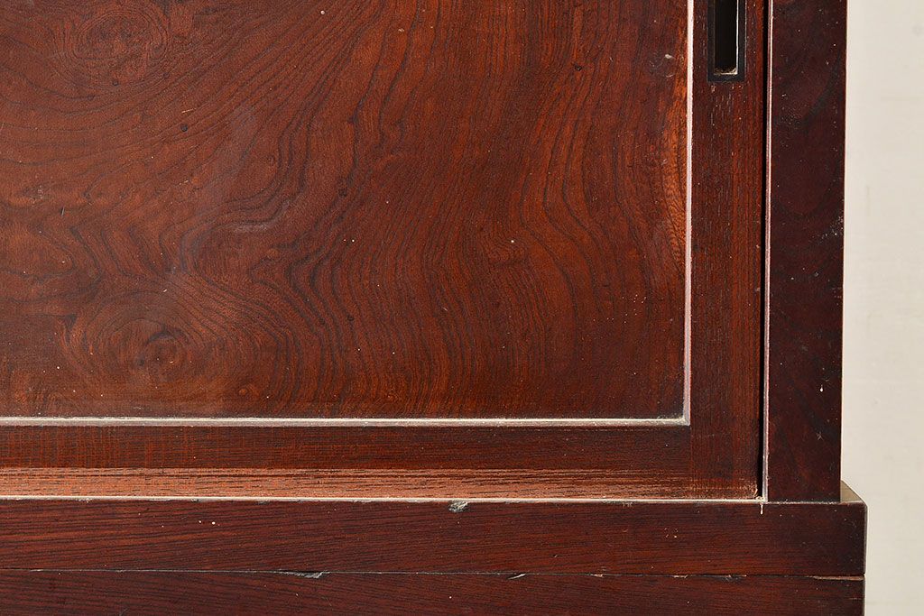 和製アンティーク 漆塗り 大胆でくっきりとした杢目が存在感抜群の前面ケヤキ材製重ね箪笥(関東水屋箪笥、収納棚、茶棚、キャビネット)(R-047363)