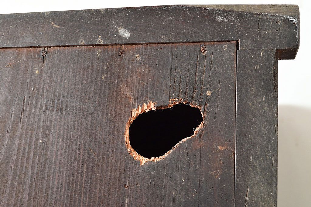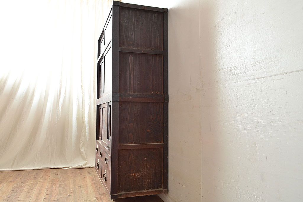 ラフジュ工房> 和箪笥> 水屋箪笥 > 和製アンティーク 漆塗り 大胆でくっきりとした杢目が存在感抜群の前面ケヤキ材製重ね箪笥(関東水屋箪笥、収納棚、茶棚、キャビネット)(R-047363)