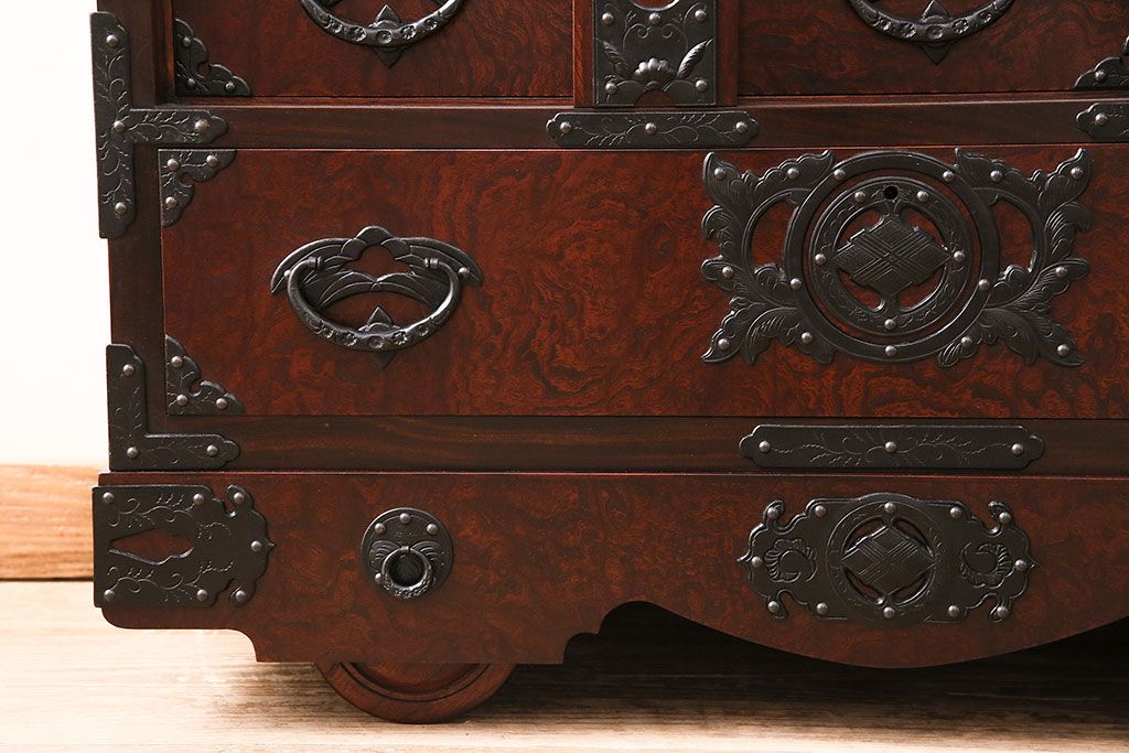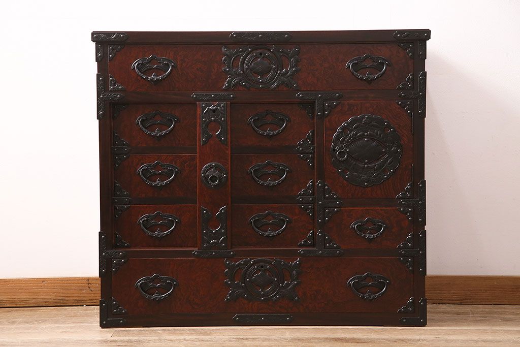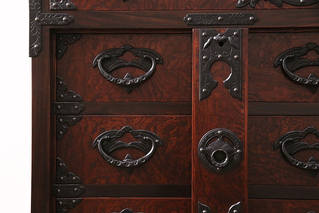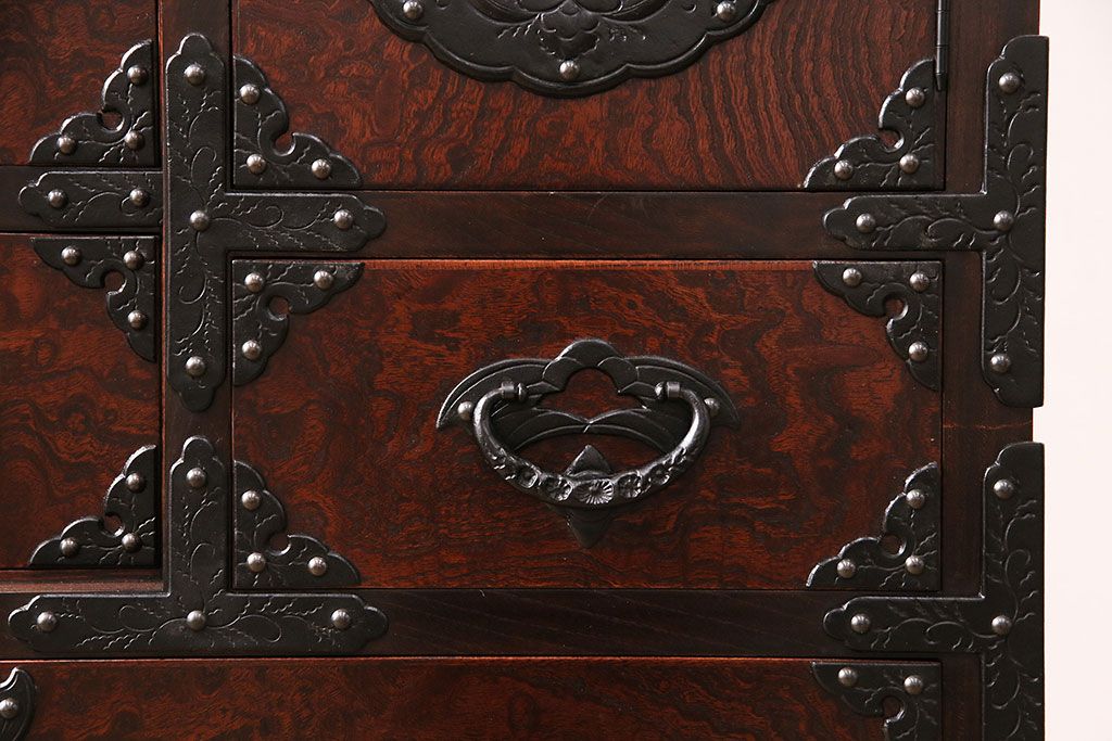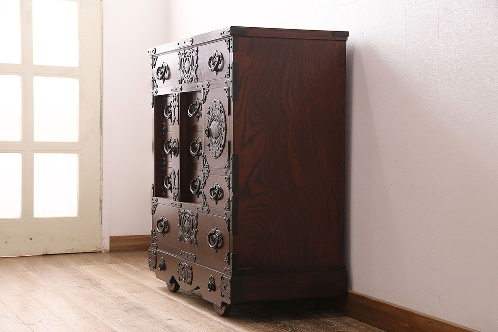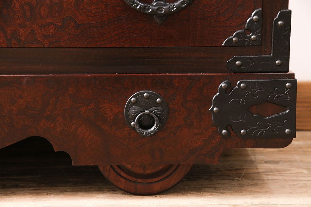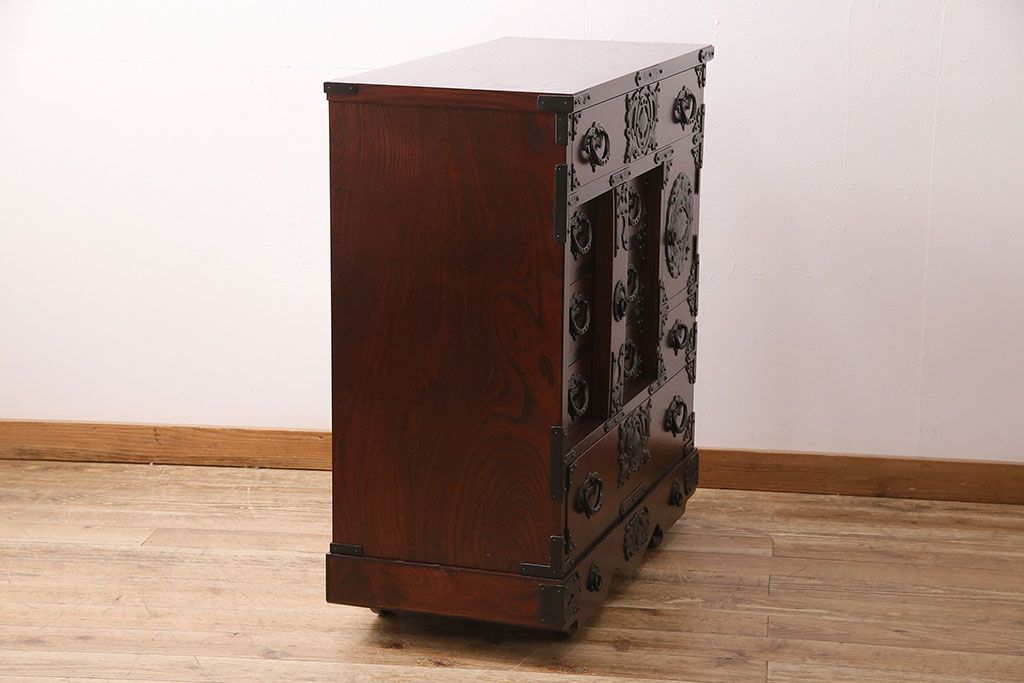 ラフジュ工房> 民芸家具 > 中古 岩谷堂箪笥 桜木家具店作 伝統車付きタンス 豪華な金具と重厚な佇まいが魅力の車箪笥(和箪笥、引き出し)(R-048609)