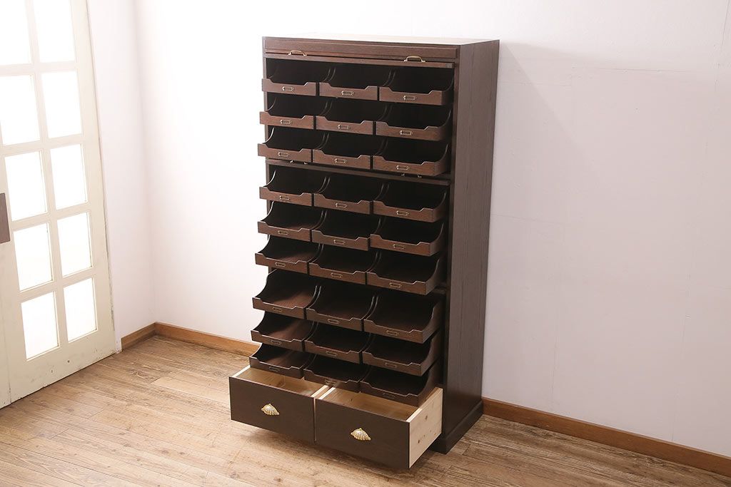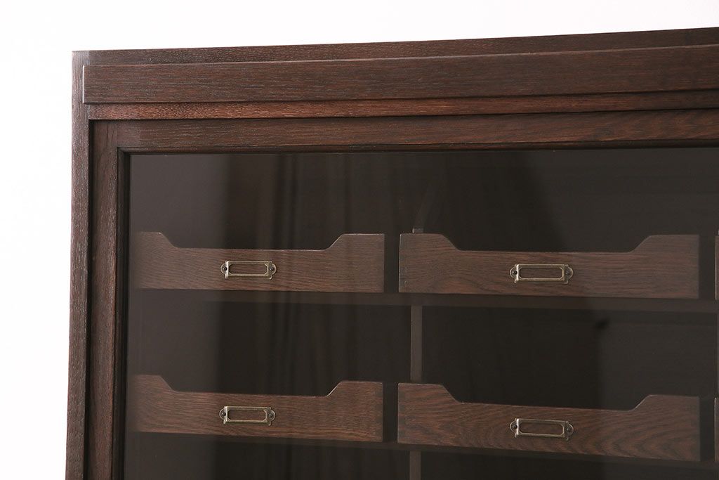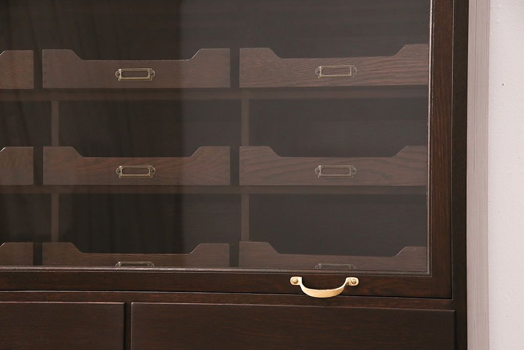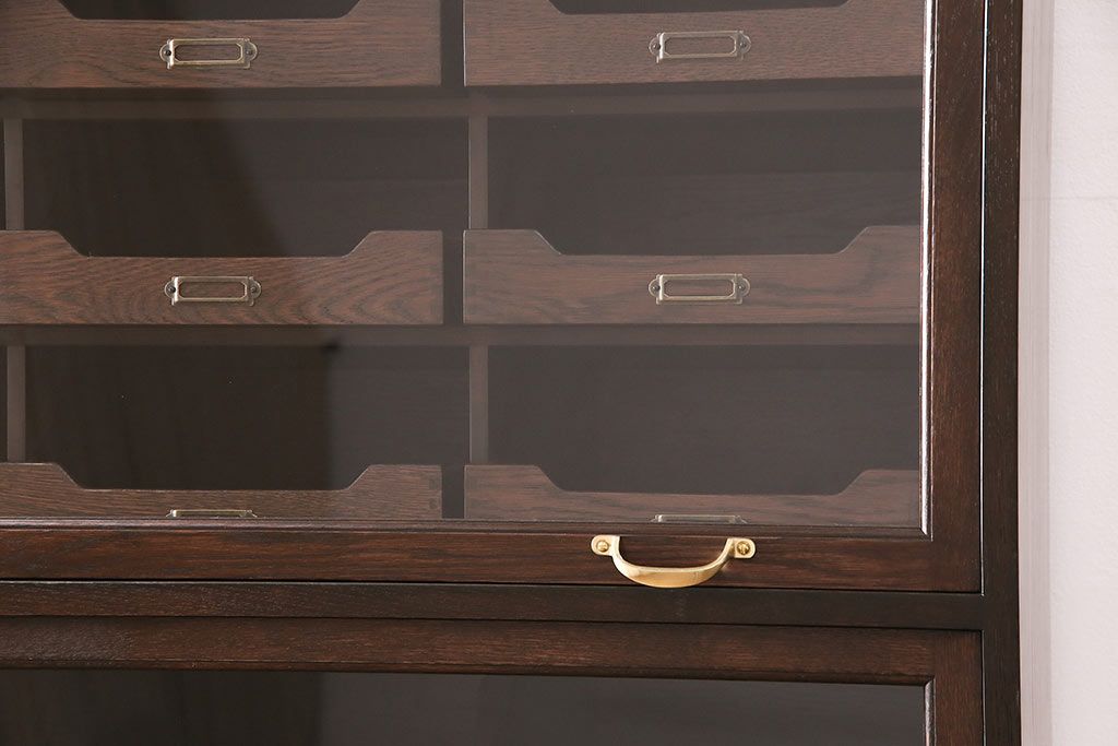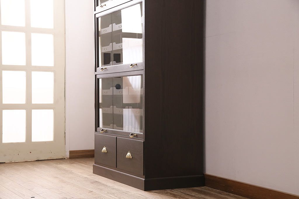 ガラスケース・ショーケース > 縦型シャツケースを新規製作!建具はクリアガラスを組み入れ。引き出しにネームプレートを取り付け。濃い茶色で着色し仕上げ。(キャビネット、ショーケース、収納棚)