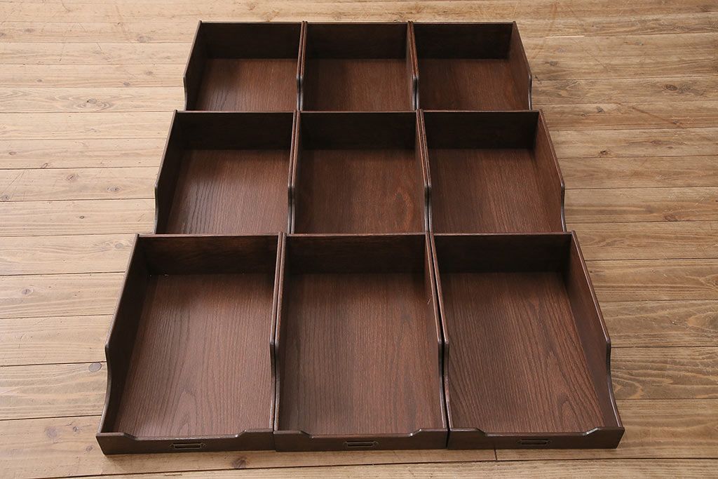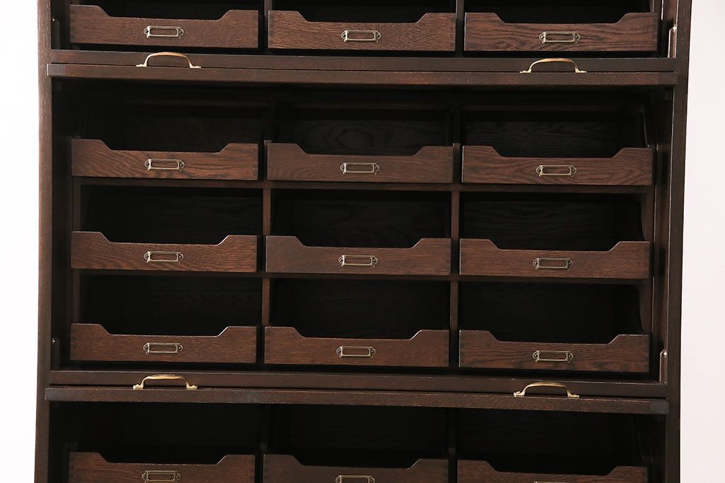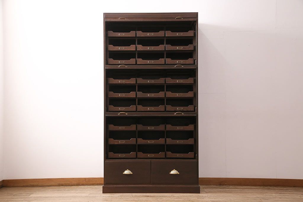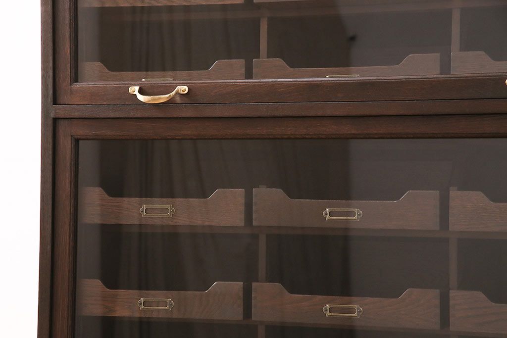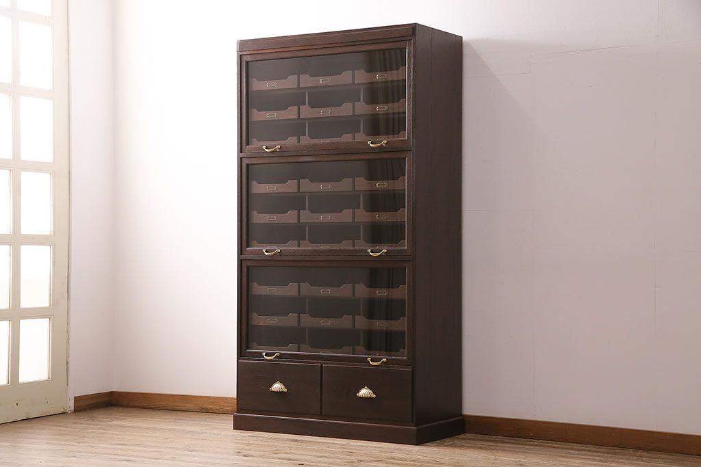 ガラスケース・ショーケース > 縦型シャツケースを新規製作!建具はクリアガラスを組み入れ。引き出しにネームプレートを取り付け。濃い茶色で着色し仕上げ。(キャビネット、ショーケース、収納棚)