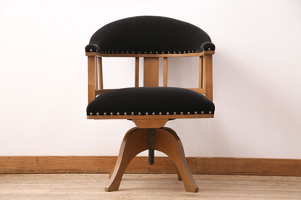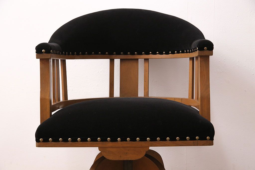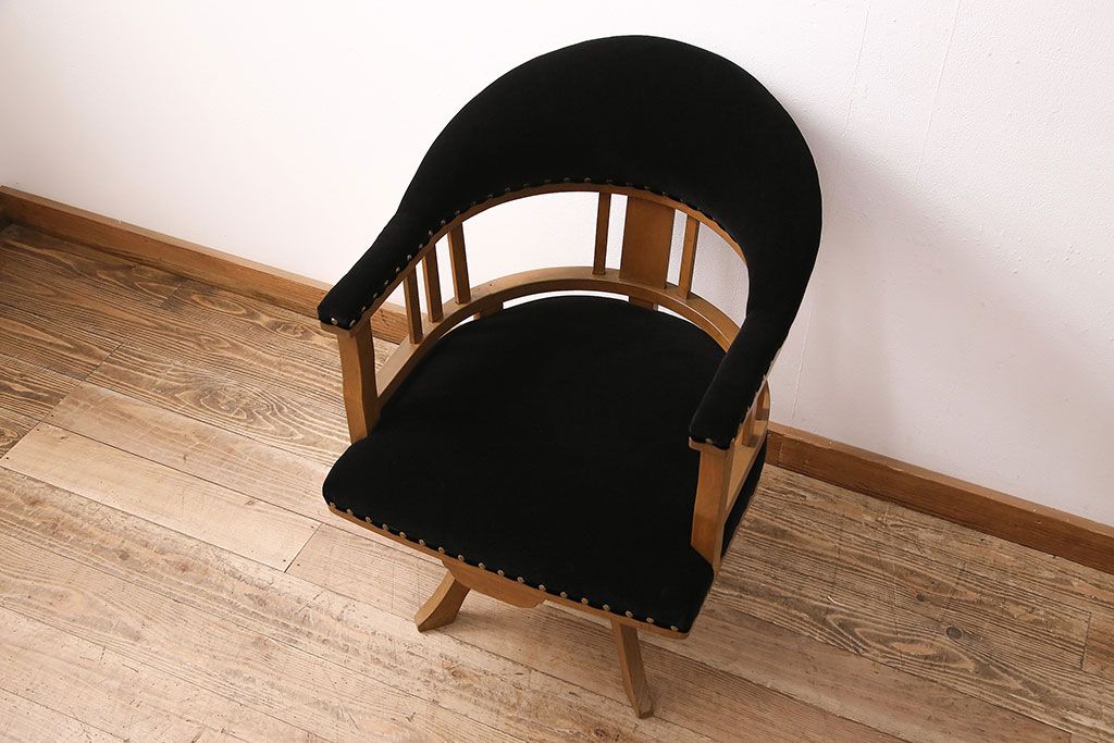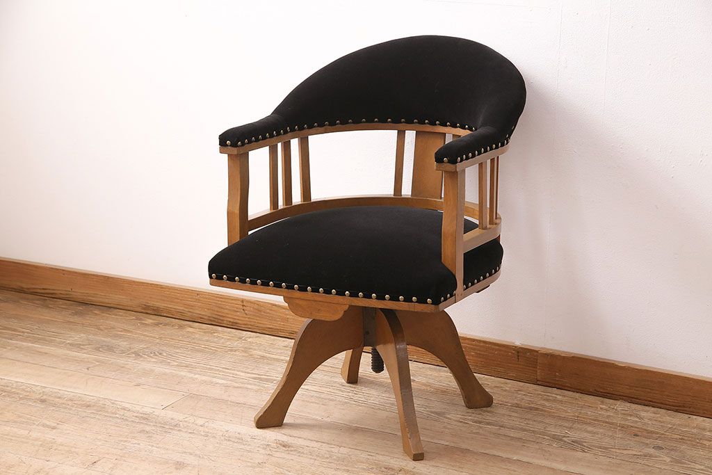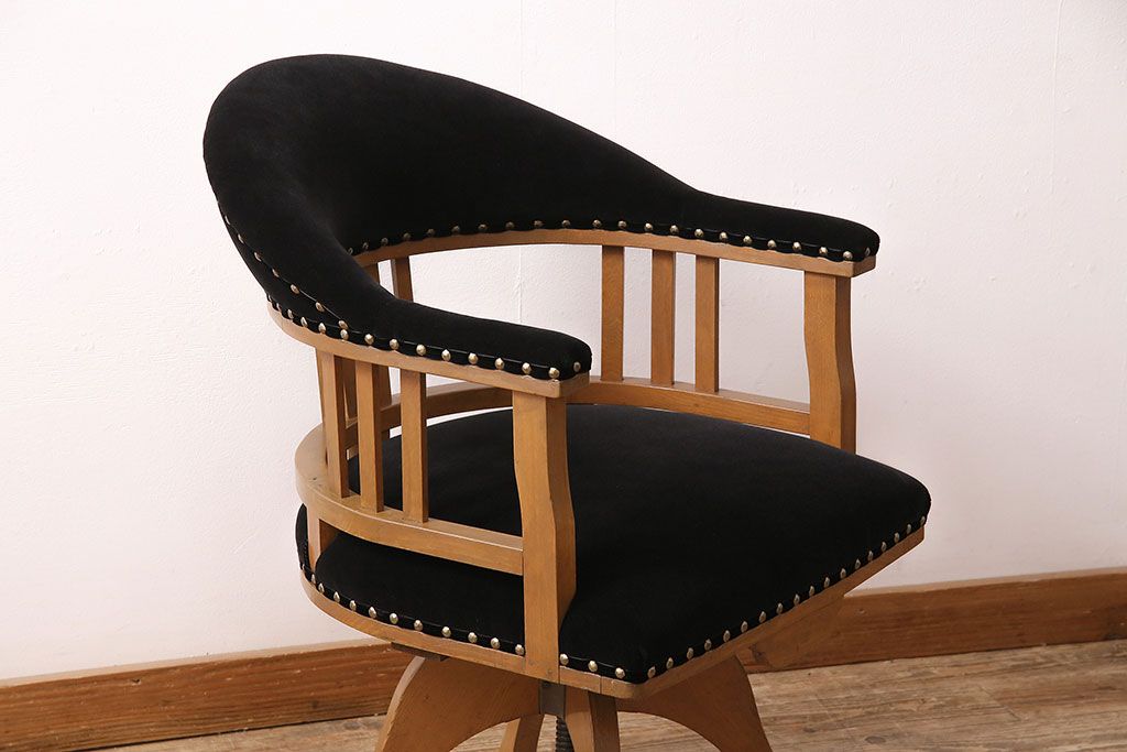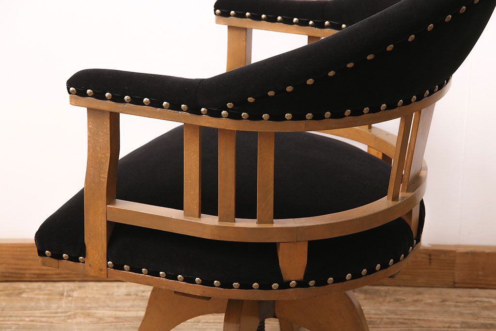 椅子・ベンチ> アームチェア > 和製アンティーク 黒いファブリックに鋲が打たれた、メンズライクなデザインが格好いい回転チェア(回転椅子、ドクターチェア、椅子)(R-037043)