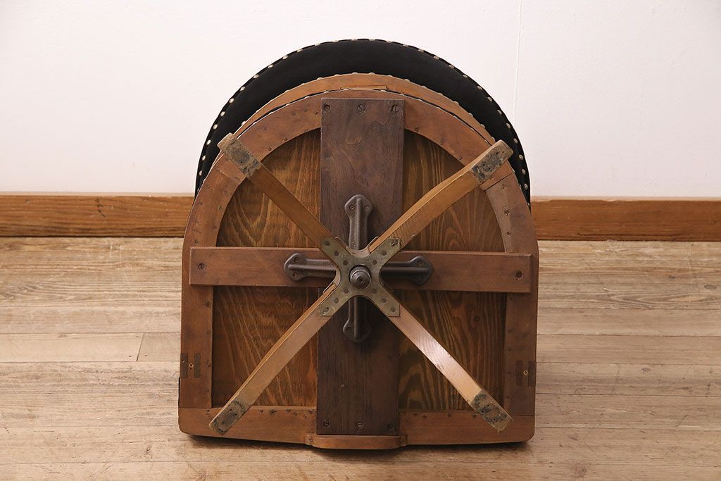 和製アンティーク 黒いファブリックに鋲が打たれた、メンズライクなデザインが格好いい回転チェア(回転椅子、ドクターチェア、椅子)(R-037043)