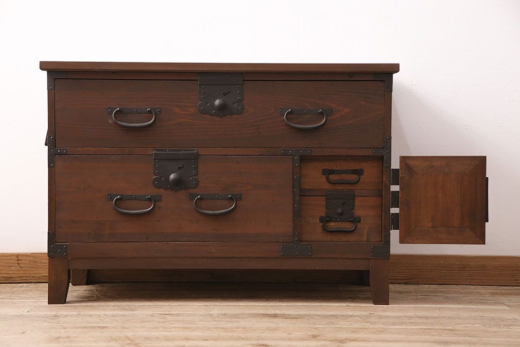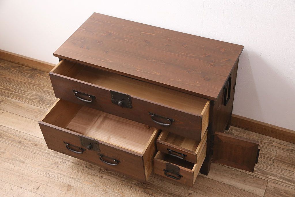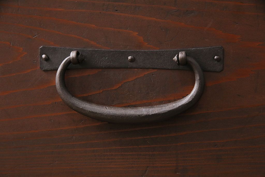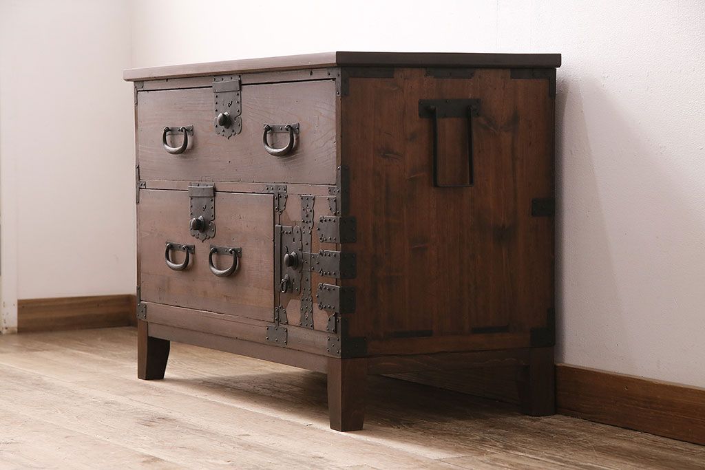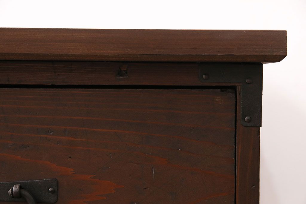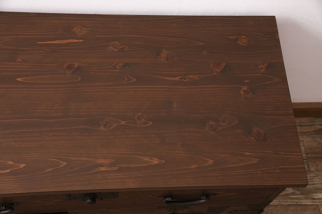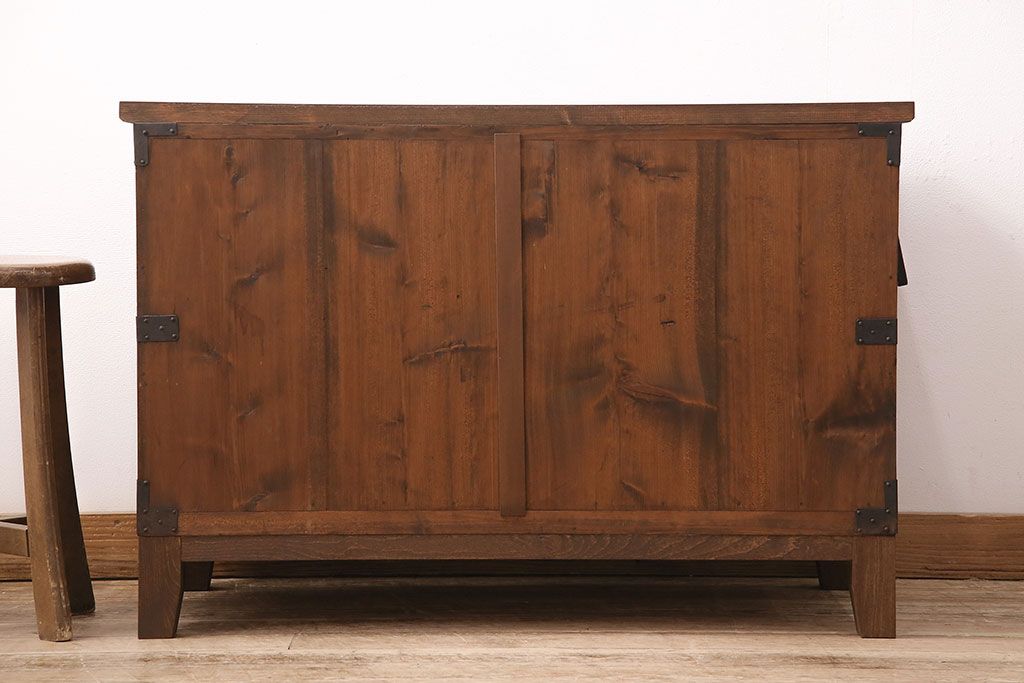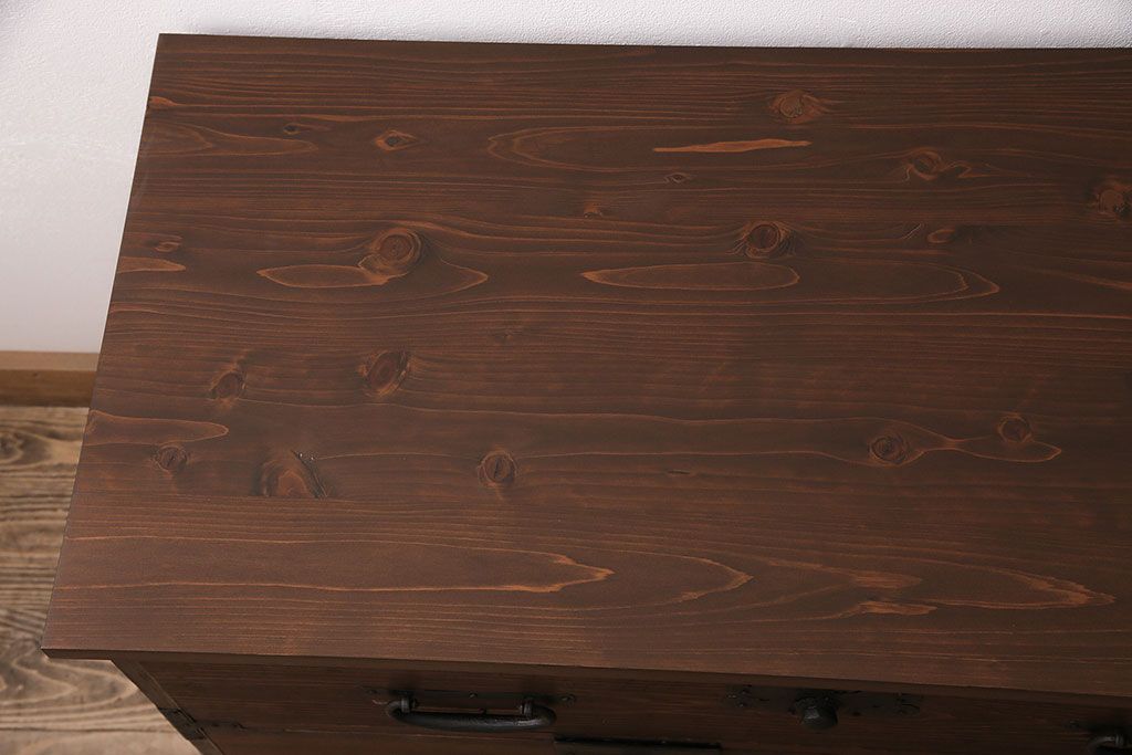 ラフジュ工房> キャビネット・戸棚> テレビ台・ローボード > 和製アンティーク ヒノキ材 天板・脚付きリメイク 経年による風合いが味わい深いローボード(テレビボード、テレビ台、引き出し、リビングボード)(R-048861)