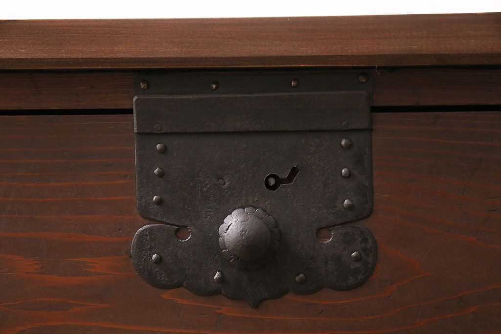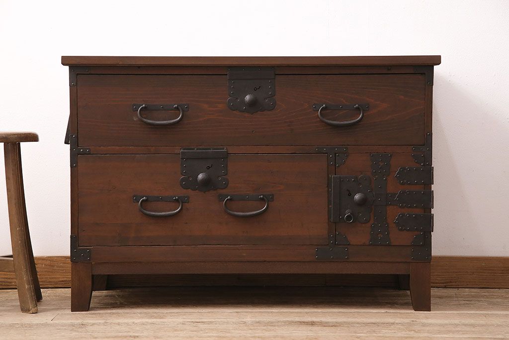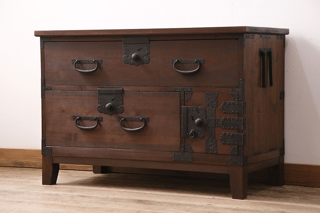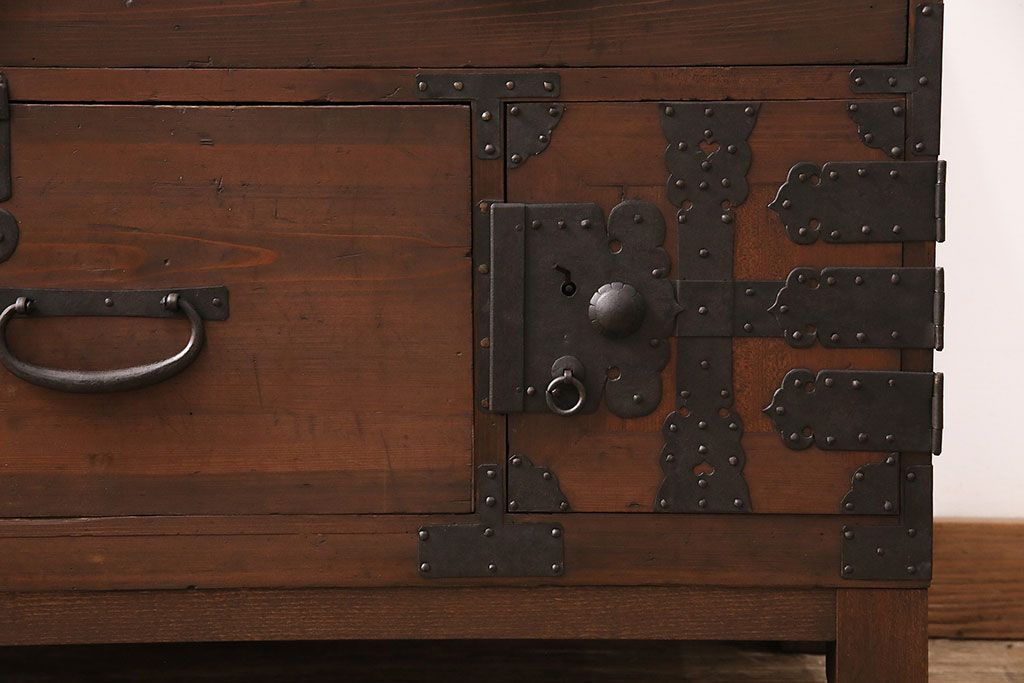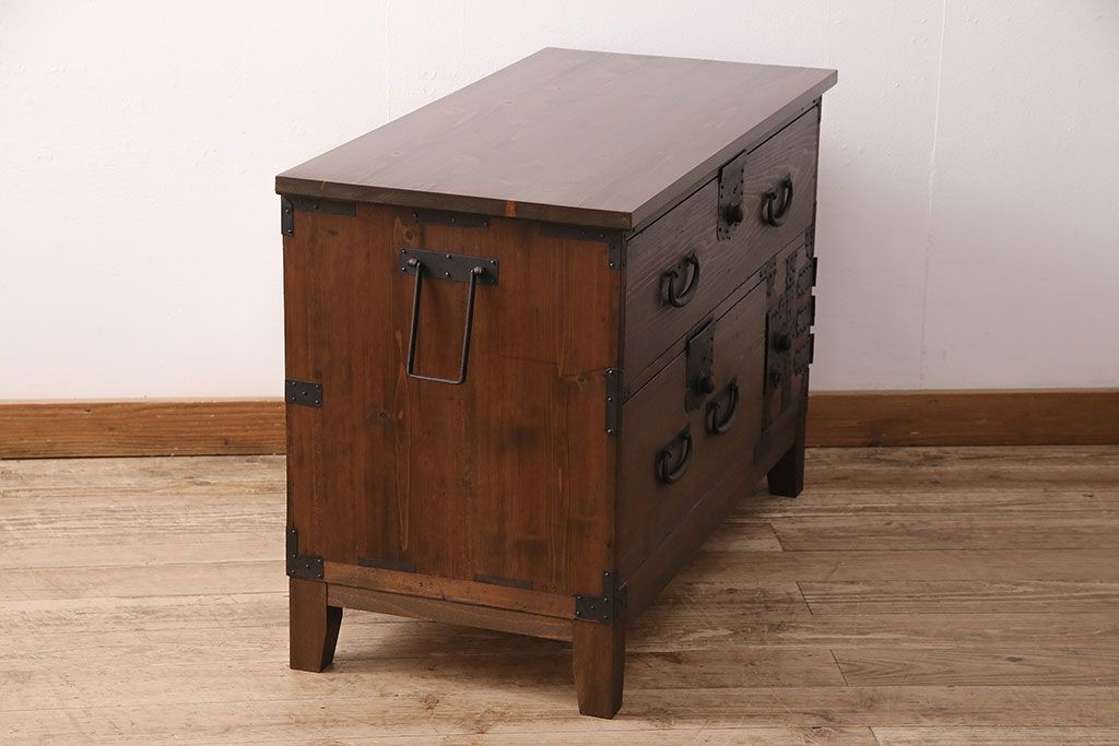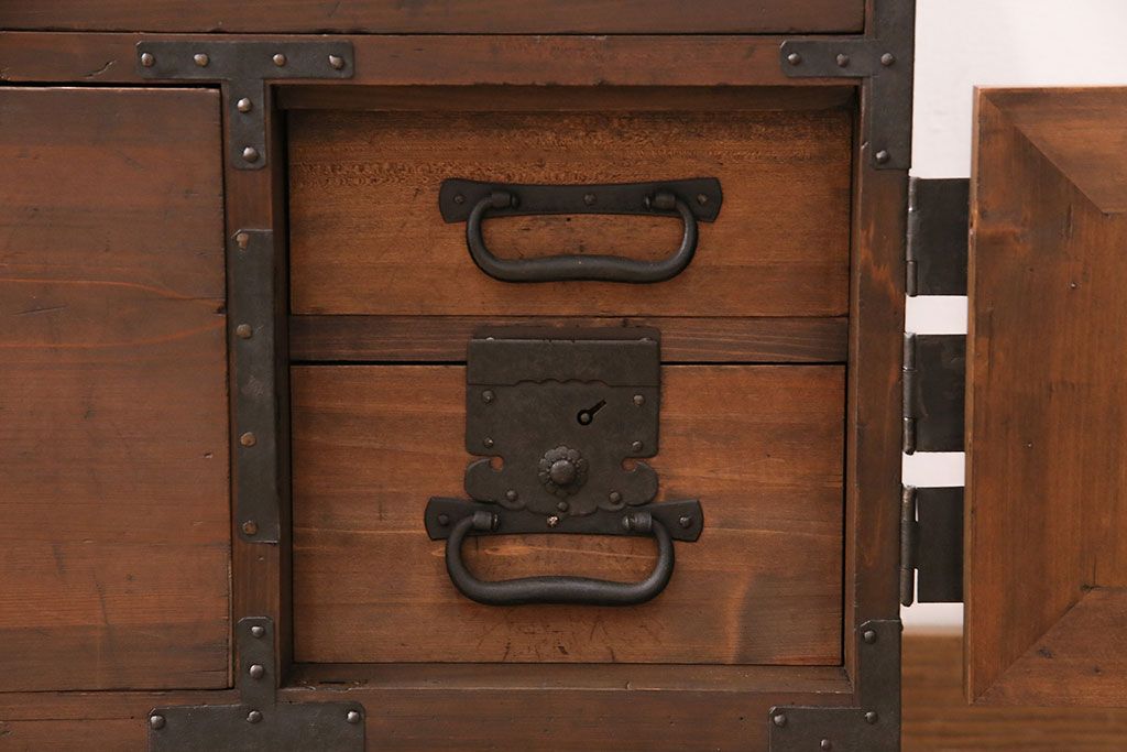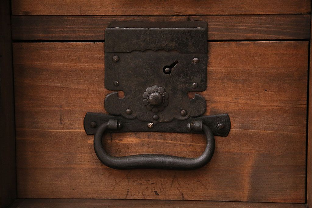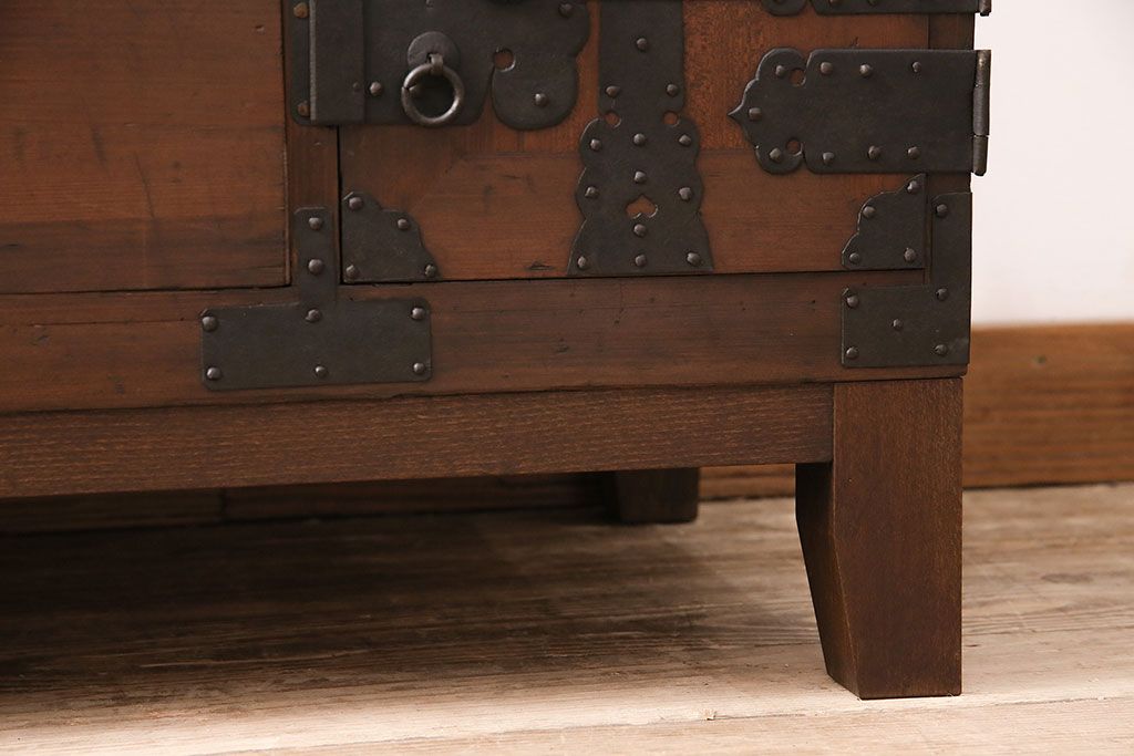 ラフジュ工房> キャビネット・戸棚> テレビ台・ローボード > 和製アンティーク ヒノキ材 天板・脚付きリメイク 経年による風合いが味わい深いローボード(テレビボード、テレビ台、引き出し、リビングボード)(R-048861)