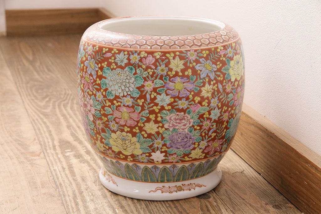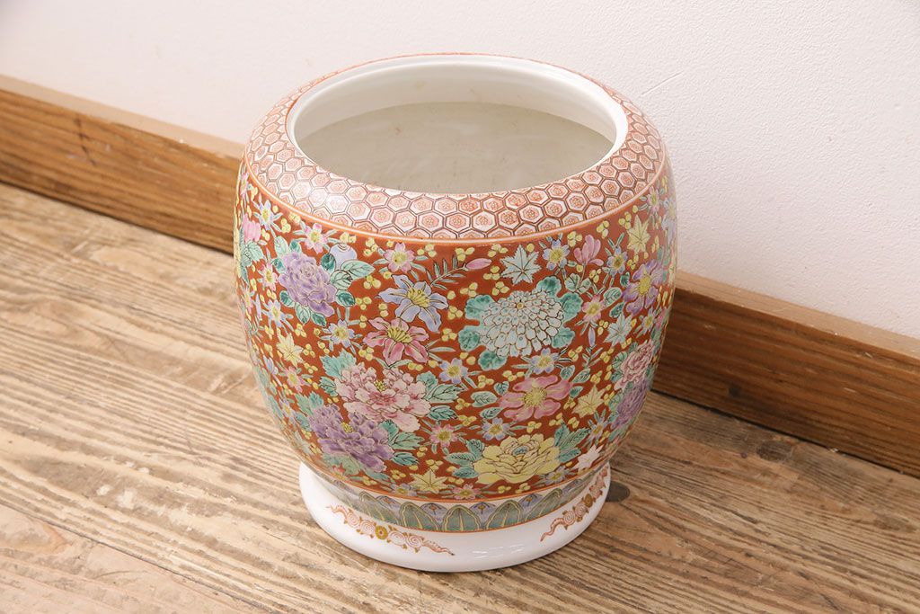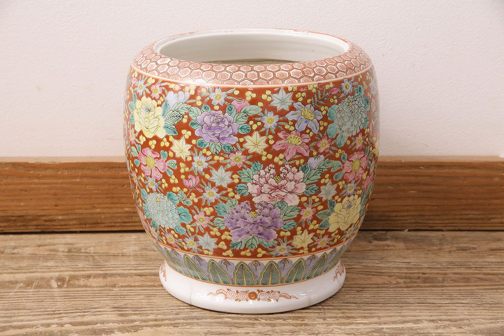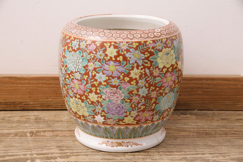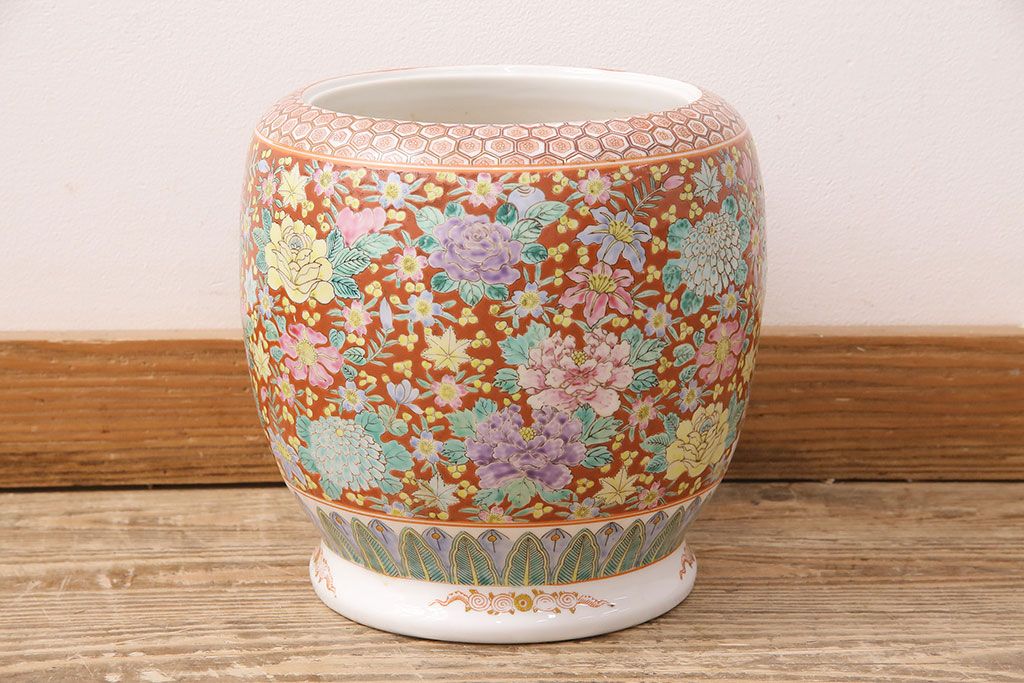 アンティーク雑貨 多彩な花尽くしの図が華やかな十錦手の瀬戸火鉢(鉢カバー)(R-048896)