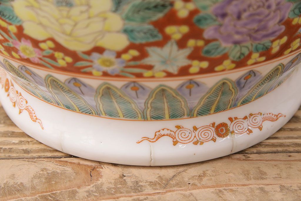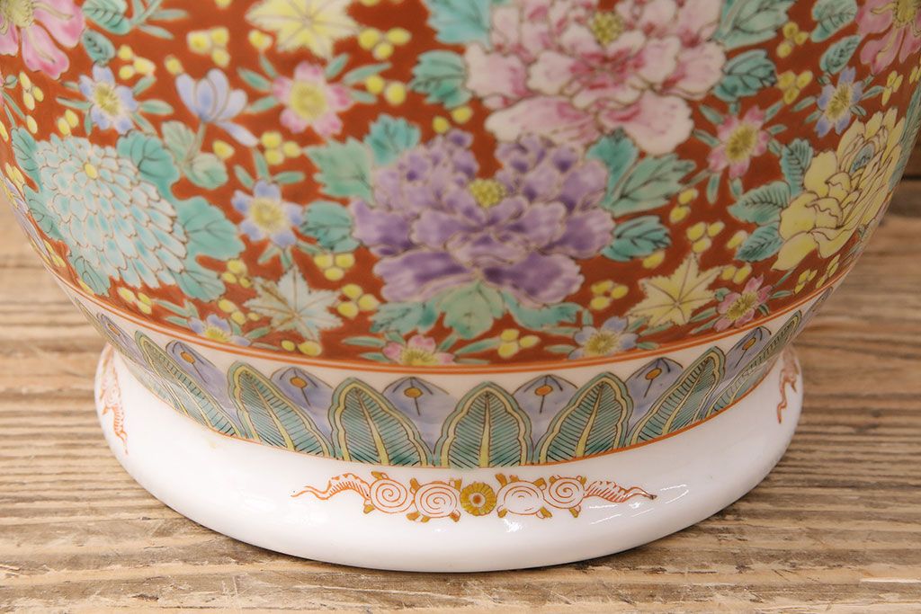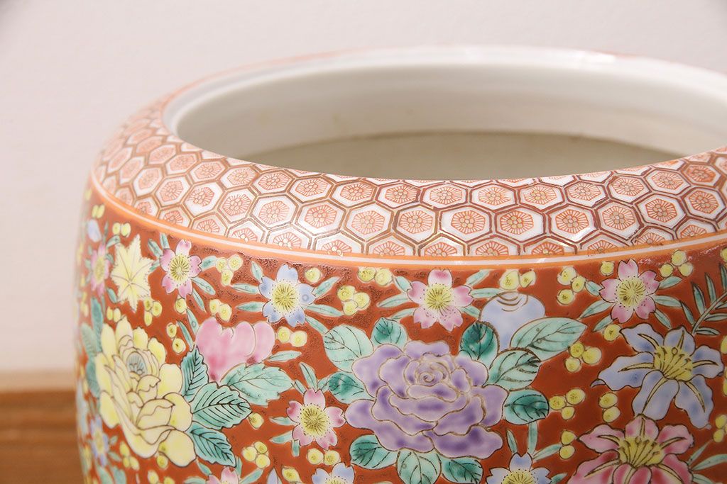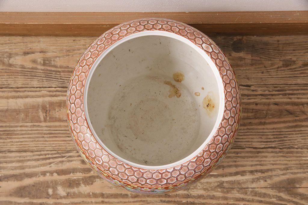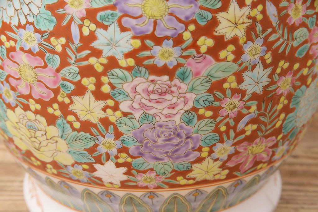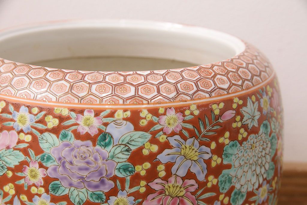 火鉢> 瀬戸火鉢 > アンティーク雑貨 多彩な花尽くしの図が華やかな十錦手の瀬戸火鉢(鉢カバー)(R-048896)