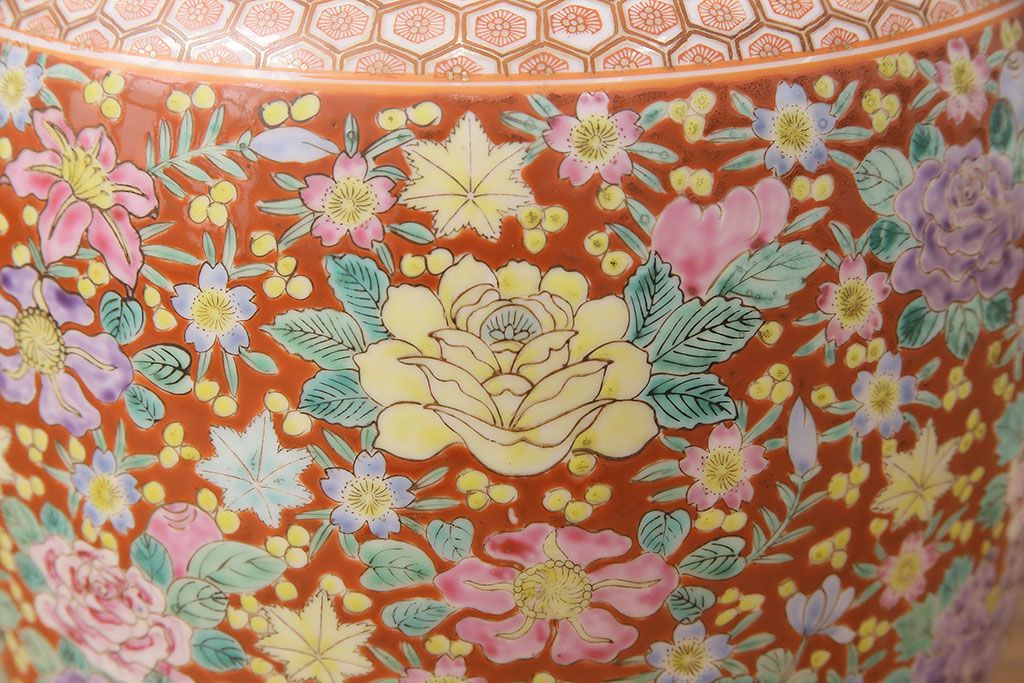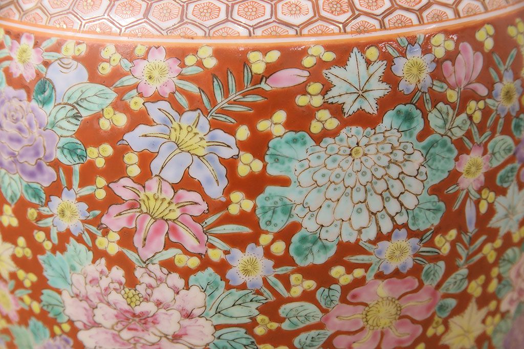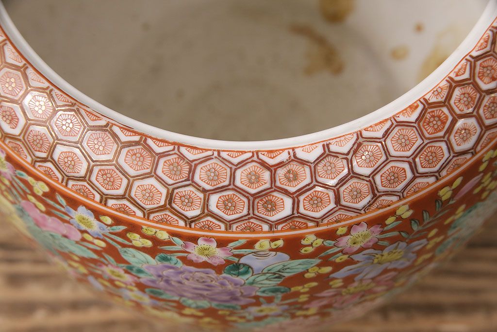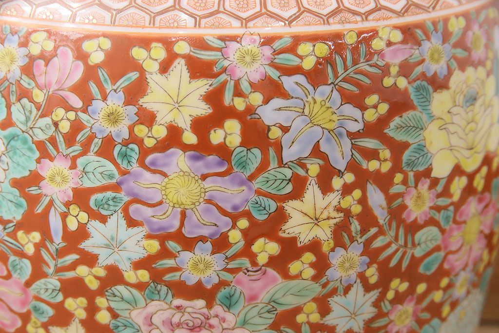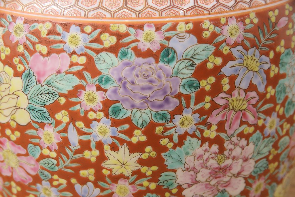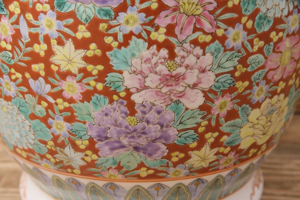 火鉢> 瀬戸火鉢 > アンティーク雑貨 多彩な花尽くしの図が華やかな十錦手の瀬戸火鉢(鉢カバー)(R-048896)