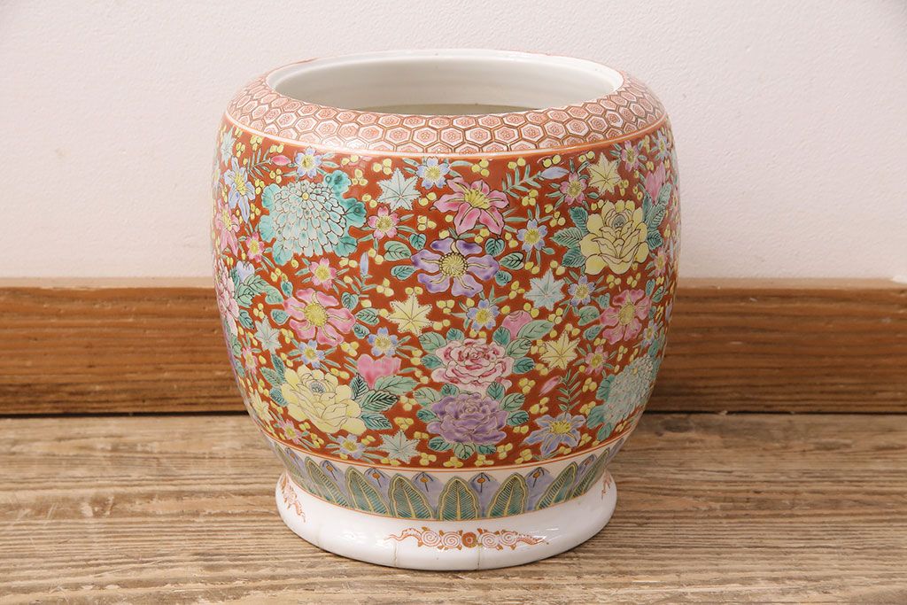 アンティーク雑貨 多彩な花尽くしの図が華やかな十錦手の瀬戸火鉢(鉢カバー)(R-048896)です。