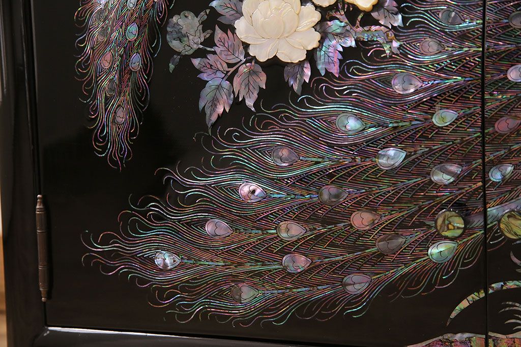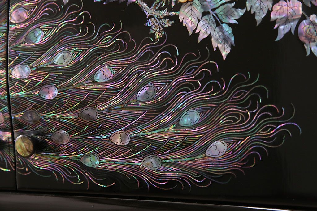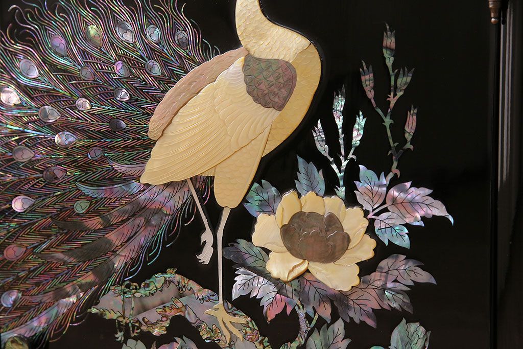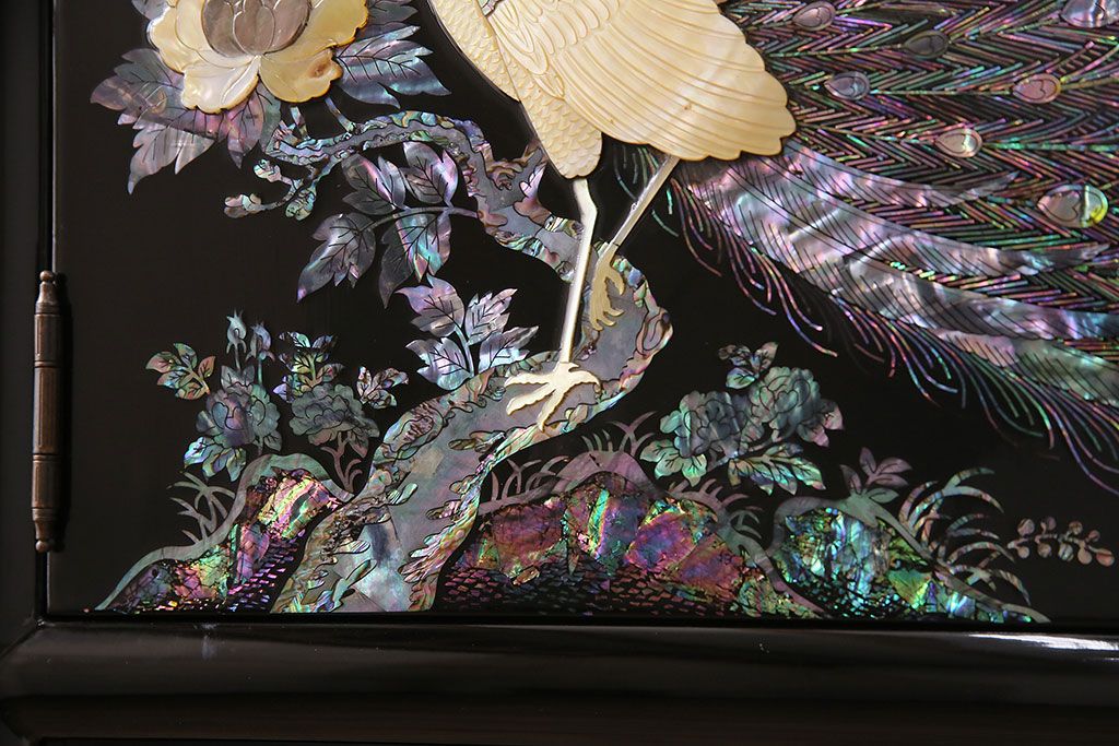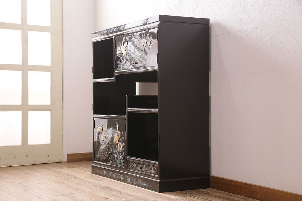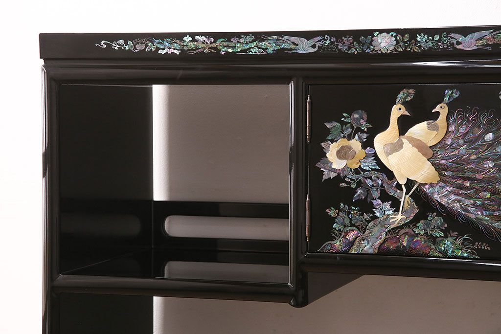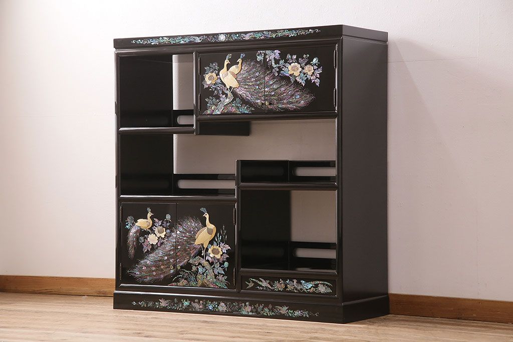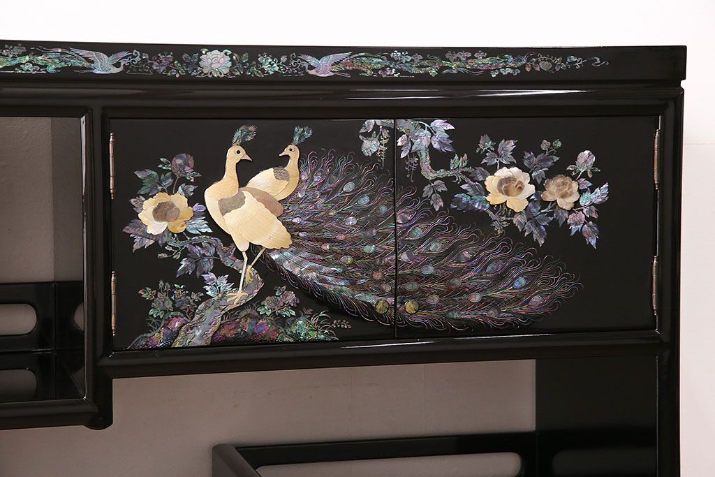 和箪笥 > 民芸家具 高級品 華やかな孔雀の螺鈿(らでん)細工が目を引く飾り棚(定価約90万円)(収納棚、茶棚)(R-048981)