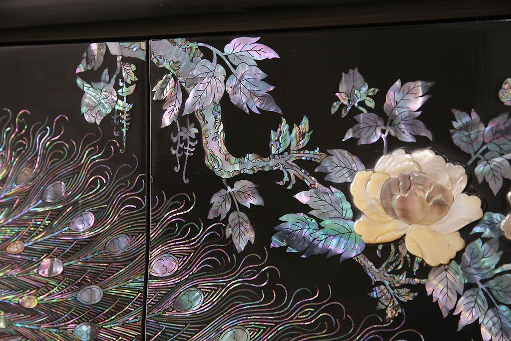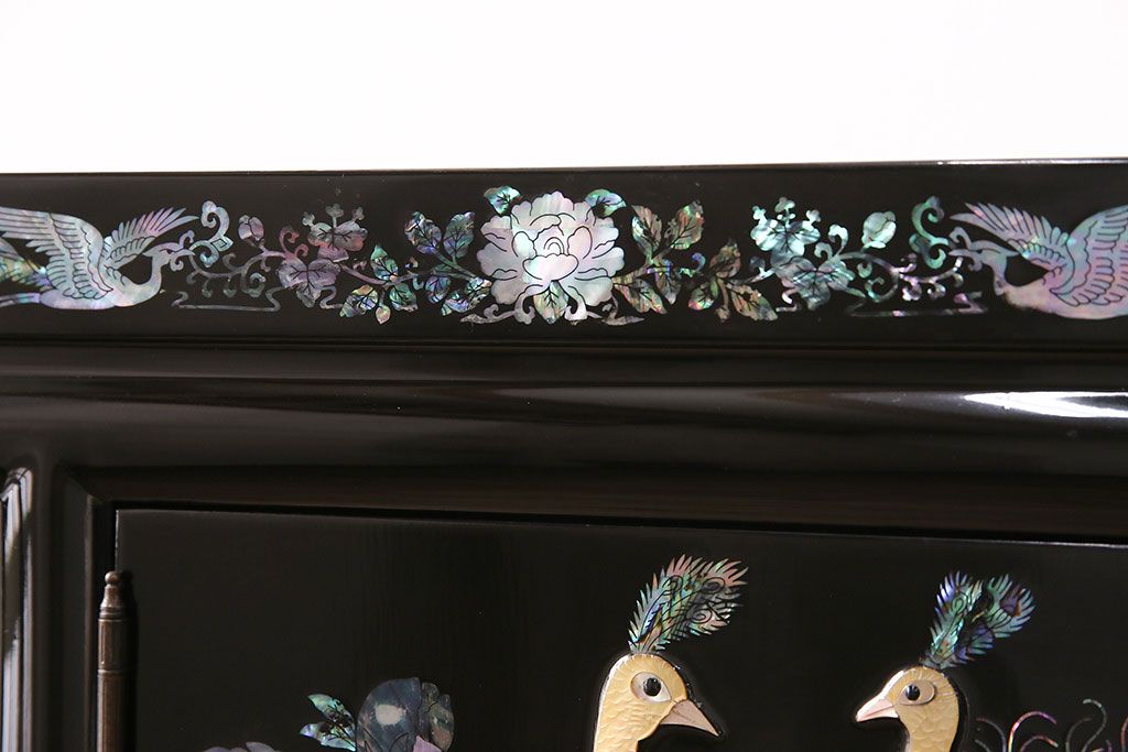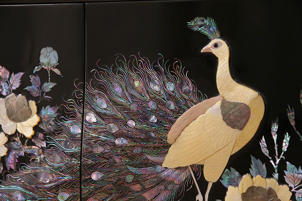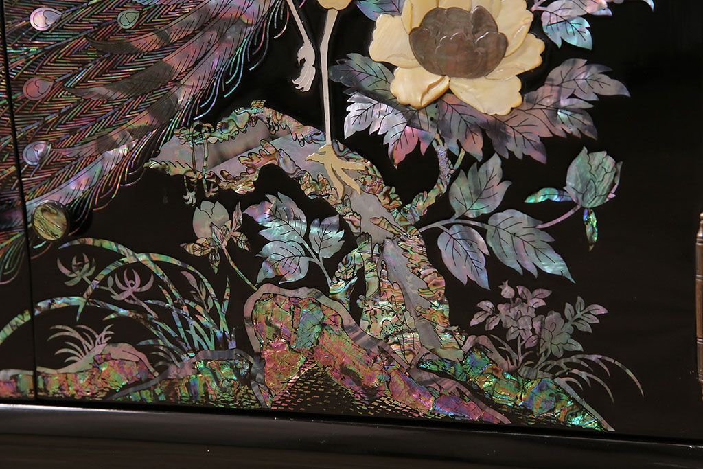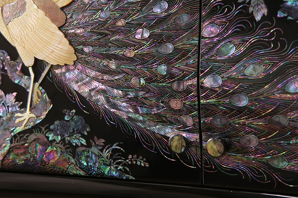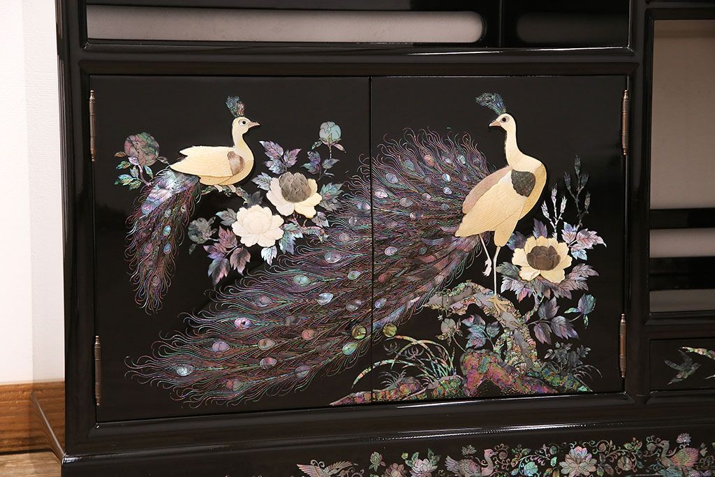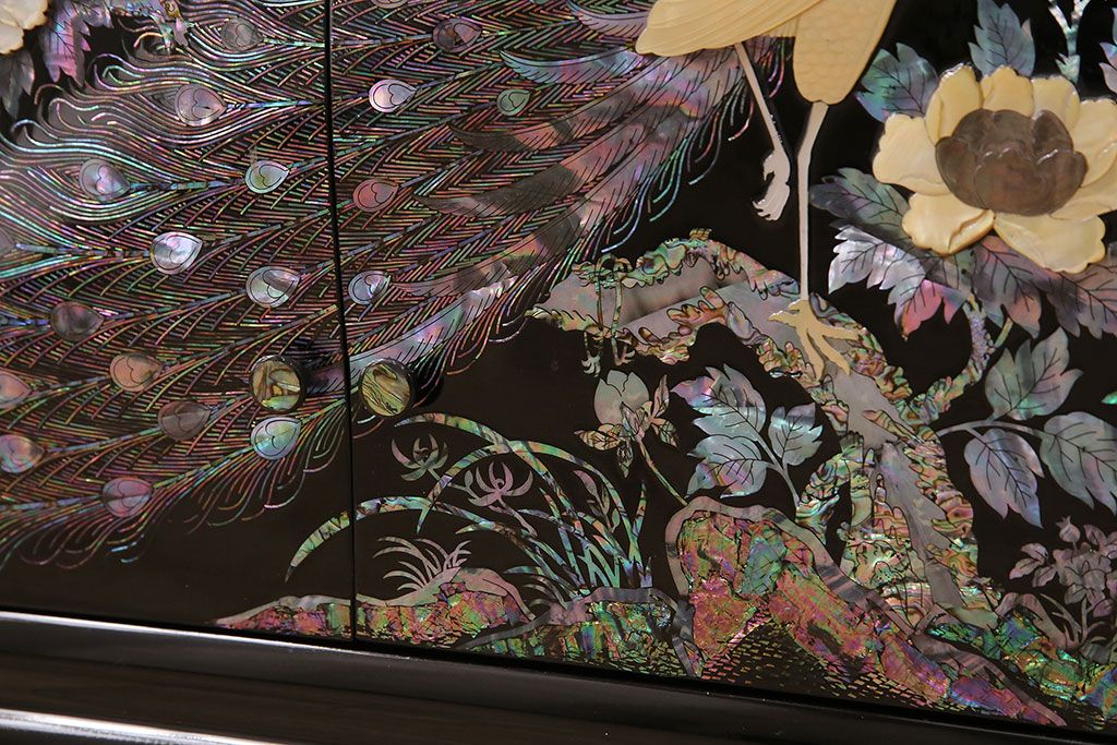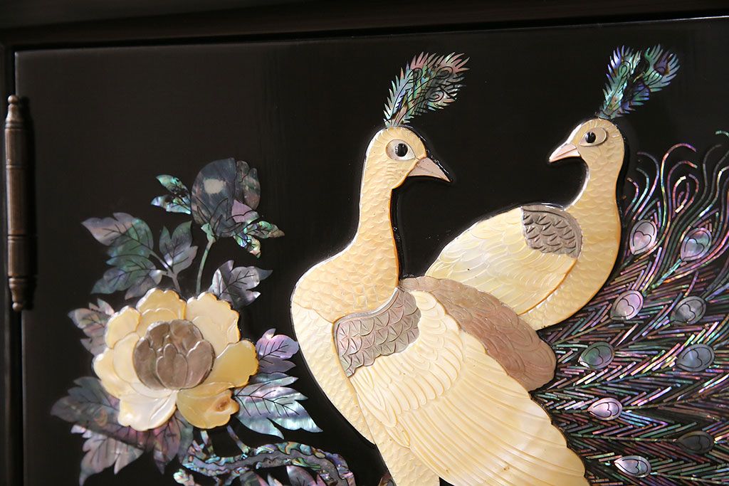 和箪笥 > 民芸家具 高級品 華やかな孔雀の螺鈿(らでん)細工が目を引く飾り棚(定価約90万円)(収納棚、茶棚)(R-048981)