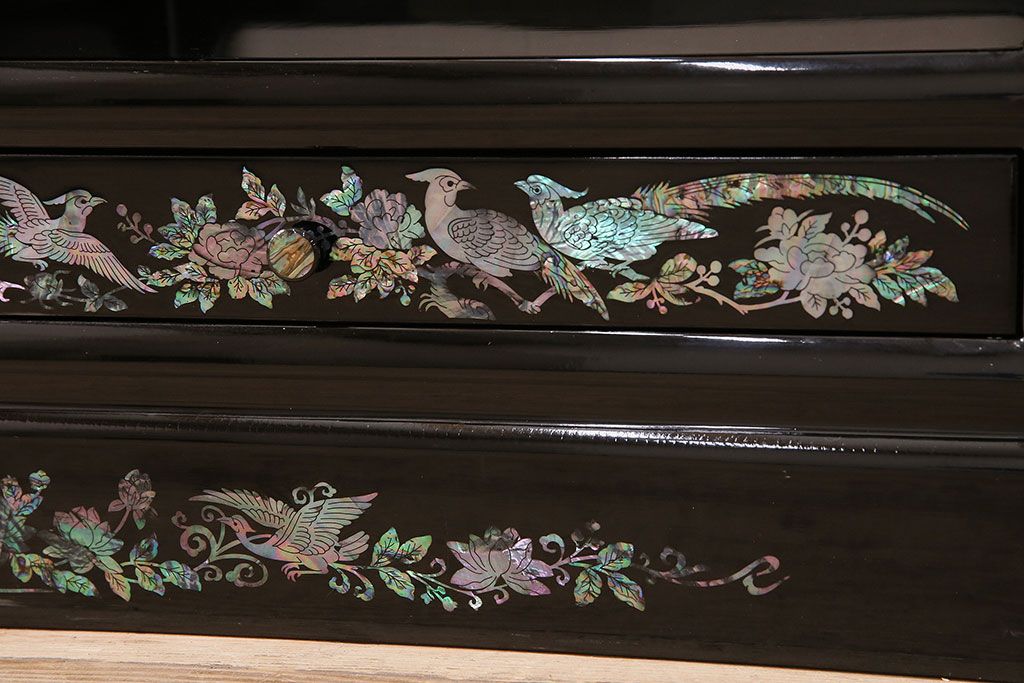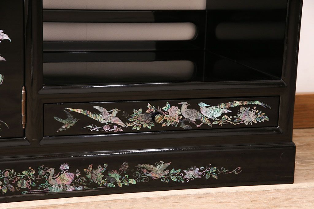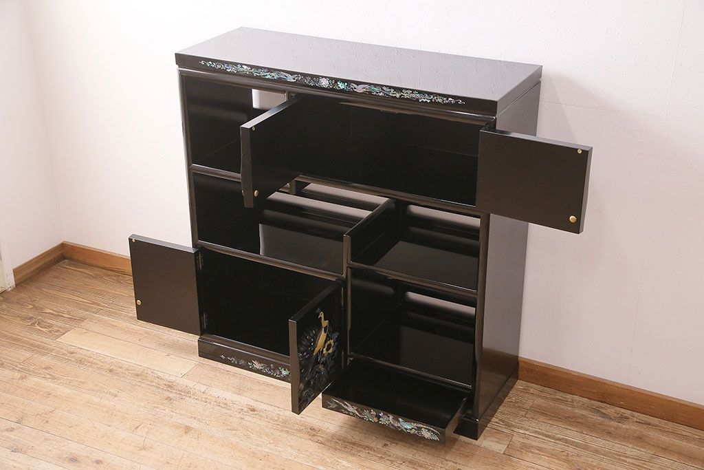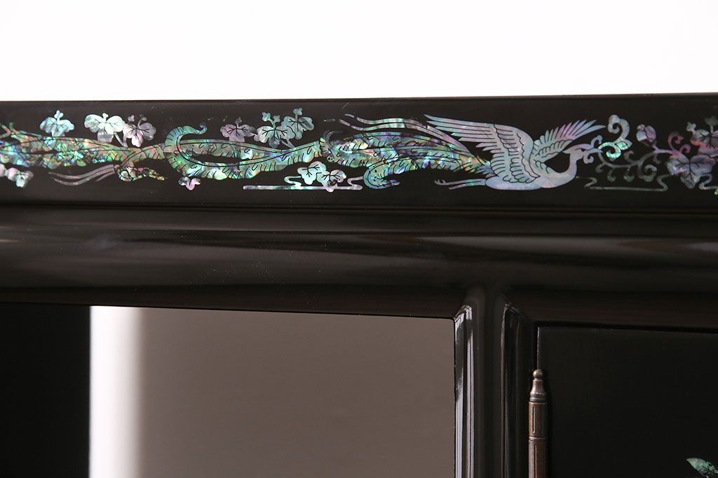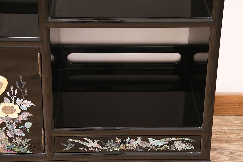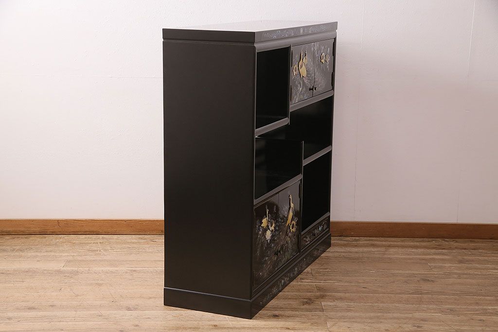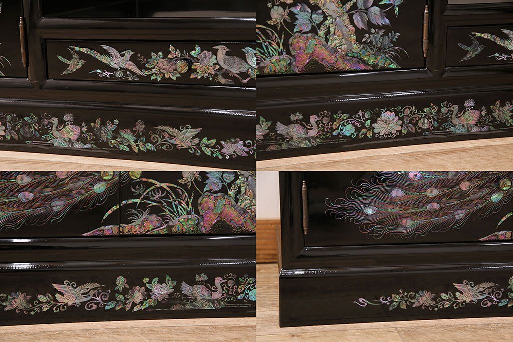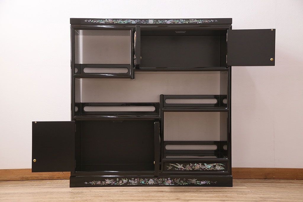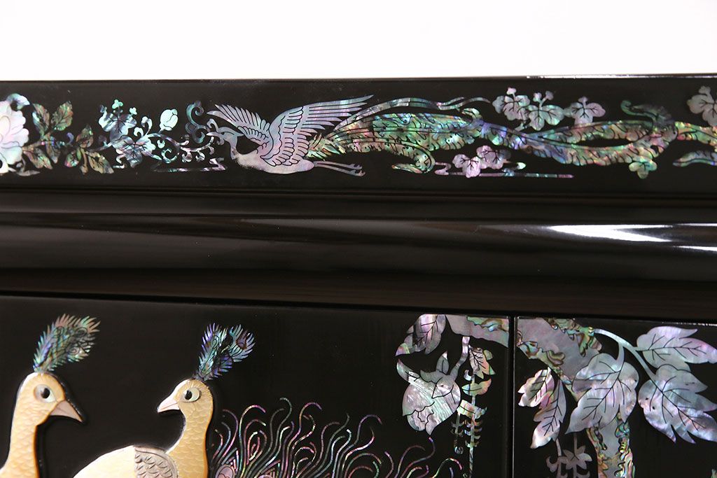 和箪笥 > 民芸家具 高級品 華やかな孔雀の螺鈿(らでん)細工が目を引く飾り棚(定価約90万円)(収納棚、茶棚)(R-048981)