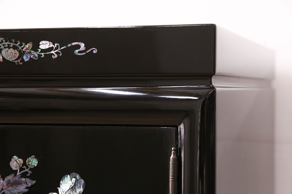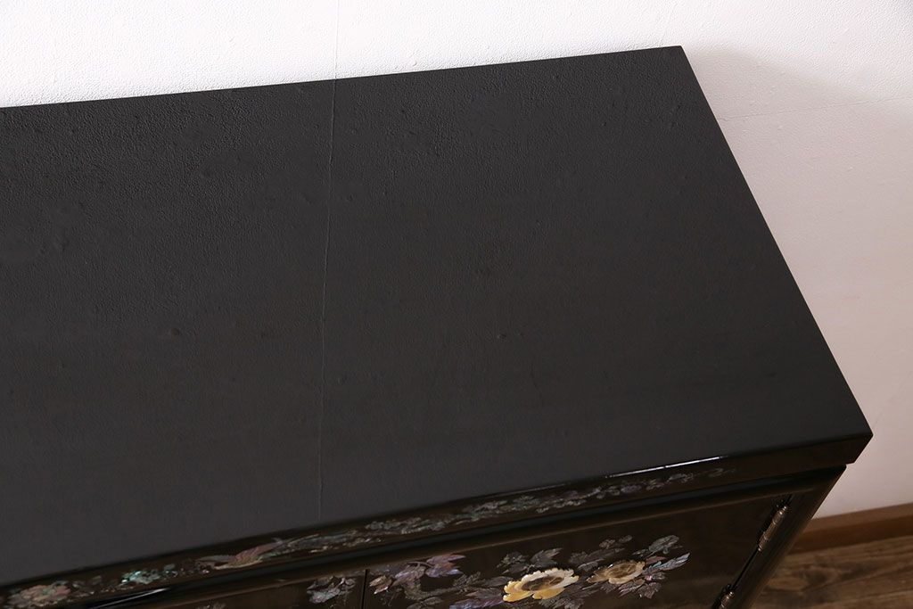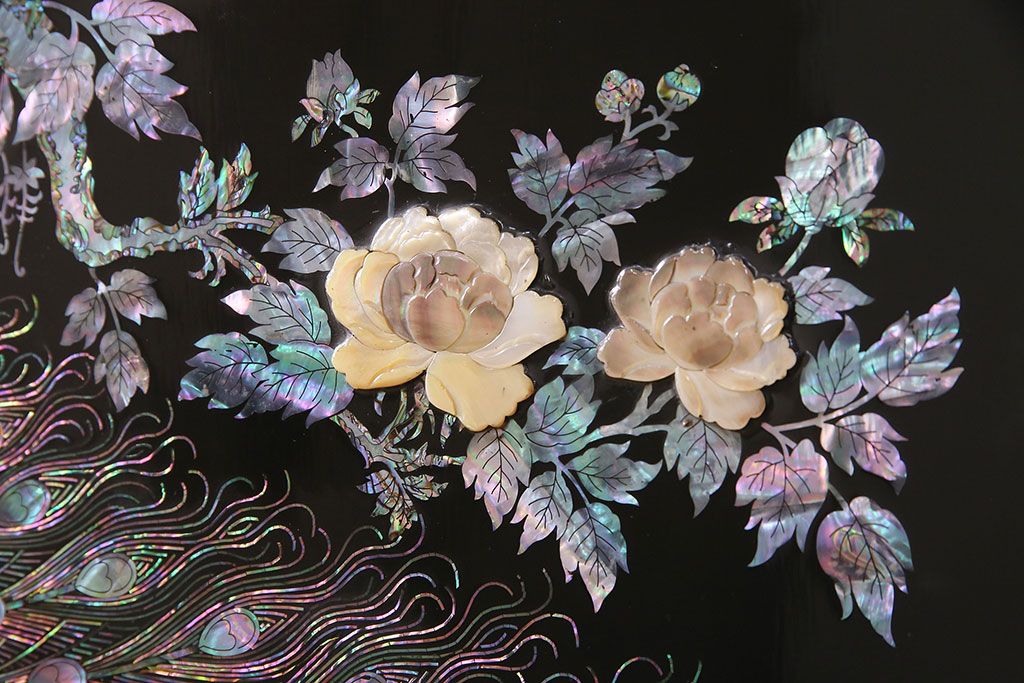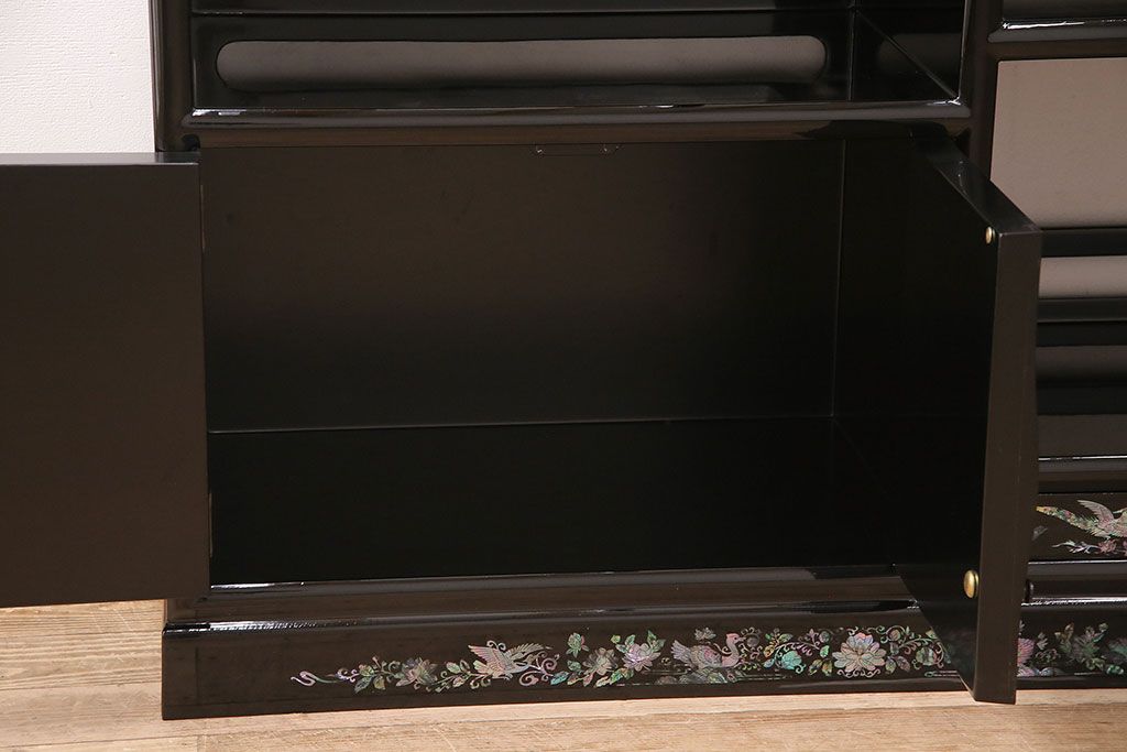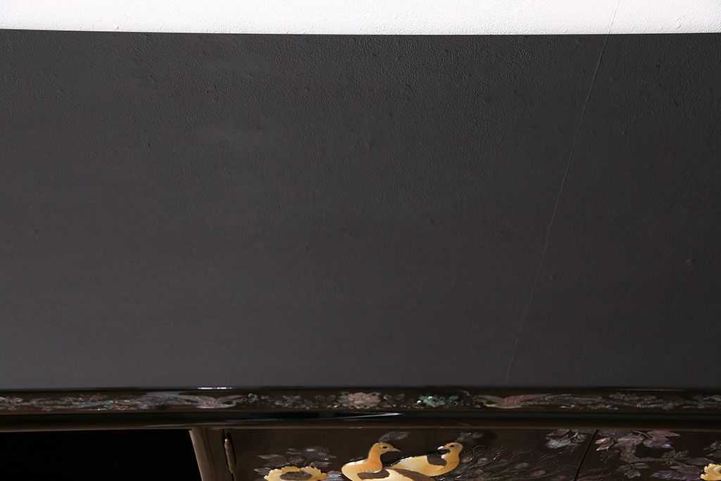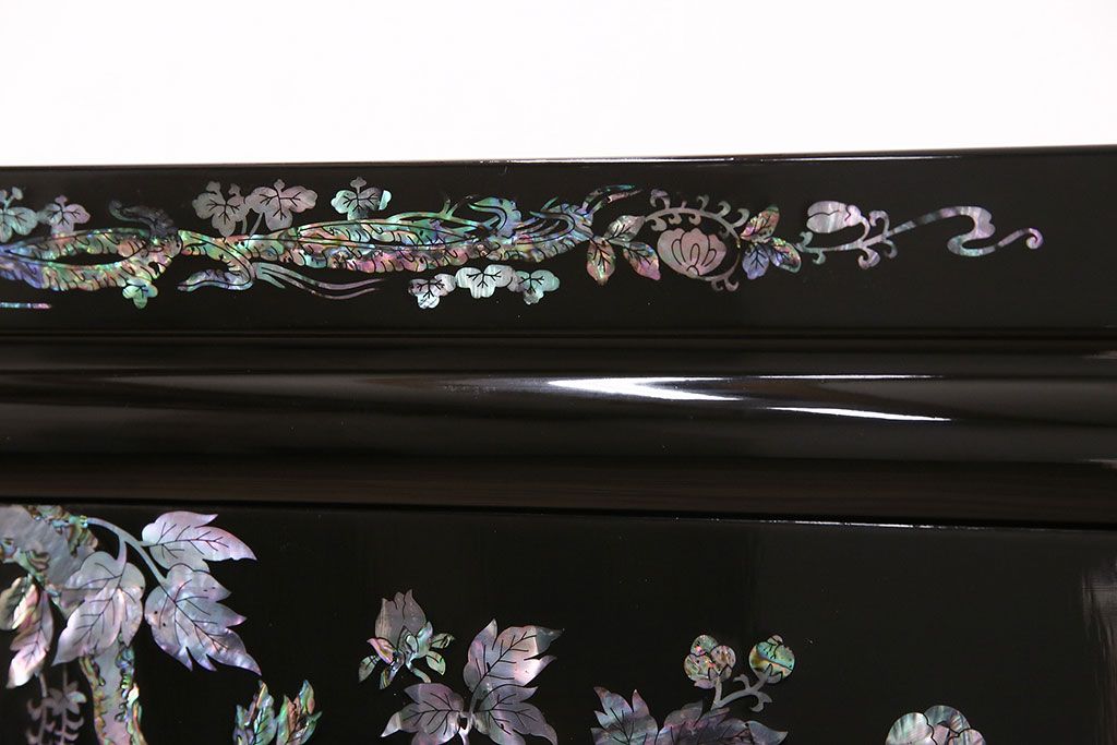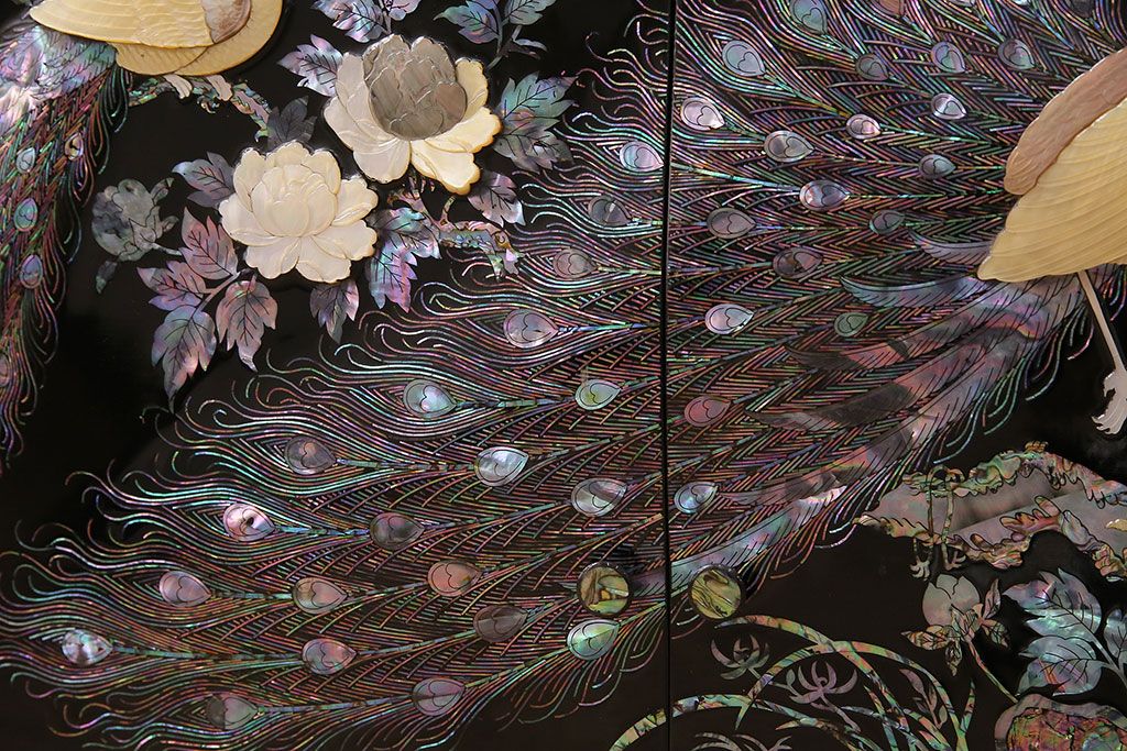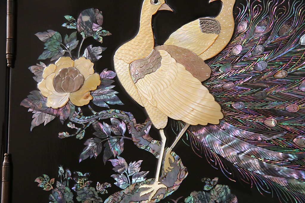 和箪笥 > 民芸家具 高級品 華やかな孔雀の螺鈿(らでん)細工が目を引く飾り棚(定価約90万円)(収納棚、茶棚)(R-048981)