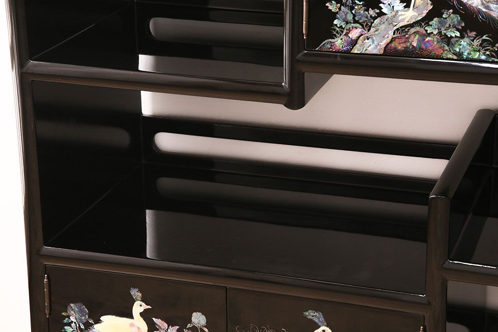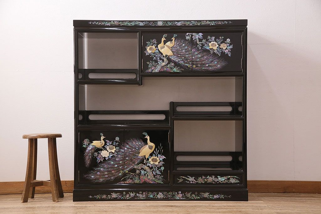 オープンラック・シェルフ> ディスプレイラック > 民芸家具 高級品 華やかな孔雀の螺鈿(らでん)細工が目を引く飾り棚(定価約90万円)(収納棚、茶棚)(R-048981)