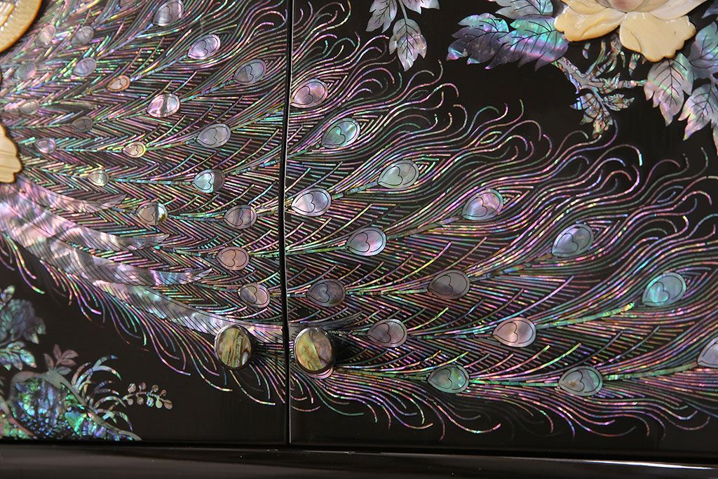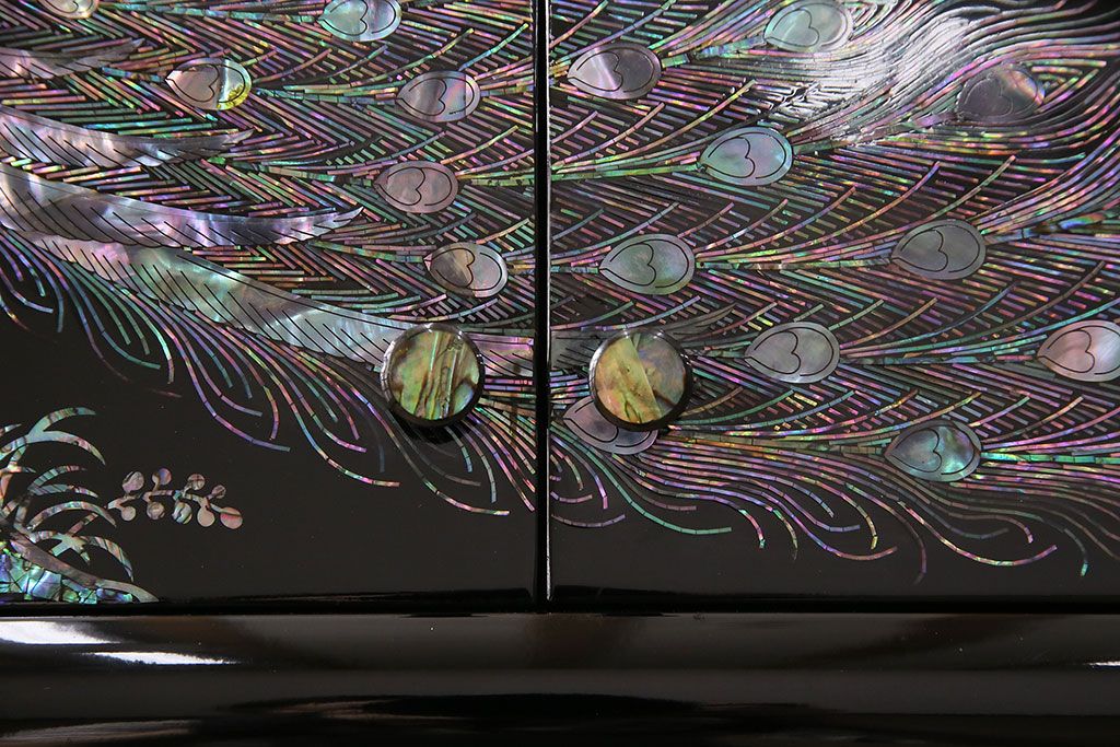 和箪笥> 茶箪笥・茶棚 > 民芸家具 高級品 華やかな孔雀の螺鈿(らでん)細工が目を引く飾り棚(定価約90万円)(収納棚、茶棚)(R-048981)