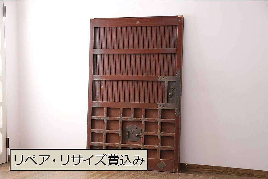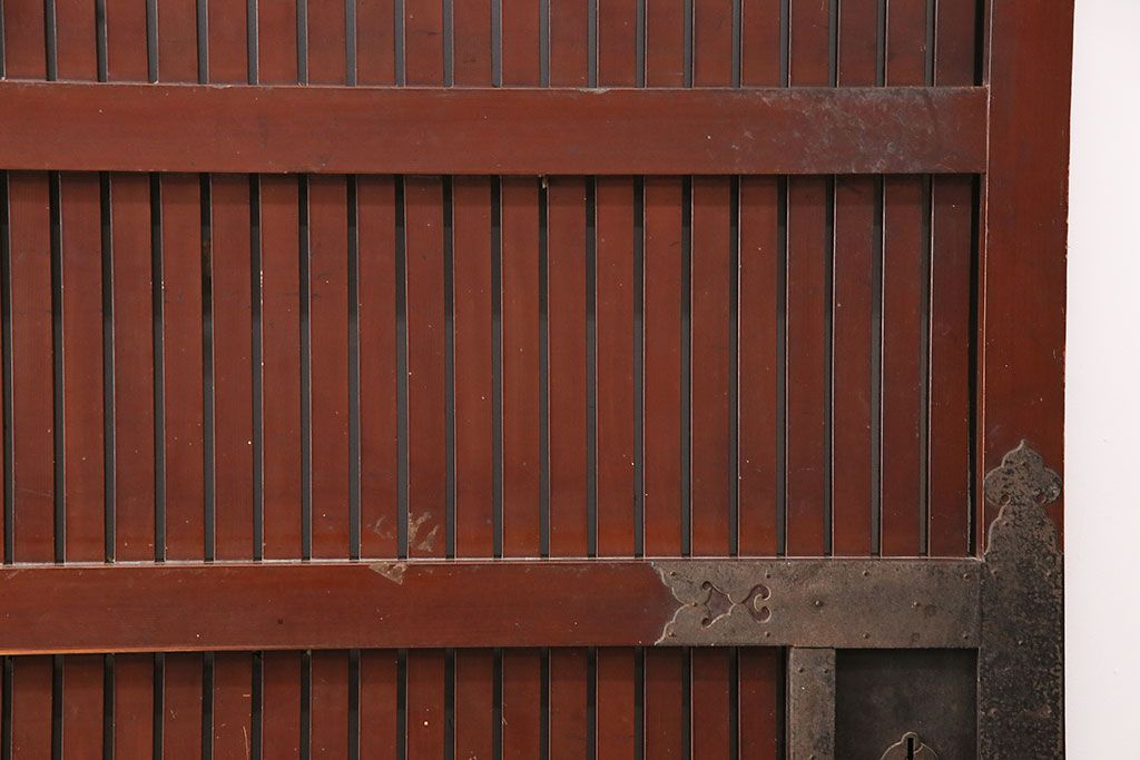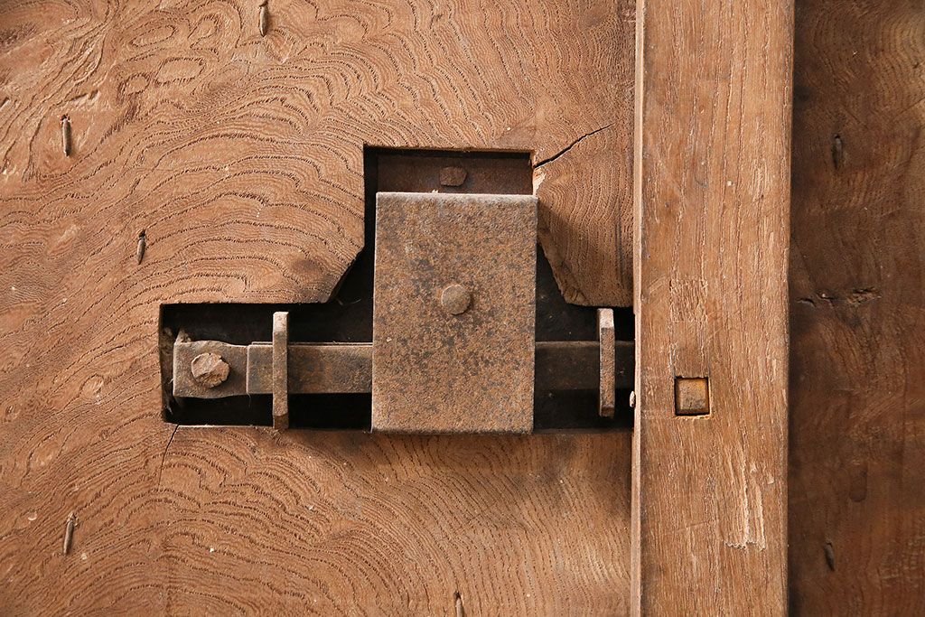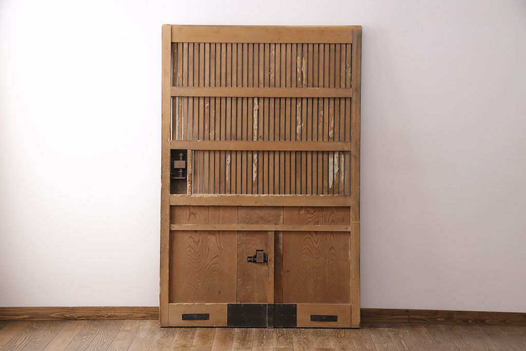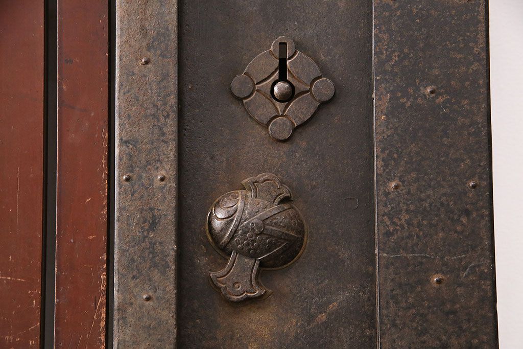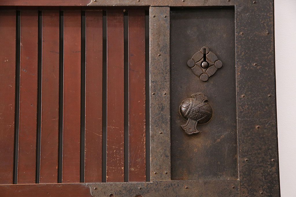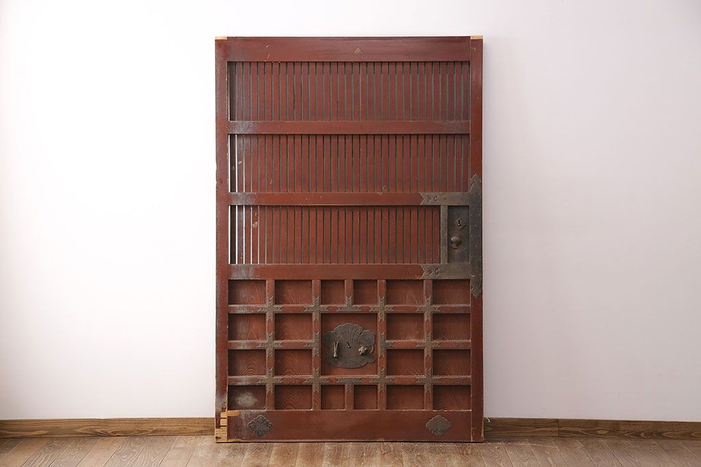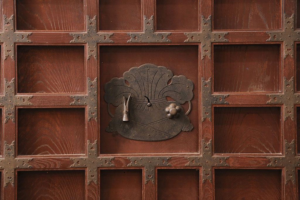 ドア・建具> 蔵戸 > アンティーク建具 石川県産 ヒノキ材・腰板ケヤキ材 巾着金具付き!高級感と品が漂う蔵戸(引き戸、玄関戸)(R-048586)