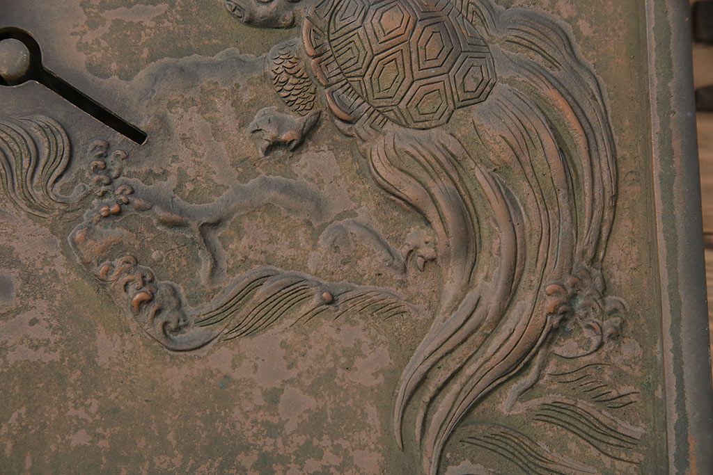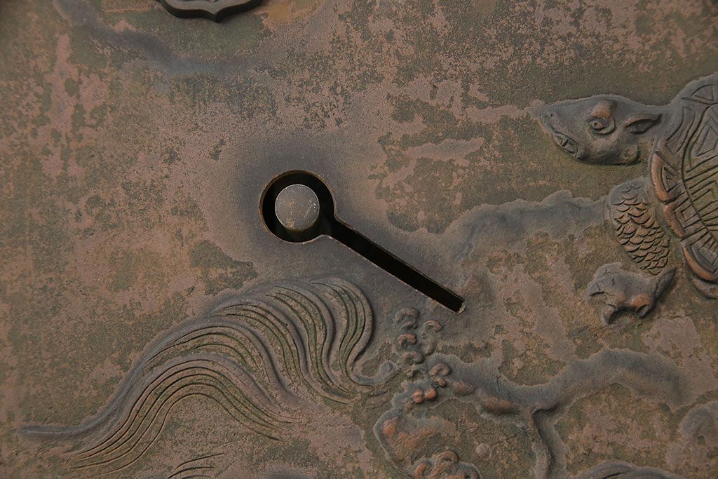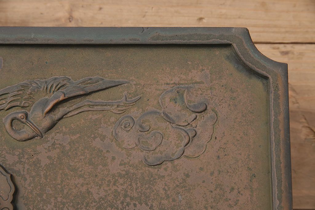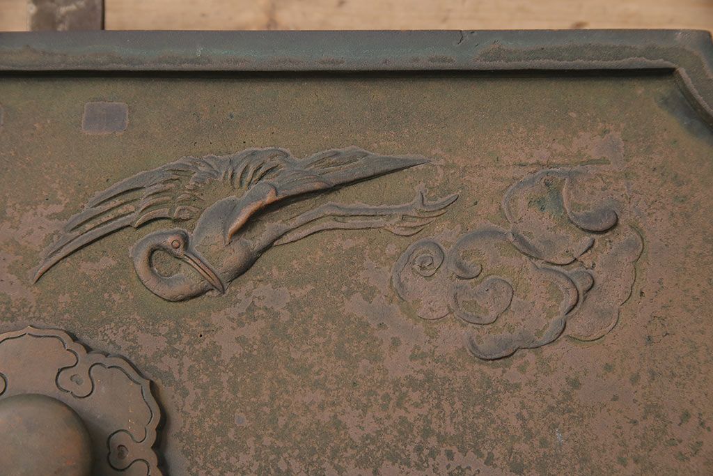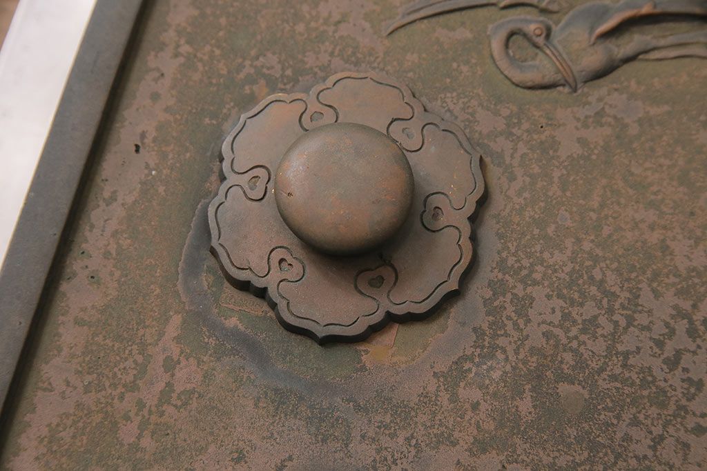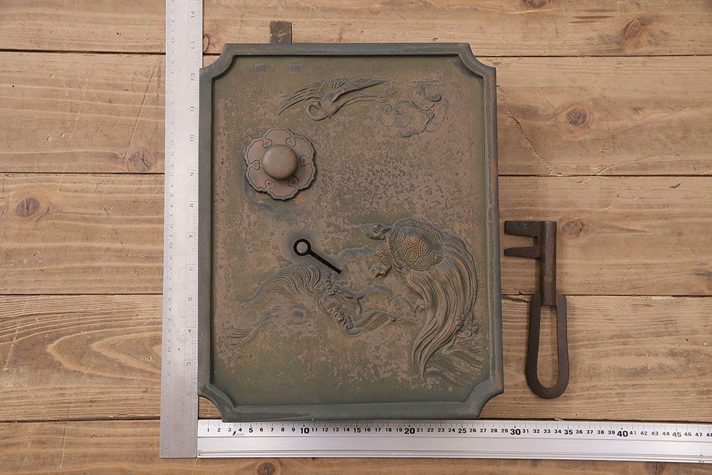アンティーク雑貨 鶴と亀 銅ならではの風合いが魅力的な蔵戸の錠前金具(ディスプレイ雑貨、蔵戸パーツ)(R-048759)