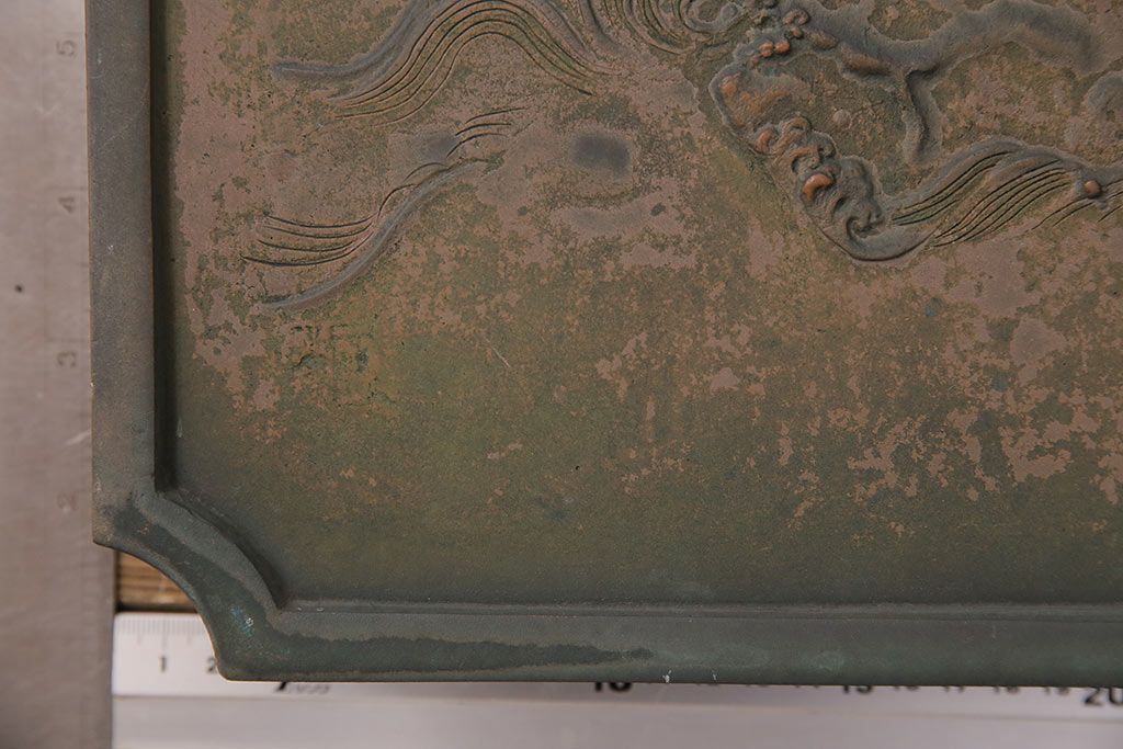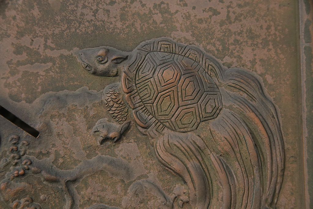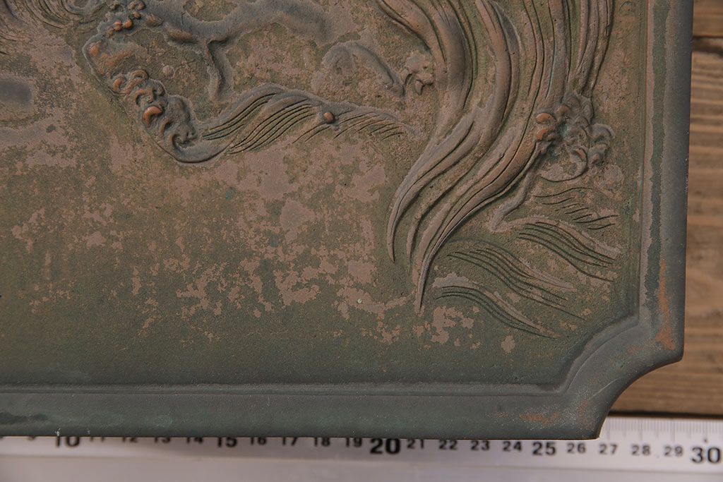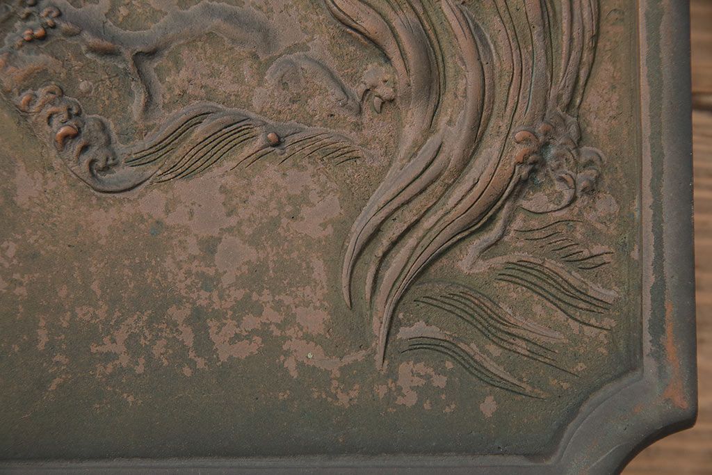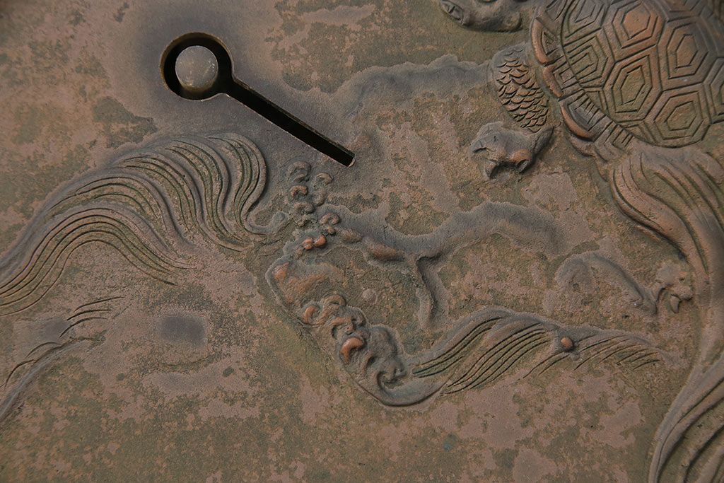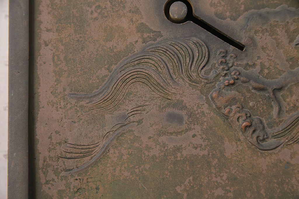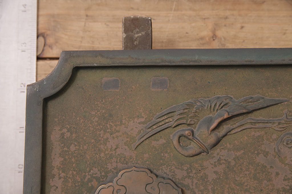 アンティーク雑貨 鶴と亀 銅ならではの風合いが魅力的な蔵戸の錠前金具(ディスプレイ雑貨、蔵戸パーツ)(R-048759)