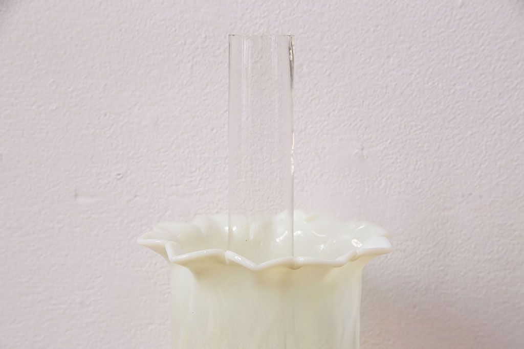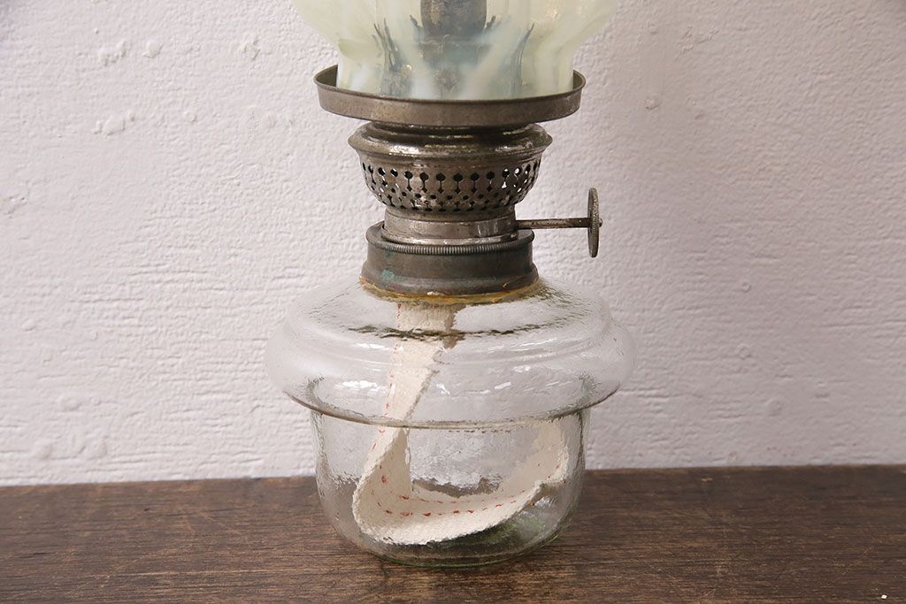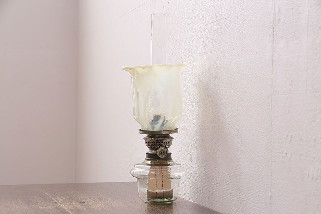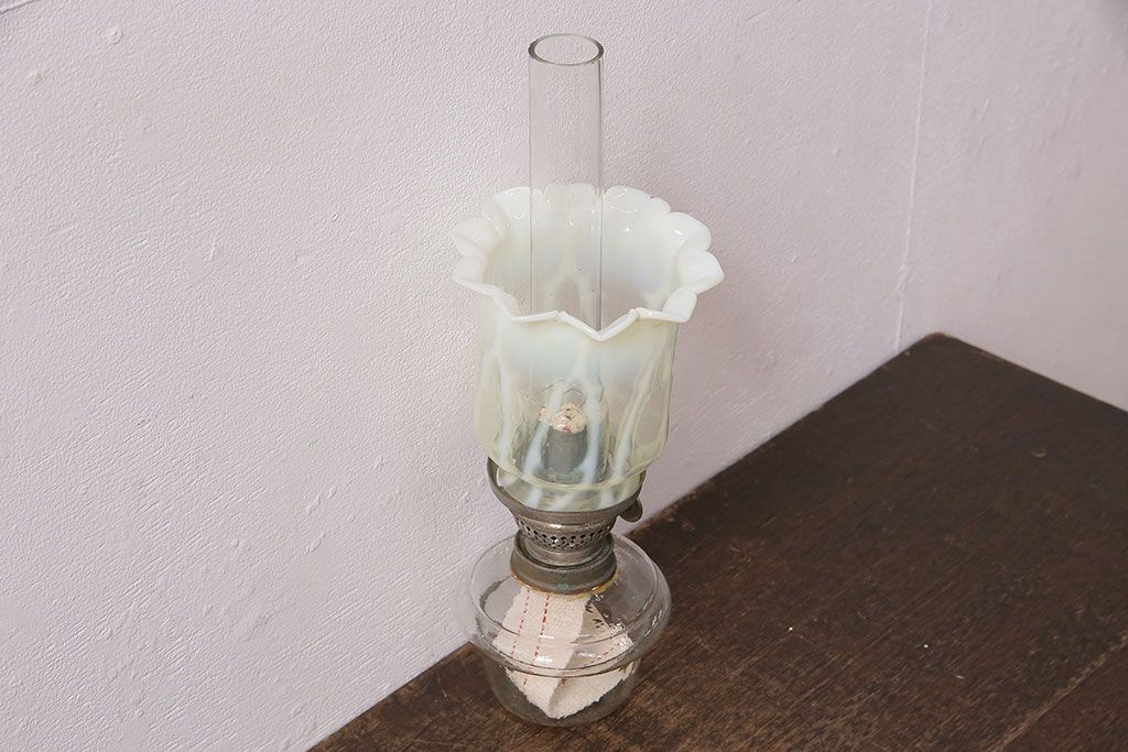 ヴィンテージ雑貨 巻き芯10番 ウランガラス 花びらのようなデザインが可愛らしいオイルランプ(卓上ランプ、油壺、テーブルランプ、ビンテージ)(R-048797)