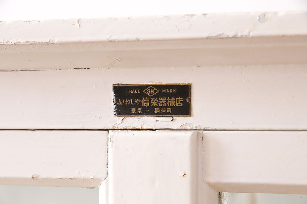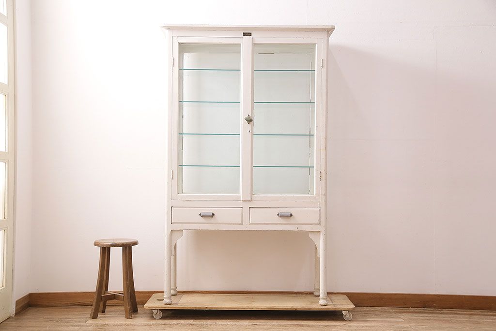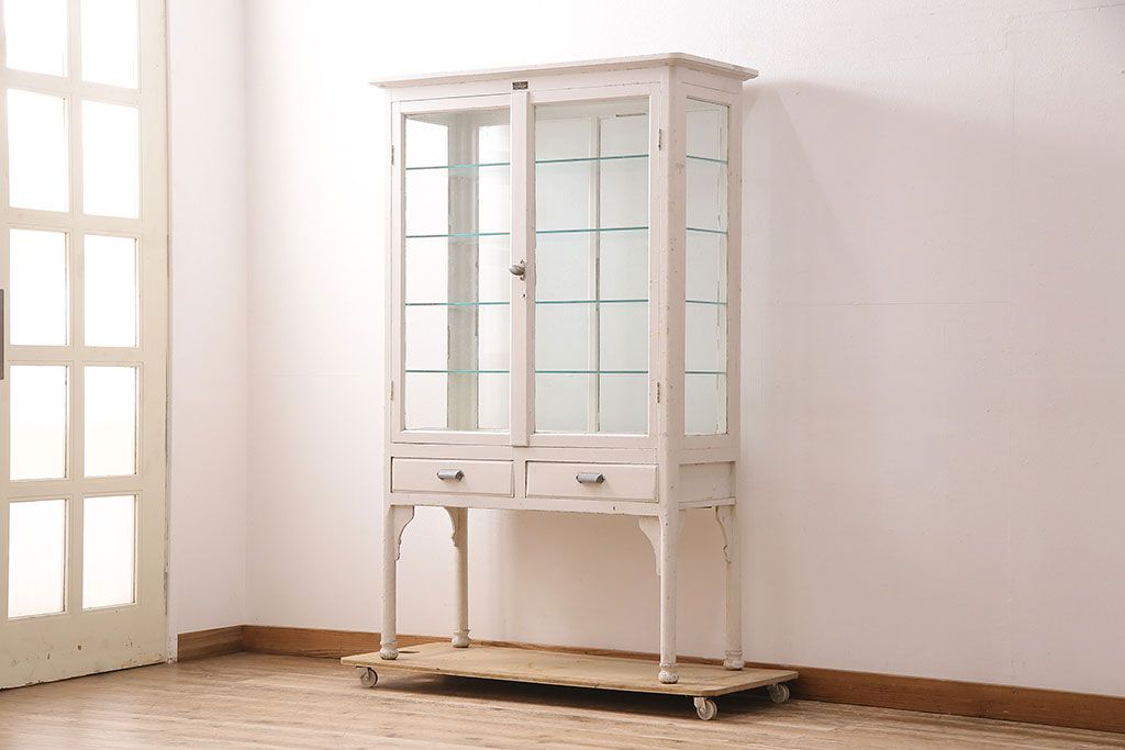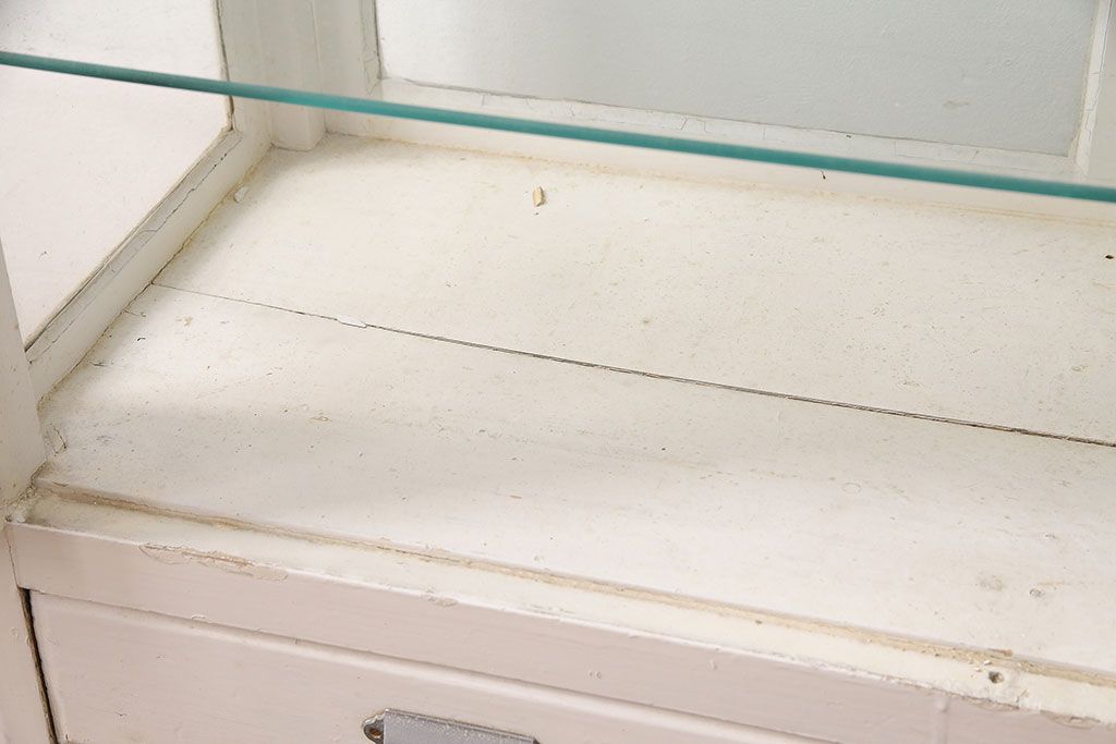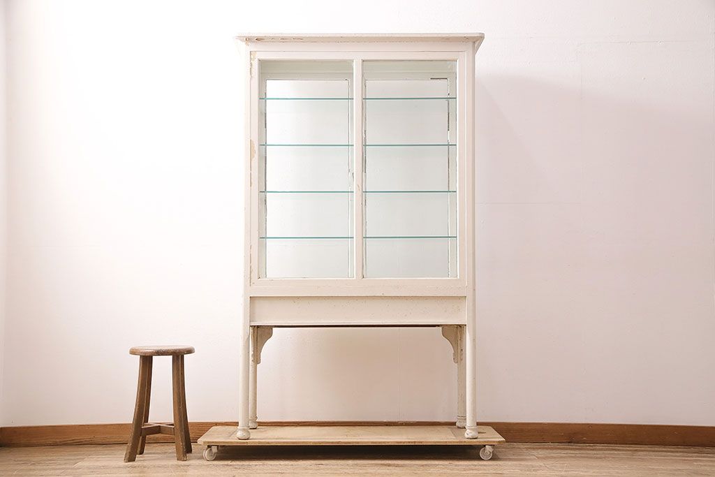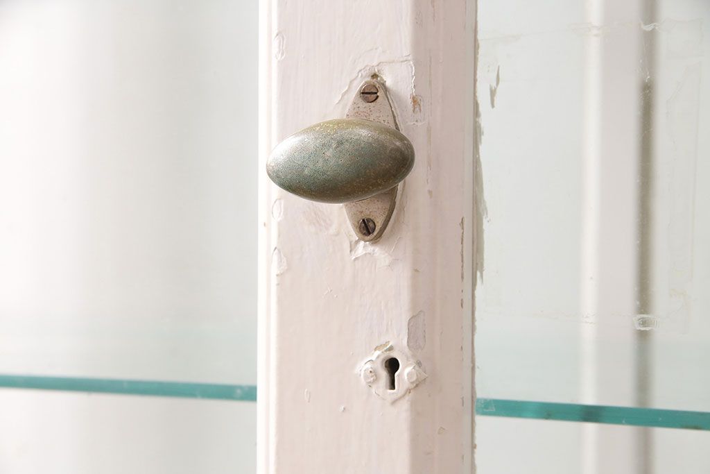 和製アンティーク 4面ガラス シャビーな風合いのペイントがお洒落なケビントキャビネット(ガラスケース、ショーケース、飾り棚)(R-049020)です。