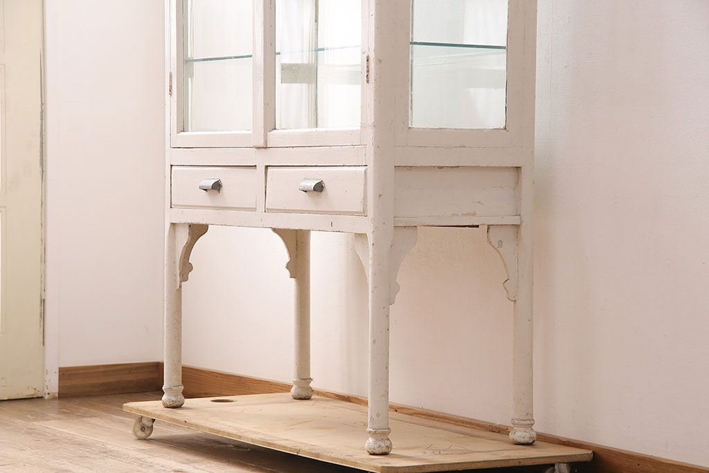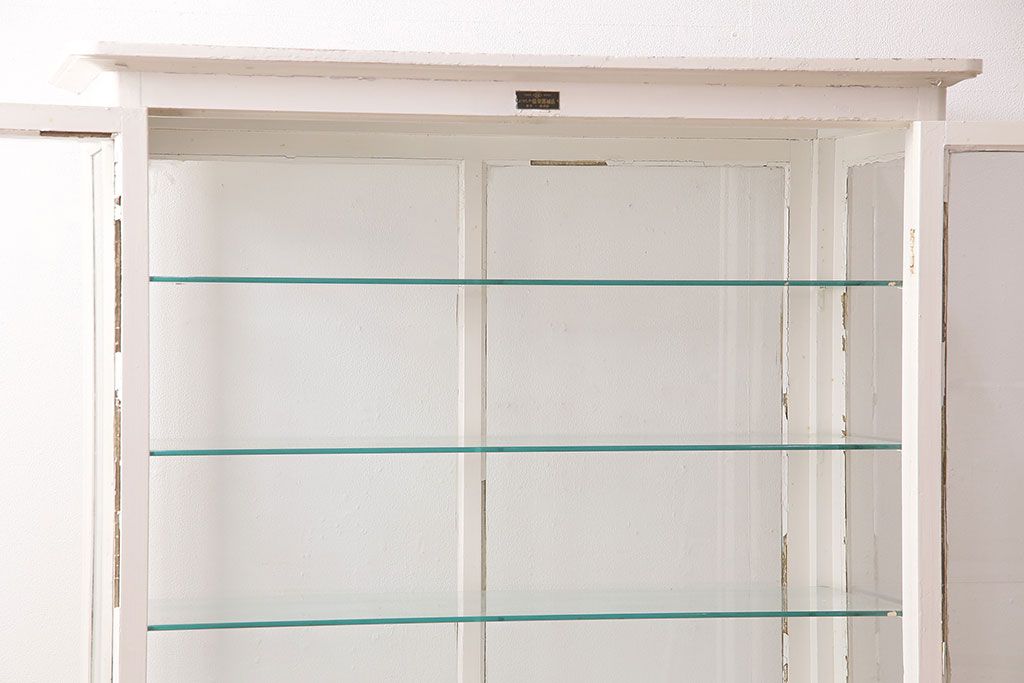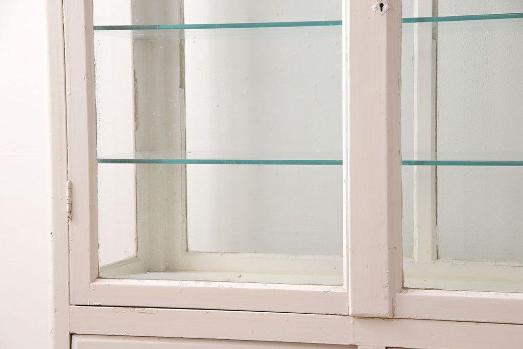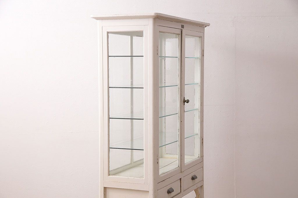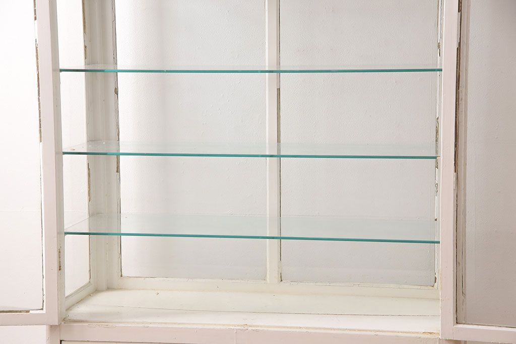 和製アンティーク 4面ガラス シャビーな風合いのペイントがお洒落なケビントキャビネット(ガラスケース、ショーケース、飾り棚)(R-049020)