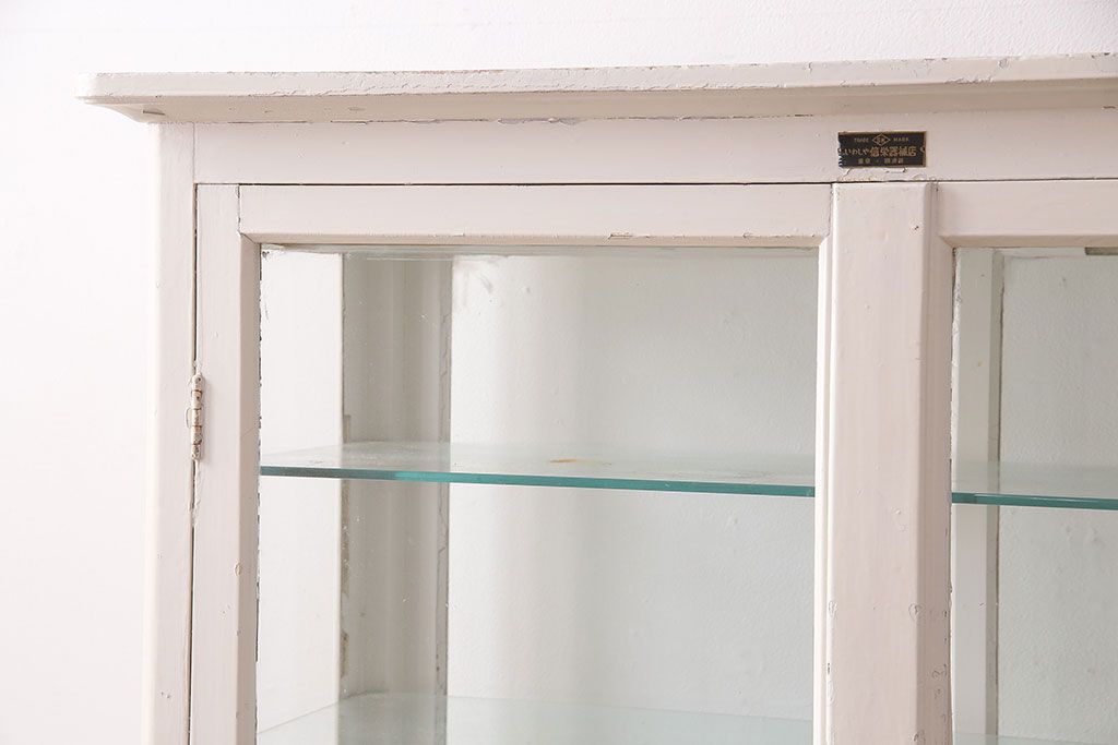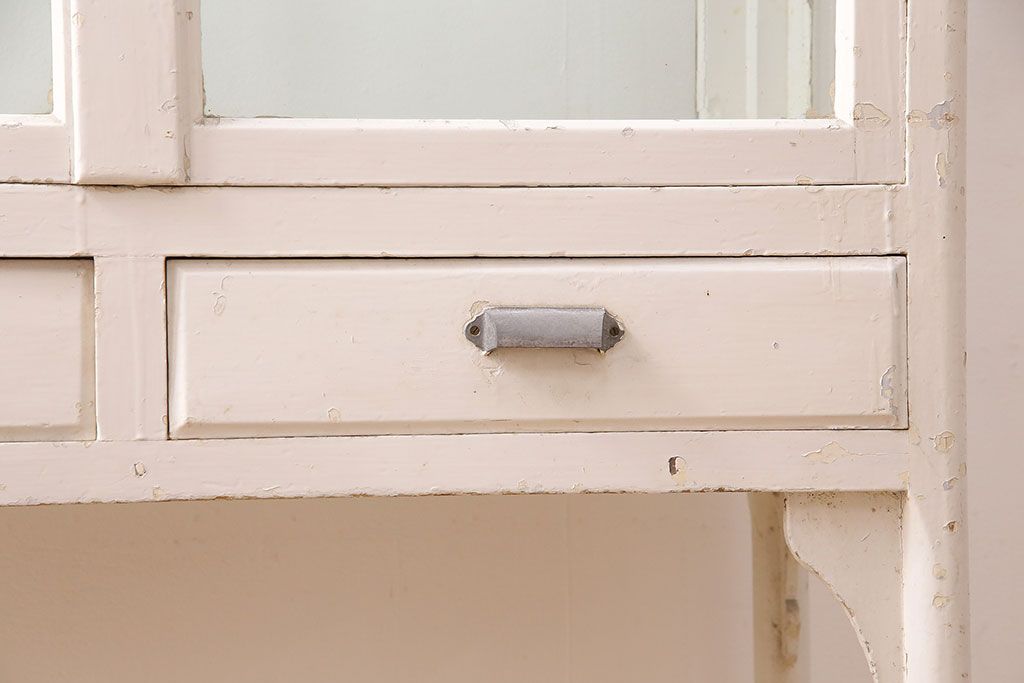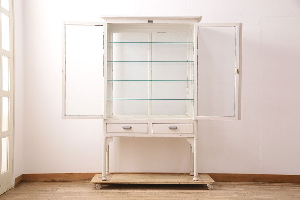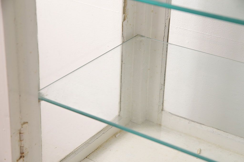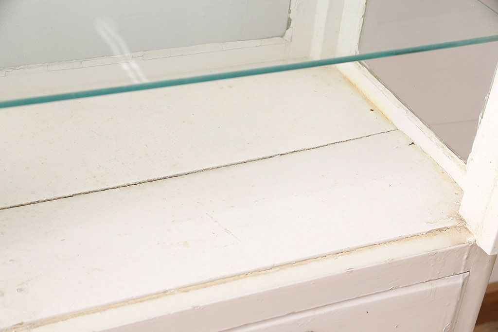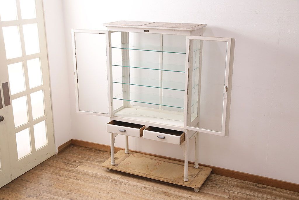 和製アンティーク 4面ガラス シャビーな風合いのペイントがお洒落なケビントキャビネット(ガラスケース、ショーケース、飾り棚)(R-049020)